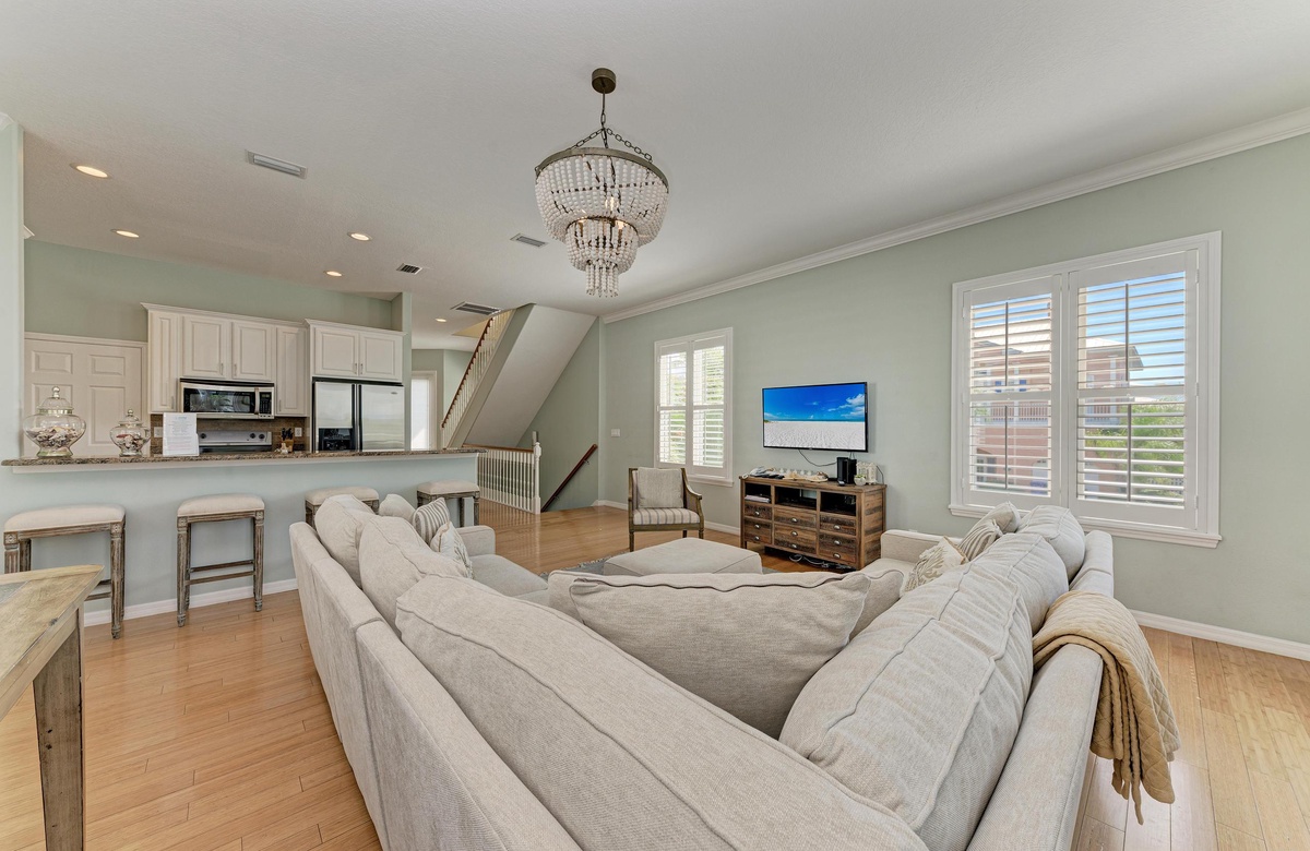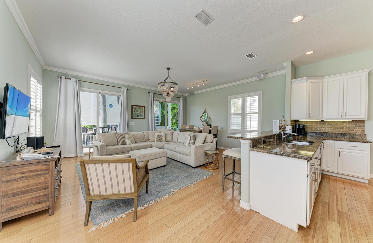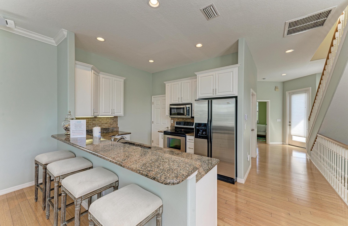 In der Küche finden Sie exklusive Arbeitsplatten sowie Edelstahlgeräte, einem Geschirrspüler und eine Frühstücksbar mit Sitzgelegenheit für vier. Im Esszimmer finden 6 Personen Platz. Das Wohnzimmer bietet bequeme Sitzgelegenheiten und einen Smart-Flachbild-TV. Das Haus ist zusätzlich mit Alexa ausgestattet, d.h. alle Antworten auf eventuelle Fragen sind schnell und einfach verfügbar! Alle drei Schlafzimmer haben ebenfalls Smart-Flachbild-TVs mit dem Streamingdienst HULU.
