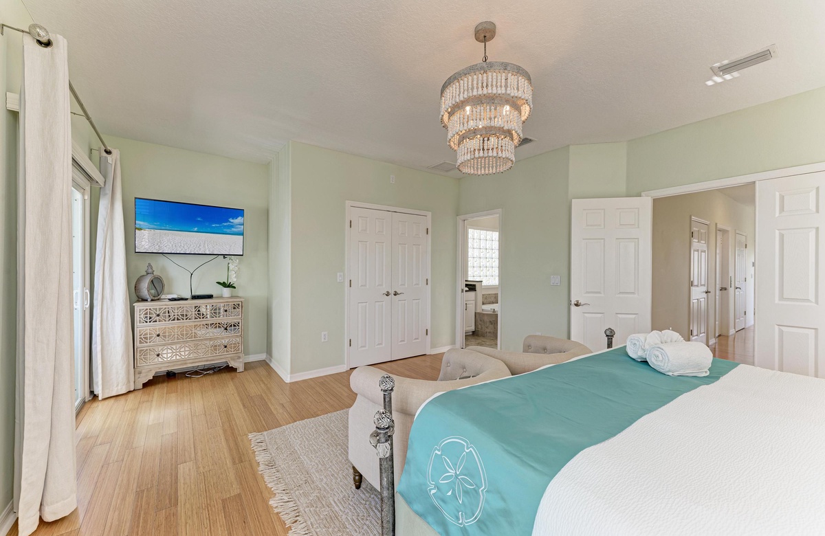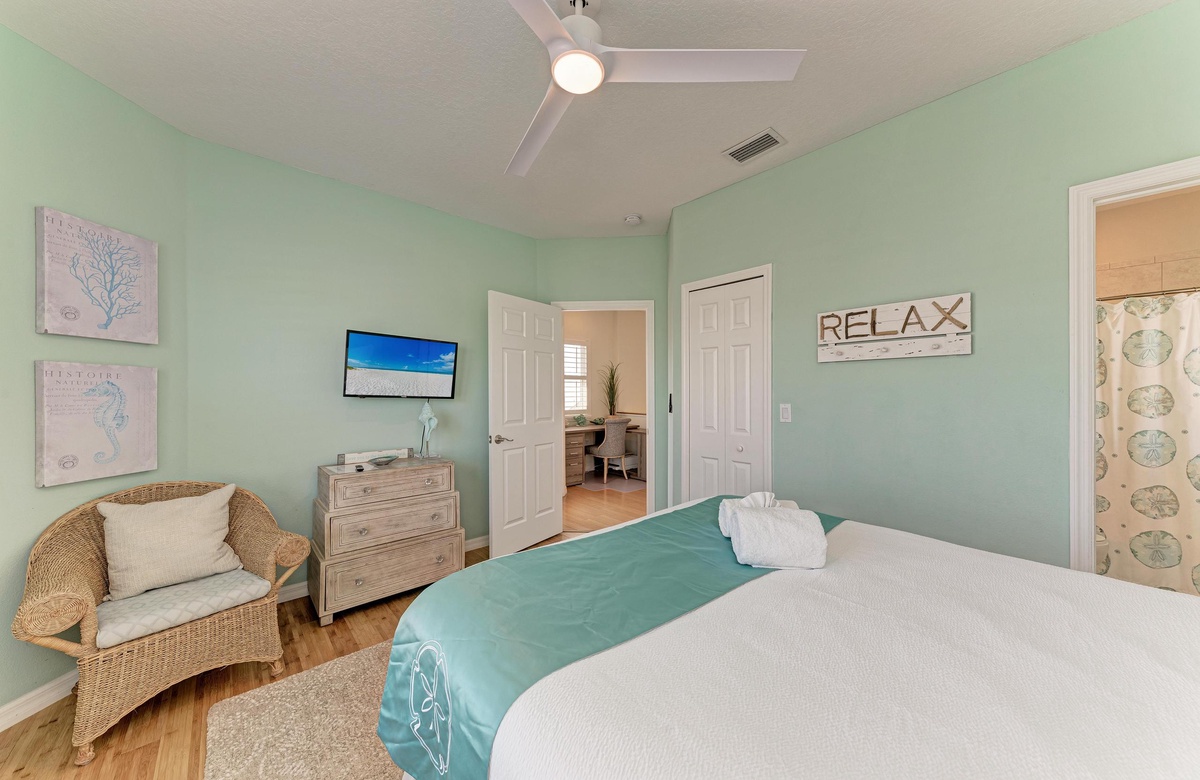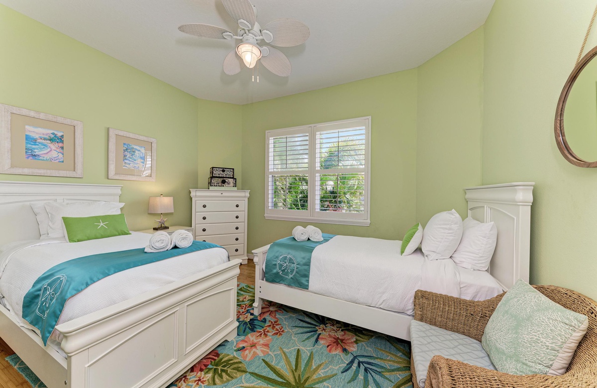 Zurück im Innenbereich finden Sie drei bequeme Schlafzimmer mit zwei großen Doppelbetten (King) und zwei Einzelbetten. Es gibt zwei Hauptschlafzimmer auf gegenüberliegenden Seiten des Hauses; beide mit eigenen Bädern, Smart-TVs mit HULU und Pool-Zugang. Die Hauptschlafzimmer haben begehbare Duschen. Das Gästezimmer bietet Einzelbetten und auch einen Smart-TV mit HULU. Es gibt ein drittes voll ausgestattetes Bad in der Nähe des Wohnzimmers mit einer Badewannen-/Duschkombination.