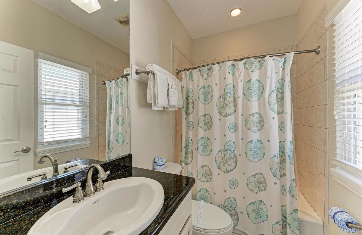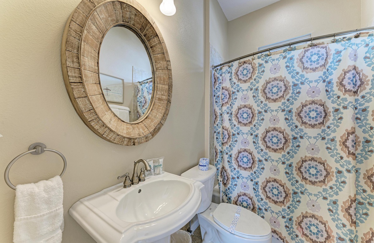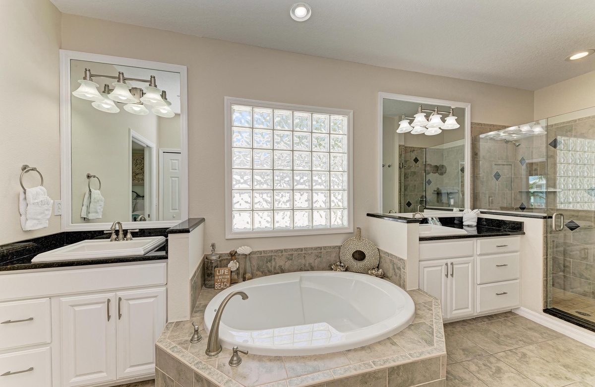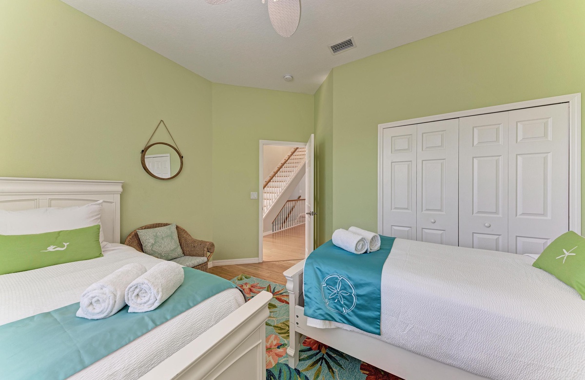 Zurück im Innenbereich finden Sie drei bequeme Schlafzimmer mit zwei großen Doppelbetten (King) und zwei Einzelbetten. Es gibt zwei Hauptschlafzimmer auf gegenüberliegenden Seiten des Hauses; beide mit eigenen Bädern, Smart-TVs mit HULU und Pool-Zugang. Die Hauptschlafzimmer haben begehbare Duschen. Das Gästezimmer bietet Einzelbetten und auch einen Smart-TV mit HULU. Es gibt ein drittes voll ausgestattetes Bad in der Nähe des Wohnzimmers mit einer Badewannen-/Duschkombination.