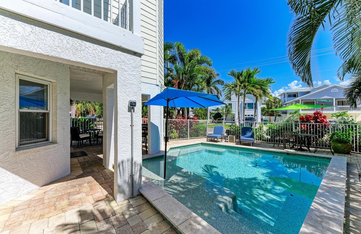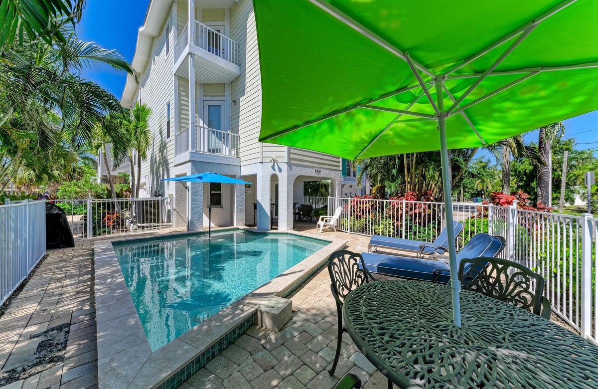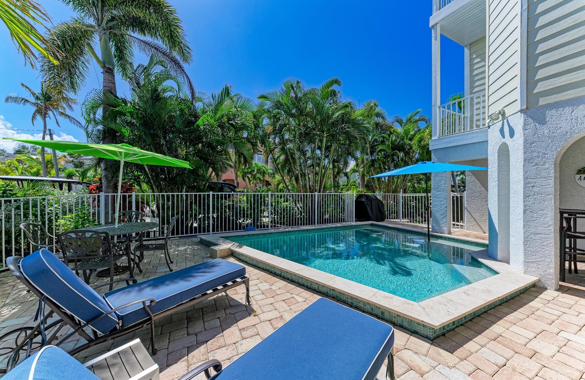 Vom Wohnzimmer aus gelangen Sie zum Garten- und Poolbereich, der sich zum Kanal hin ausrichtet. Dieses Anna Maria Island Ferienhaus verfügt über einen wunderschönen eingezäunten Garten mit beheiztem Pool, einen Gasgrill mit 5 Zonen und zusätzlicher Searing-Zone sowie einem Essbereich außen, einem 50 Fuß Bootsanleger ohne Bootslift und eine zweite Bootsanlegestelle mit 13.500 Pfund perfekt für ein 28 Fuß Boot. Der Bootsanleger hat zudem Strom und Wasser. An der Poollandschaft kann man das Outdoor-Leben perfekt genießen.