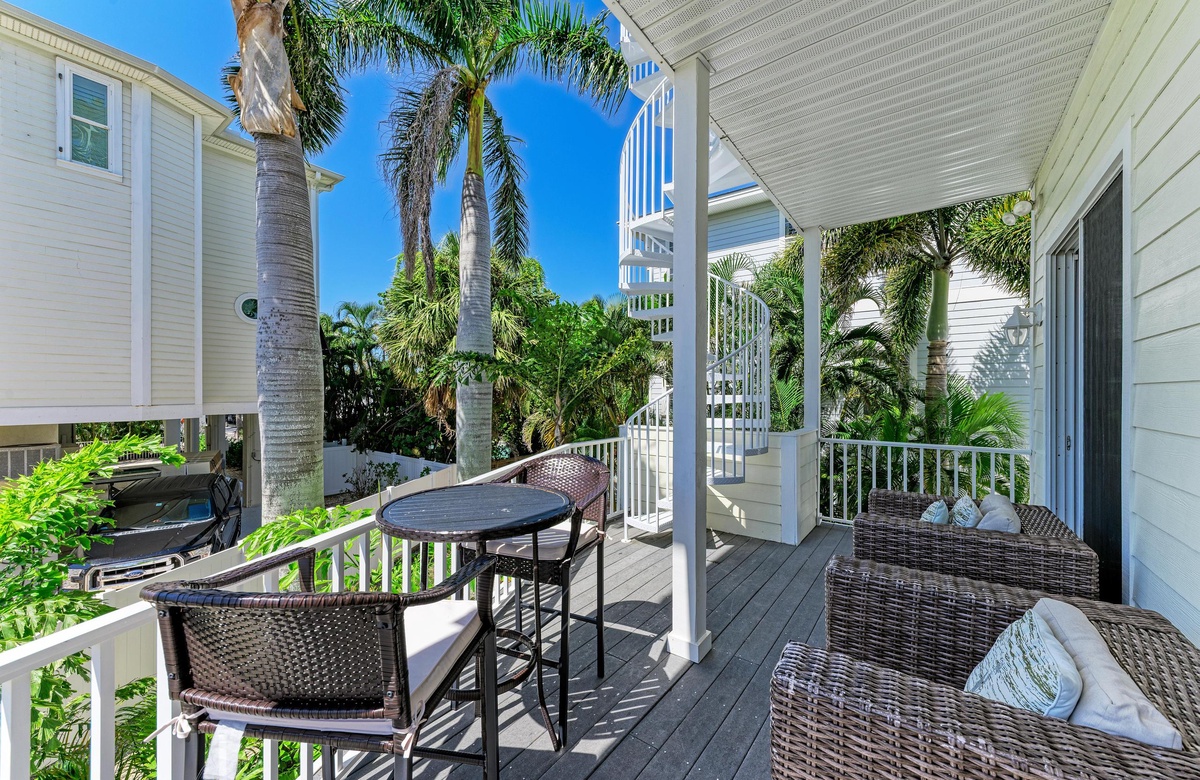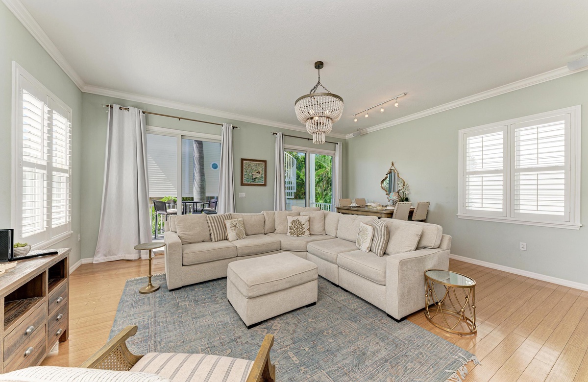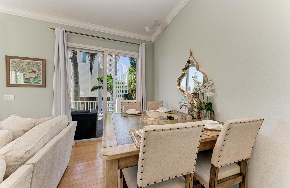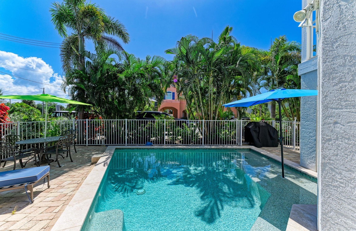 Vom Wohnzimmer aus gelangen Sie zum Garten- und Poolbereich, der sich zum Kanal hin ausrichtet. Dieses Anna Maria Island Ferienhaus verfügt über einen wunderschönen eingezäunten Garten mit beheiztem Pool, einen Gasgrill mit 5 Zonen und zusätzlicher Searing-Zone sowie einem Essbereich außen, einem 50 Fuß Bootsanleger ohne Bootslift und eine zweite Bootsanlegestelle mit 13.500 Pfund perfekt für ein 28 Fuß Boot. Der Bootsanleger hat zudem Strom und Wasser. An der Poollandschaft kann man das Outdoor-Leben perfekt genießen.