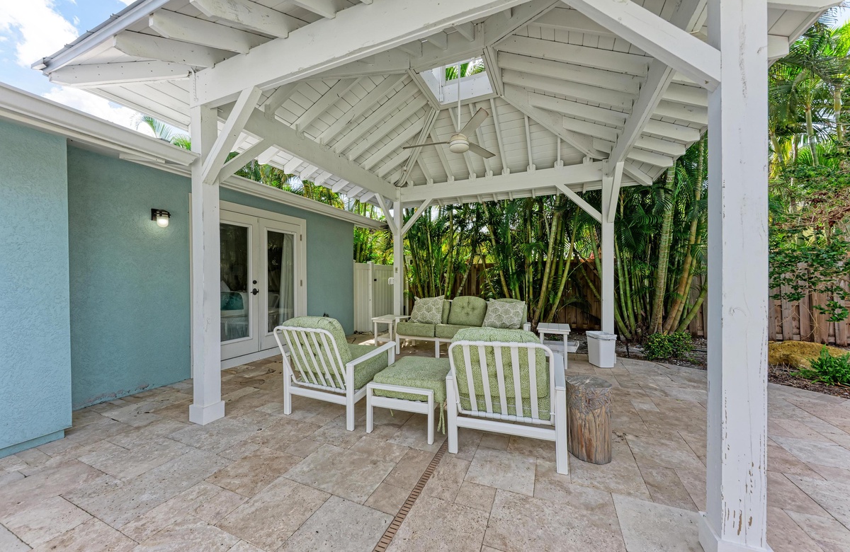 Lovely outdoor eating area as well as lounge area to relax in shade under outdoor fan whilst others are in pool.