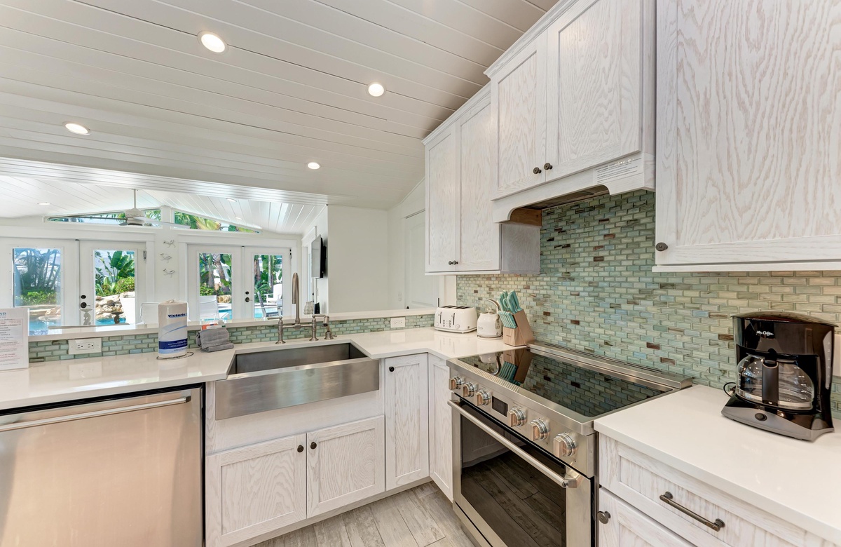 Der beeindruckende rückwärtige Garten verfügt über einen Muschelkies-Weg, der den tropischen Außenbereich verbindet: vom Esstisch unter dem Mangobaum, dem Grillbereich, der Außendusche zum Spa und Wasserfall und entlang zur bequemen Sitzecke unter dem Pavillon. Dieser grenzt an das Hauptschlafzimmer an und ist perfekt, um dort morgens seinen Kaffe einzunehmen. Die moderne Küche glänzt mit Maßeinbauschränken, schönen weißen Quarzarbeitsplatten, Edelstahlgeräten, Kitchenaid-Geräten und Geschirr. Alles was Sie benötigen, werden Sie hier vorfinden.