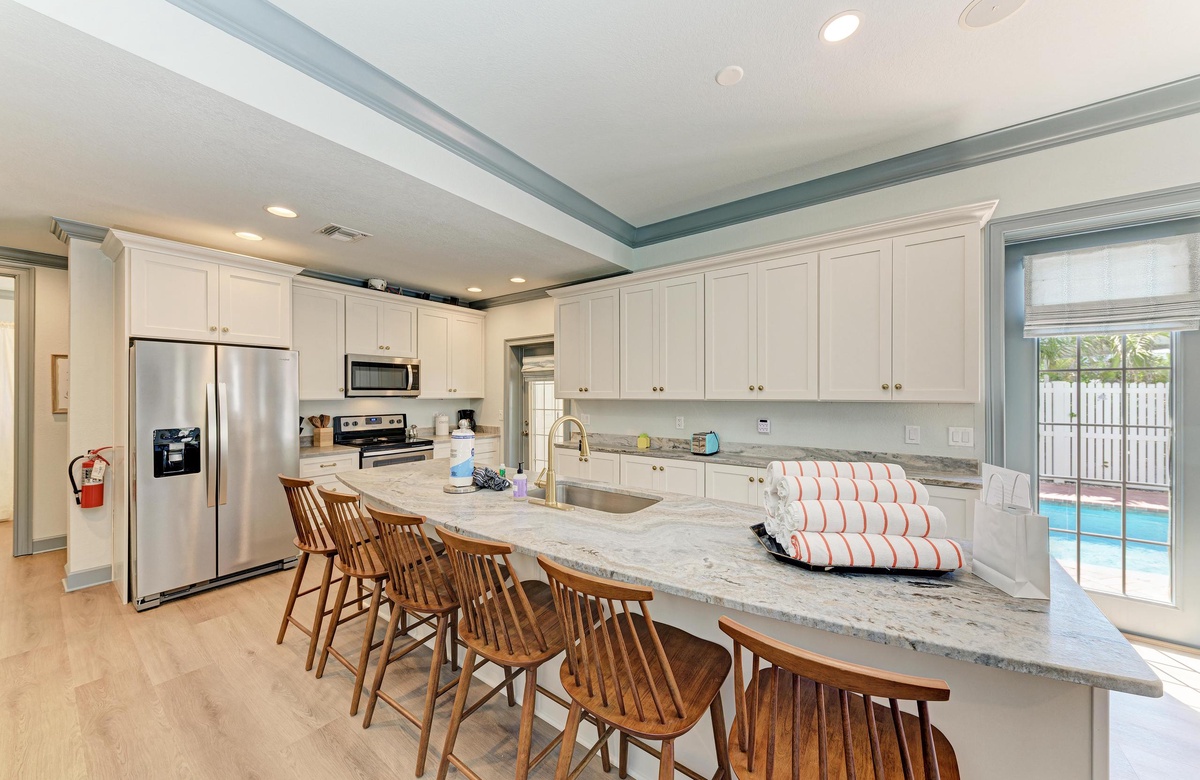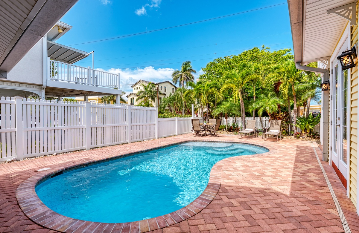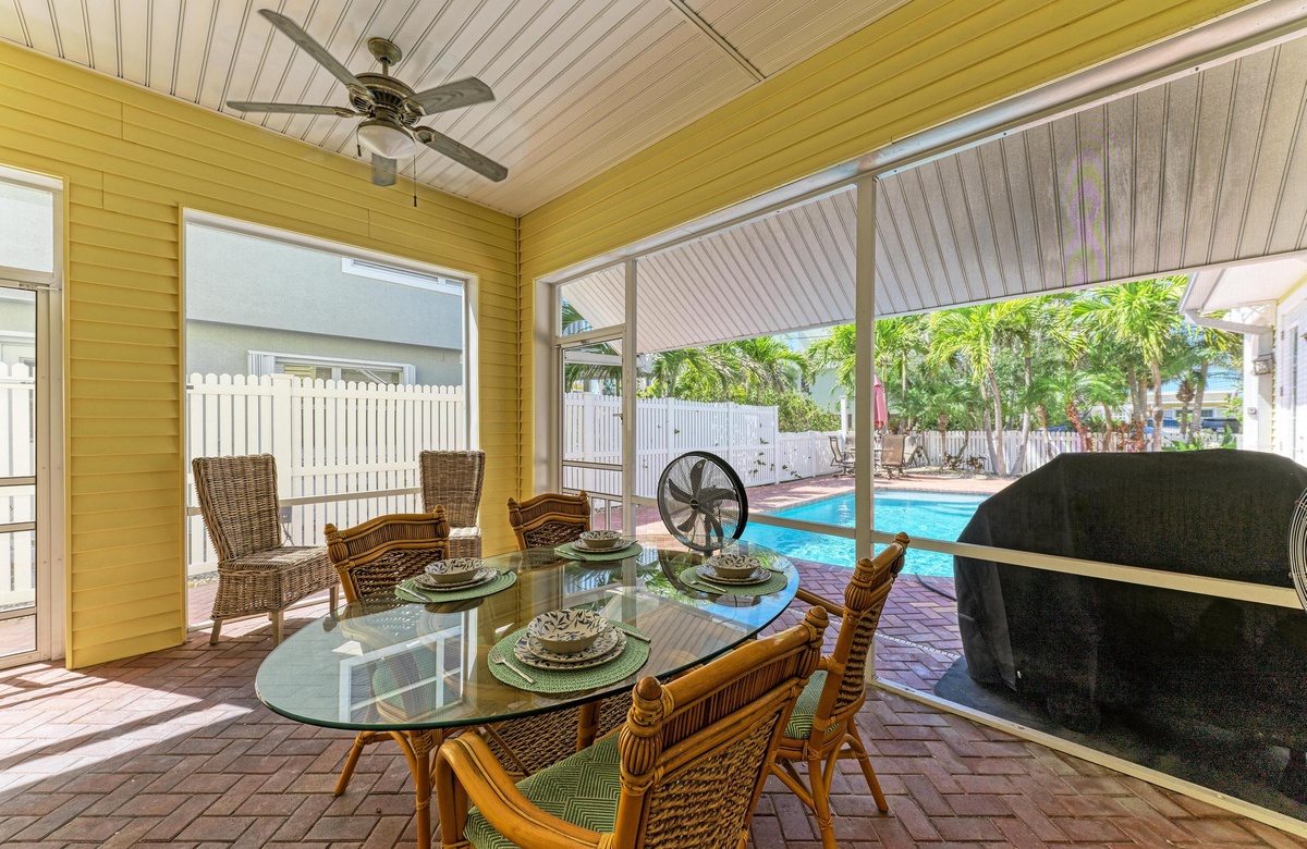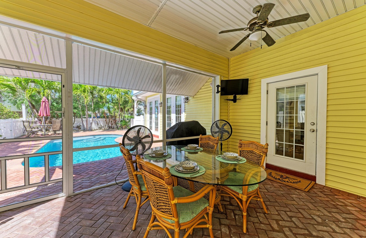 Treten Sie durch die Tür und Sie werden sich sofort wie zu Hause fühlen mit all den Möbeln und Dekorationen, die Sie sich nur wünschen können. Gemütliche Sitzecke, Esszimmertisch, Küchentheke mit Sitzmöglichkeiten, zudem werden Sie im großen Küchenbereich gerne gemeinsam essen und Ihre Lieblingsfilme anschauen. Das natürliche Licht in diesem Raum, wenn Sie die Jalousien öffnen, bietet Ihnen ein wahres Inselerlebnis! Durch die Flügeltüren aus dem Wohnzimmer, finden Sie Ihren privaten Pool mit Liegestühlen, eine Außendusche und einen Tisch für 4. Der Gasgrill und die durch ein Insektennetz geschützte Außenküche direkt neben dem Pool bieten den Gästen einen großartigen Unterhaltungsraum! Dieser geschützte Bereich verfügt über einen weiteren Tisch für 4 Personen, eine Spüle und Theke sowie einen kleinen Flachbildfernseher. Auf der Rückseite des Hauses gibt es eine kleine Feuerstelle!