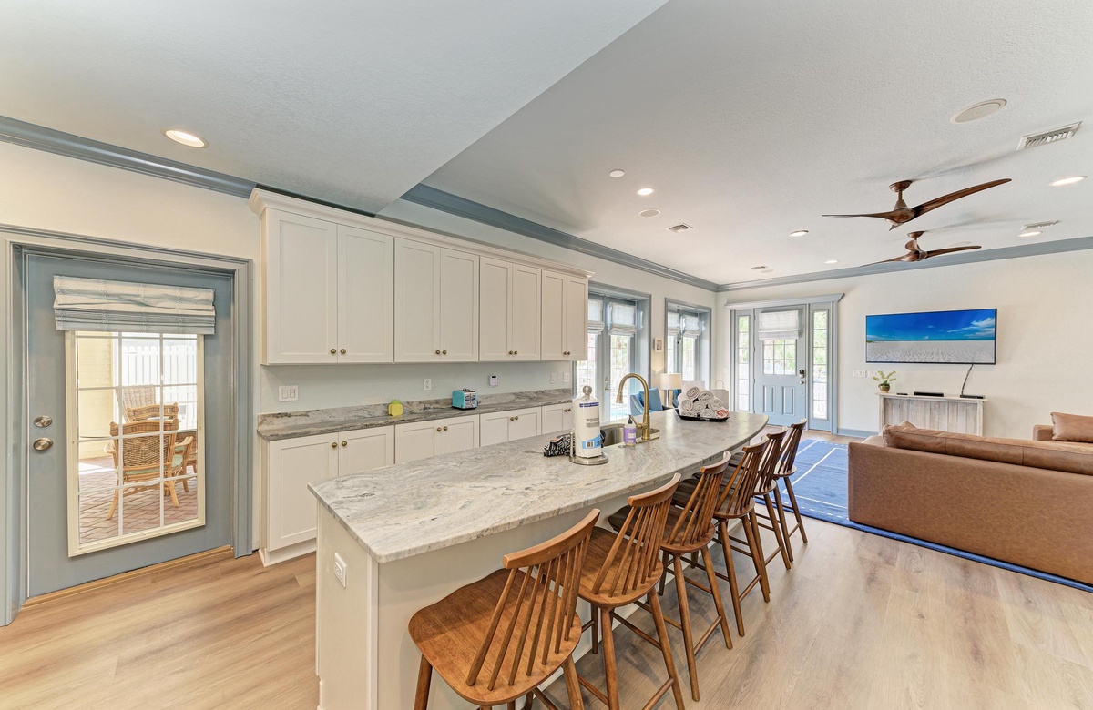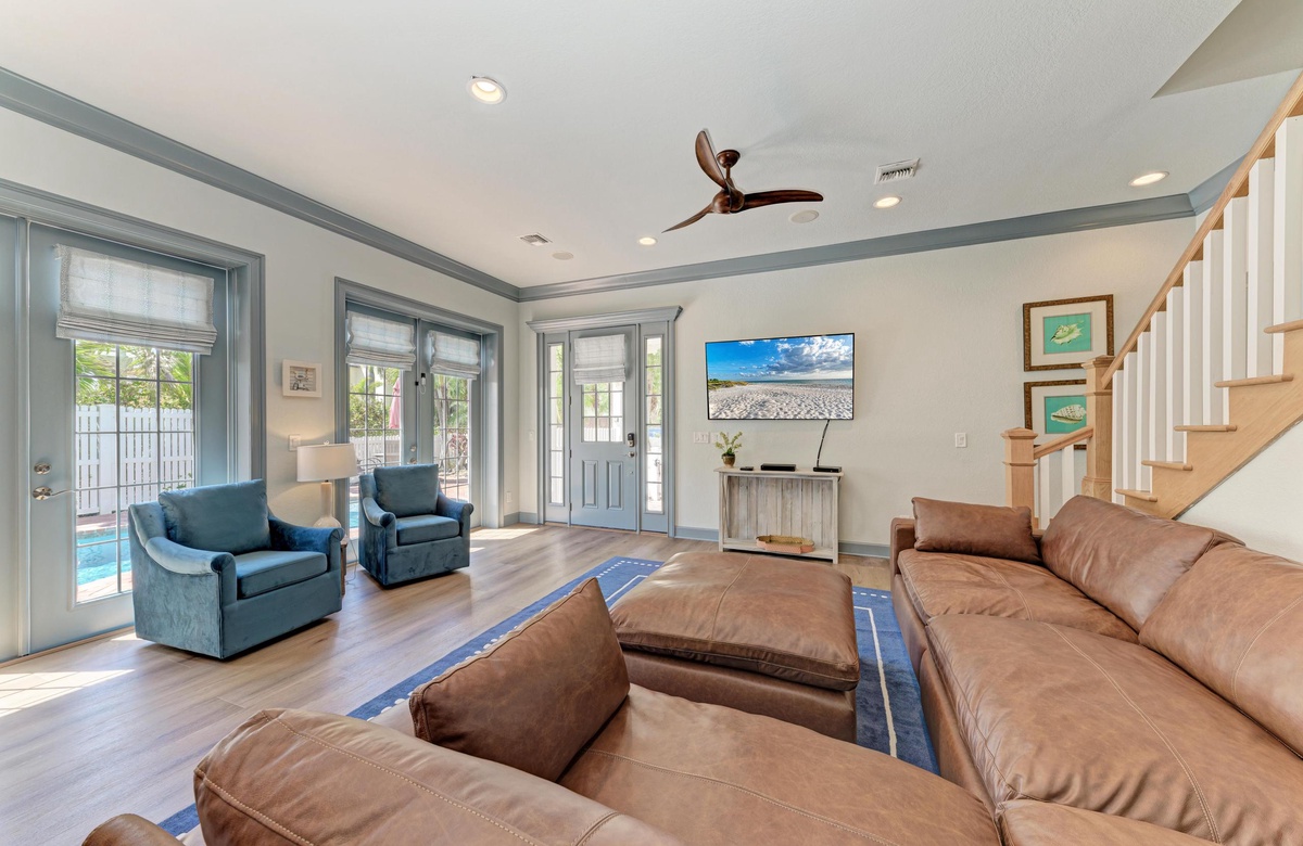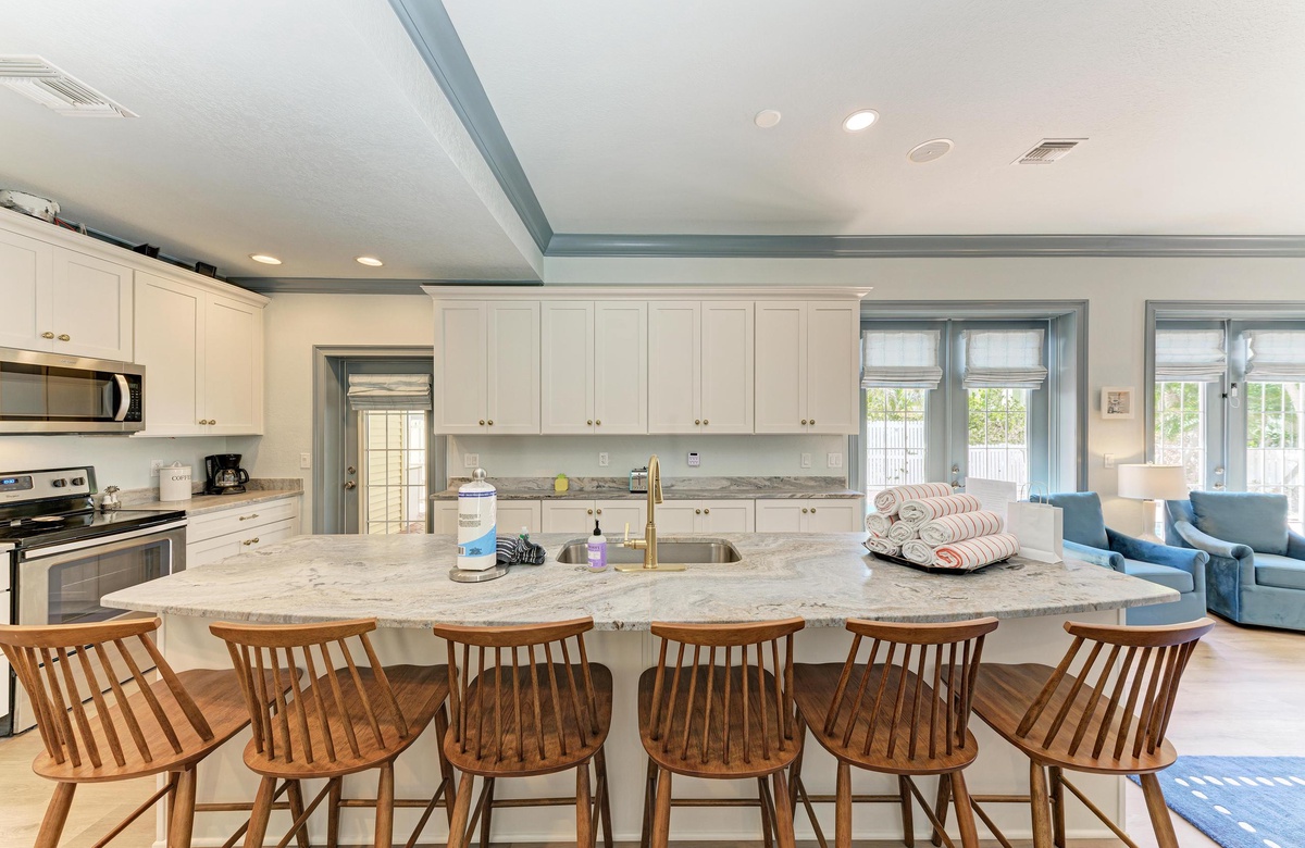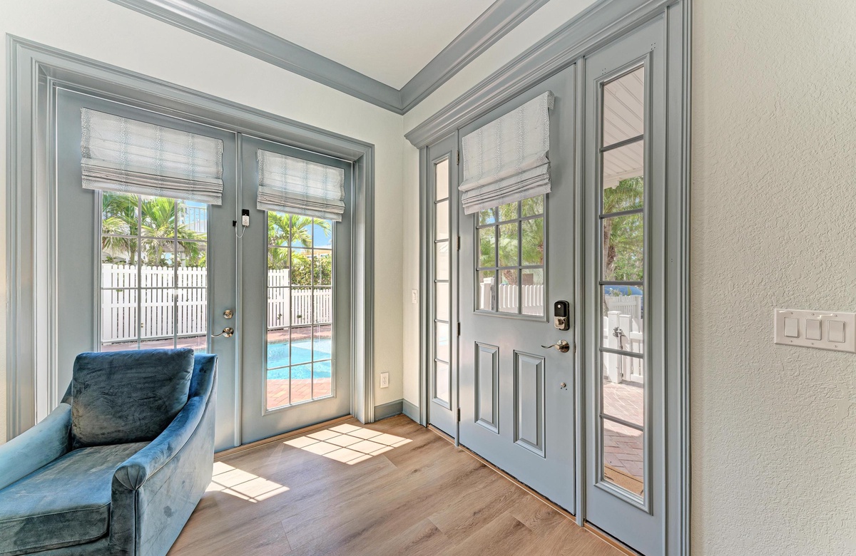 Treten Sie durch die Tür und Sie werden sich sofort wie zu Hause fühlen mit all den Möbeln und Dekorationen, die Sie sich nur wünschen können. Gemütliche Sitzecke, Esszimmertisch, Küchentheke mit Sitzmöglichkeiten, zudem werden Sie im großen Küchenbereich gerne gemeinsam essen und Ihre Lieblingsfilme anschauen. Das natürliche Licht in diesem Raum, wenn Sie die Jalousien öffnen, bietet Ihnen ein wahres Inselerlebnis! Durch die Flügeltüren aus dem Wohnzimmer, finden Sie Ihren privaten Pool mit Liegestühlen, eine Außendusche und einen Tisch für 4. Der Gasgrill und die durch ein Insektennetz geschützte Außenküche direkt neben dem Pool bieten den Gästen einen großartigen Unterhaltungsraum! Dieser geschützte Bereich verfügt über einen weiteren Tisch für 4 Personen, eine Spüle und Theke sowie einen kleinen Flachbildfernseher. Auf der Rückseite des Hauses gibt es eine kleine Feuerstelle!