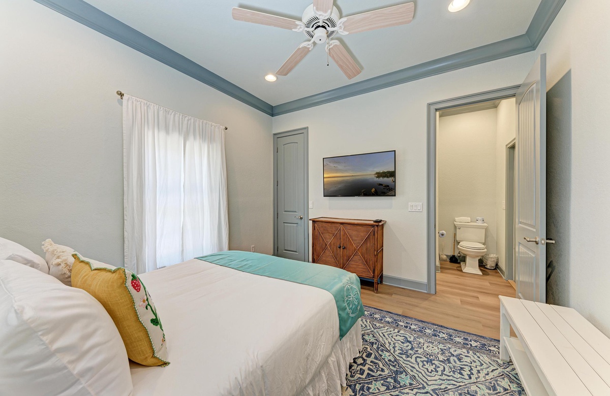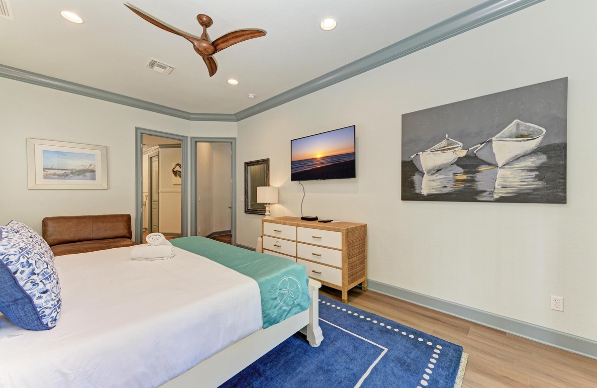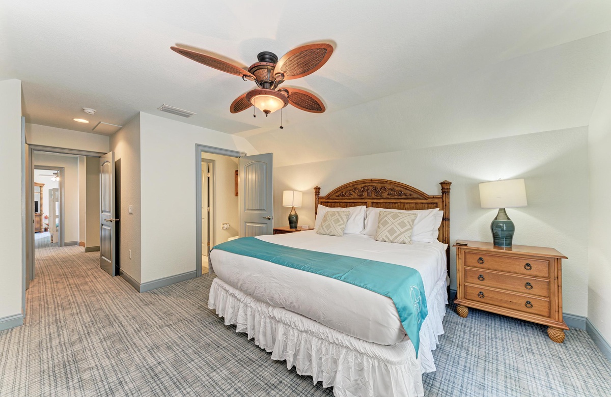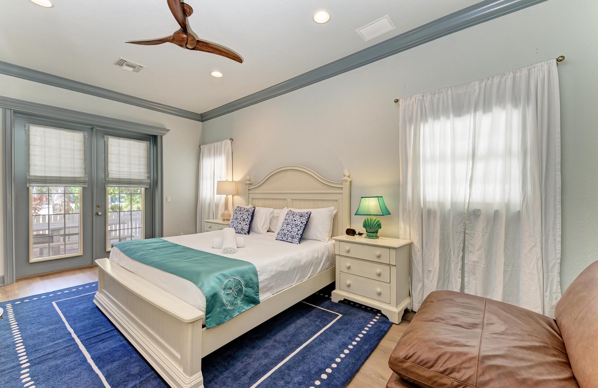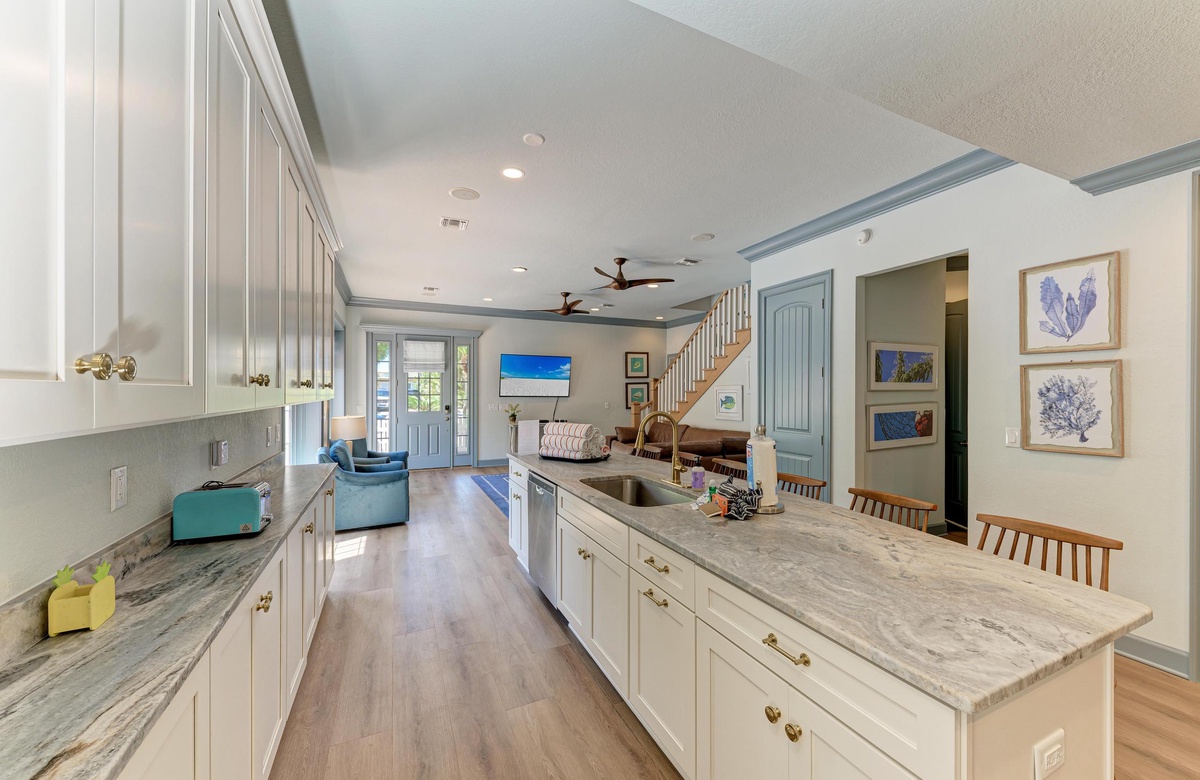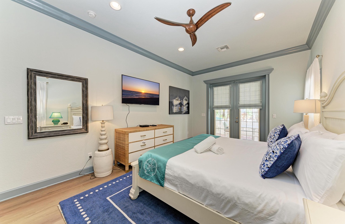 Im unteren Bereich dieses Hauses befindet sich das übergroße Hauptschlafzimmer und Bad mit einem großen begehbaren Kleiderschrank, sowie zwei weitere Schlafzimmer mit jeweils eigenem Kingsize-Bett und 2 Bäder. Aus dem Hauptschlafzimmer geht es durch französische Türen zur Veranda. Die Waschmaschine und der Trockner befinden sich ebenfalls im Erdgeschoss neben der Küche, so dass das Wäschewaschen ein Kinderspiel ist! Die Küche bietet den Gästen alle Annehmlichkeiten, die sie brauchen, um sich zu Hause zu führen, einschließlich Edelstahlgeräten und Granit-Arbeitsplatte.