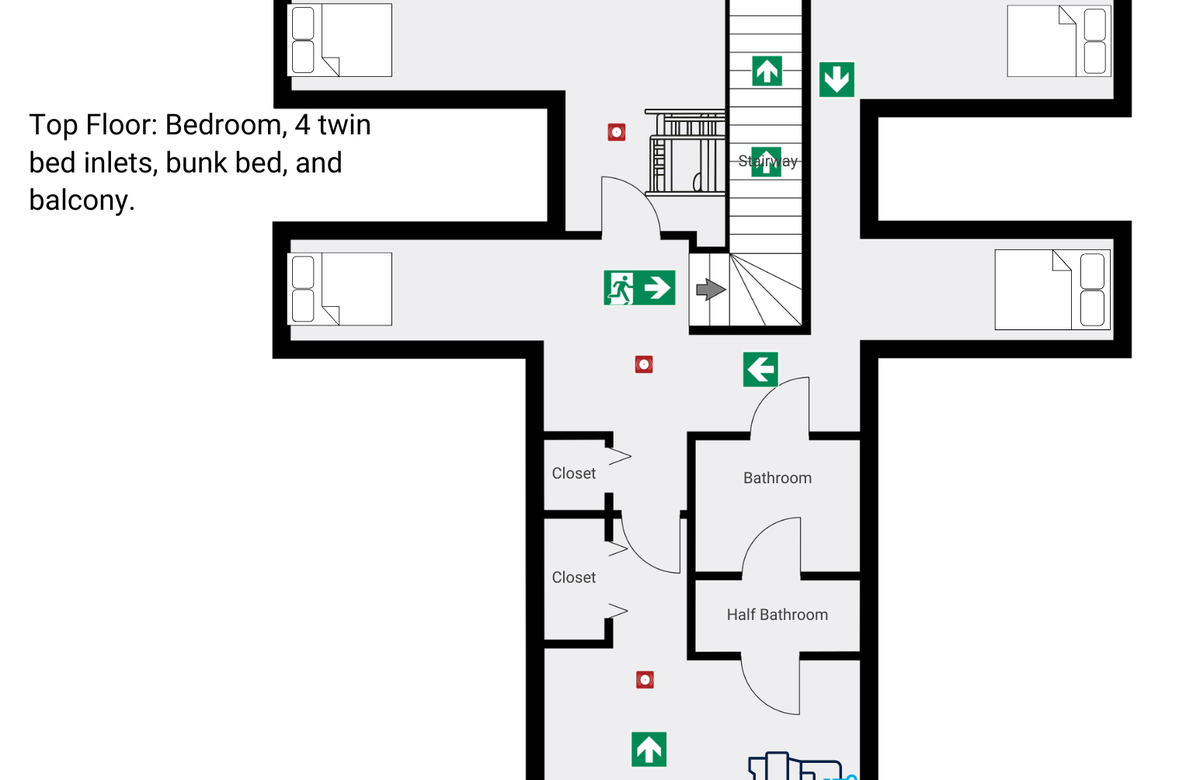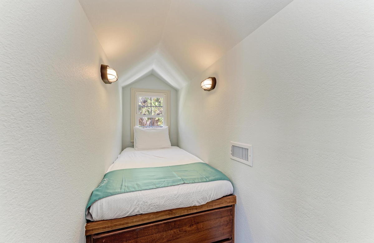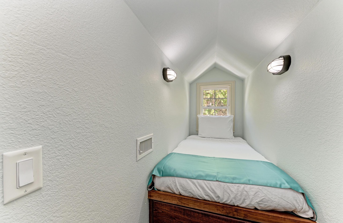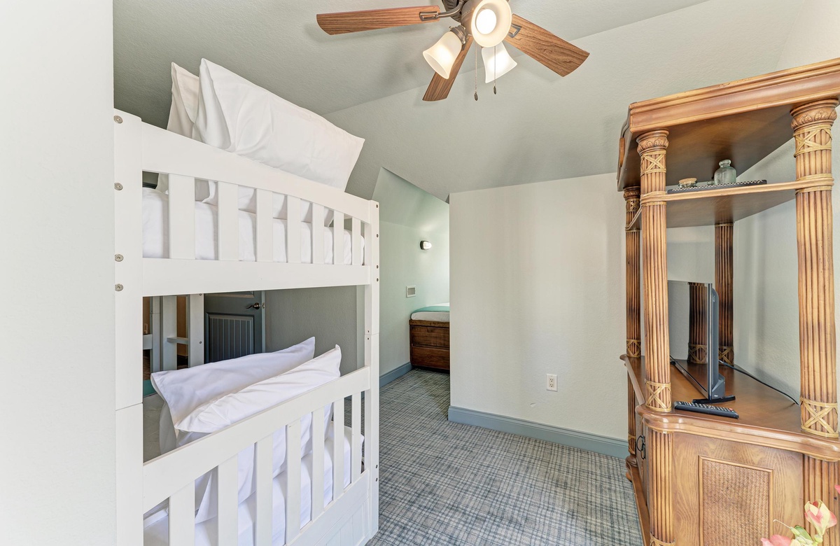 Im Obergeschoss finden Sie zwei Schlafzimmer und ein Badezimmer. Das erste Schlafzimmer hat ein Stockbett und einen kleinen Flachbildfernseher. Es gibt einen Zugang zur Veranda im Obergeschoss - ein großartiger Ort, um sich zu entspannen und einen Blick auf den Sonnenuntergang zu erhaschen. Es gibt noch ein weiteres Schlafzimmer mit einem Kingsize-Bett und angeschlossenem Bad.