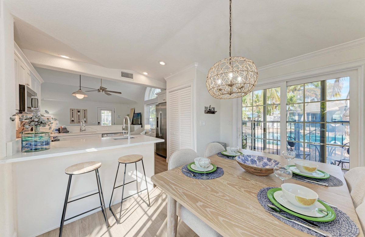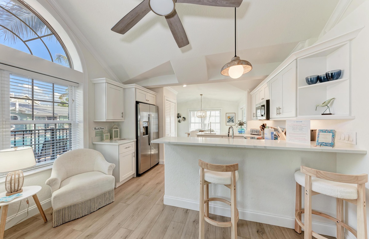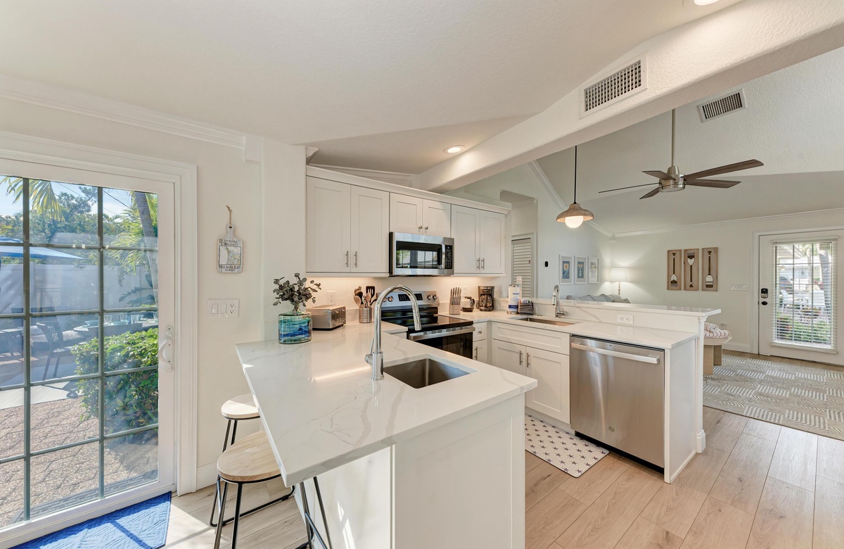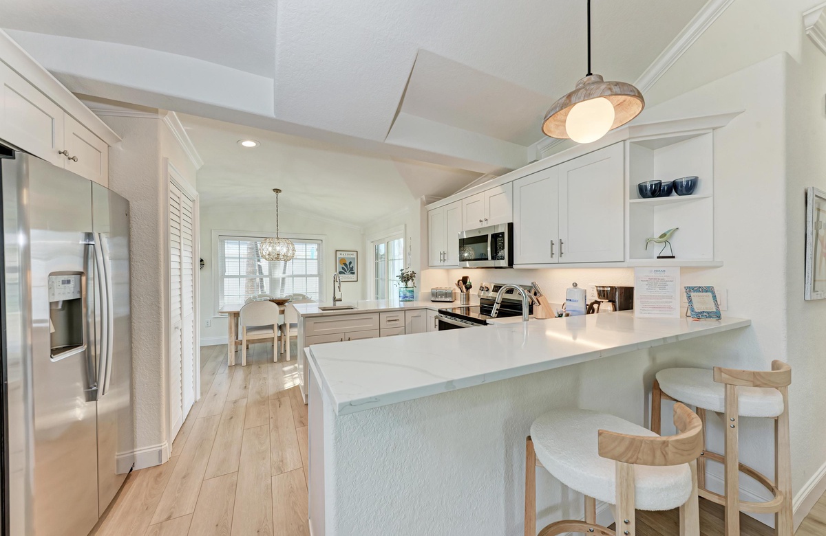 Die relativ modernisierte Küche bietet Granit-Arbeitsplatte, weiße Geräte und reichlich Platz für die Zubereitung von Mahlzeiten oder einfach nur um gemeinsam einen Drink zu genießen. Es gibt ausreichende Sitzgelegenheiten für Ihre gesamte Familie.