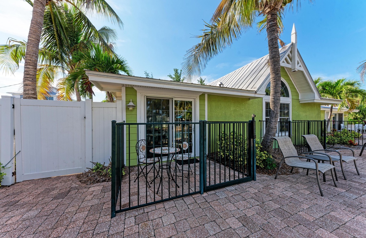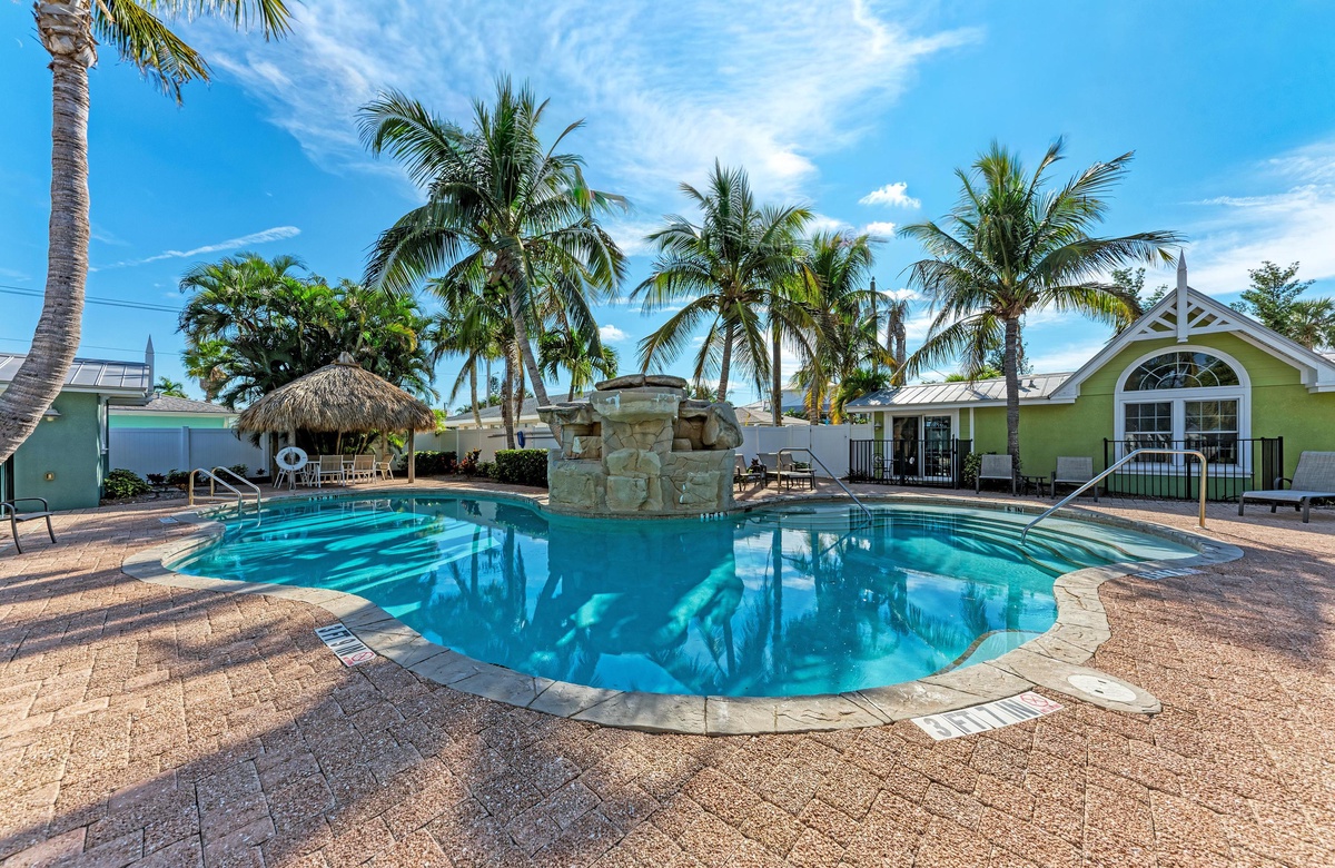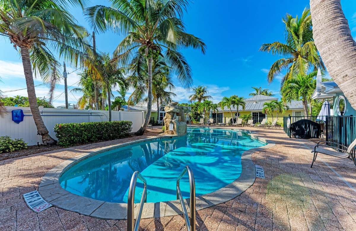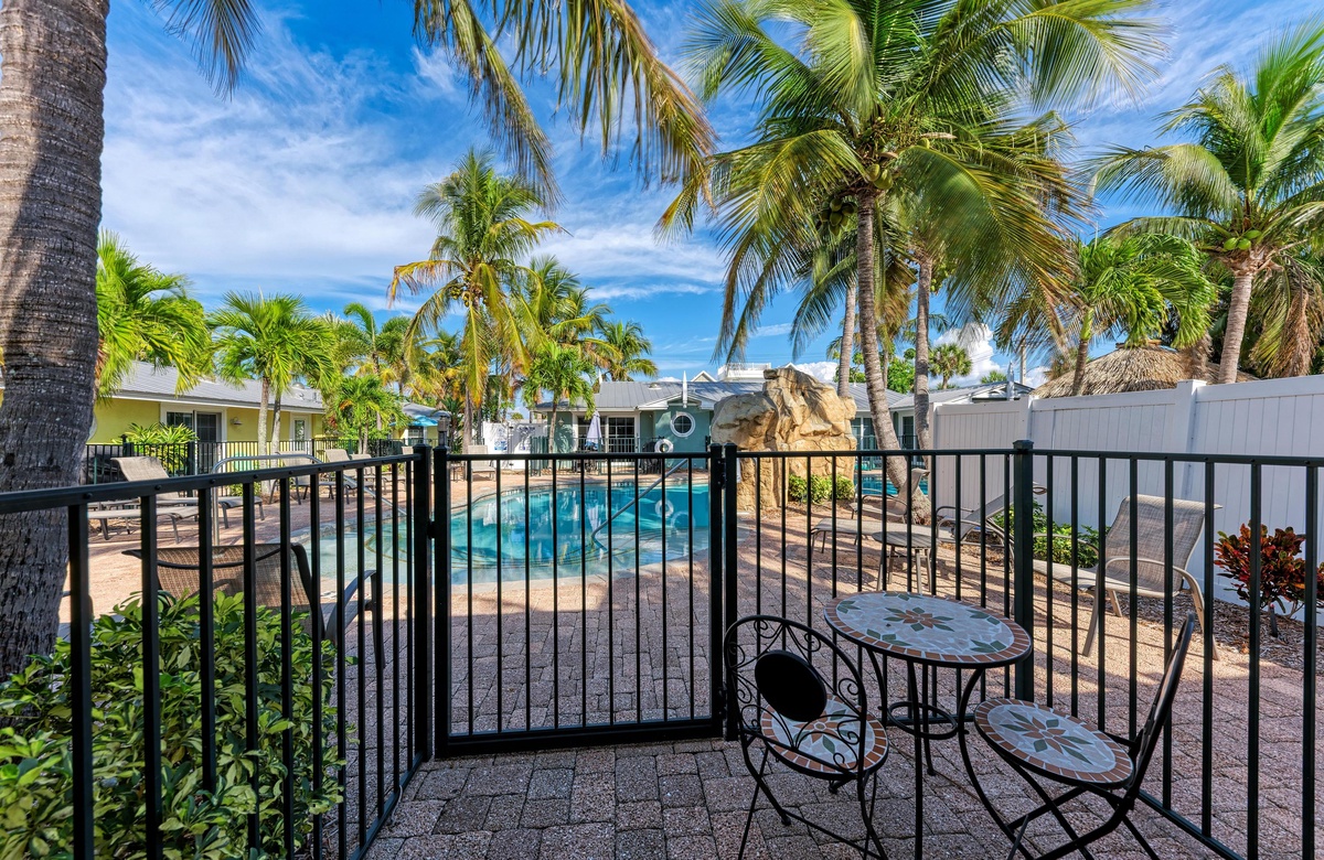 Zwei Schlafzimmer, zwei Bäder mit einem riesigen tropischen Pool und Wasserfall direkt bei Ihrem Hintereingang im Garten. NUR das Blue Lagoon Cottage hat ein separates Esszimmer sowie eine private, nach hinten gelegene Terrasse mit Esszimmergarnitur.