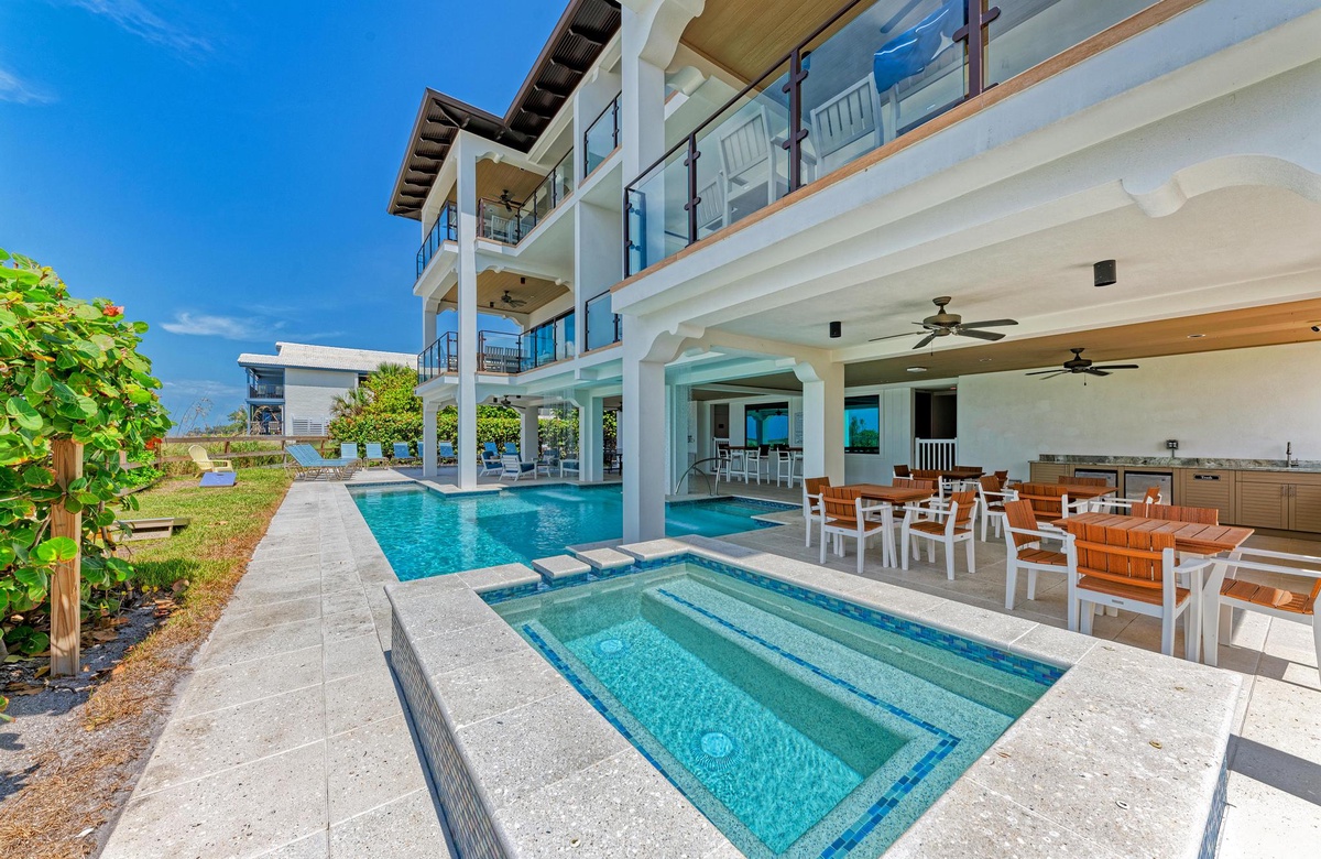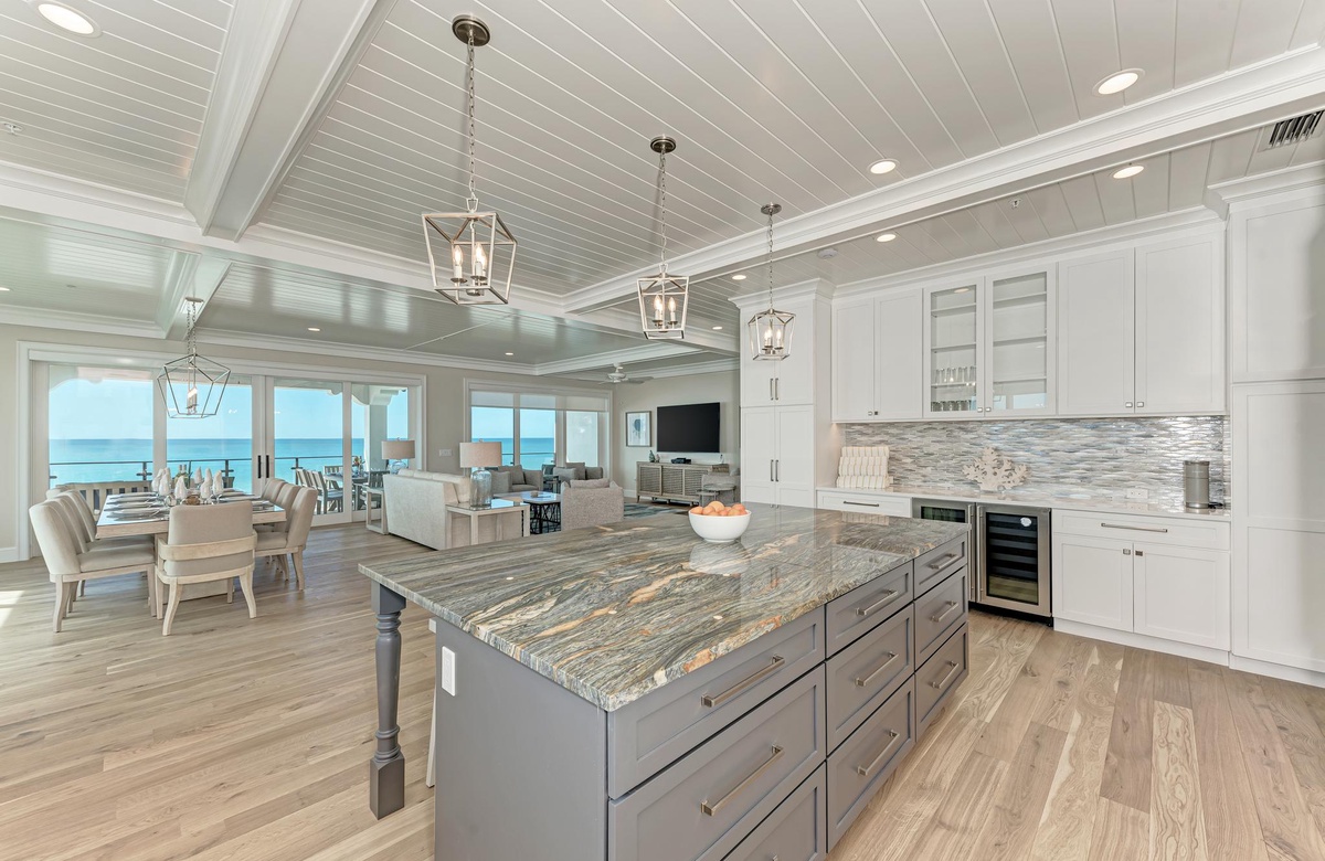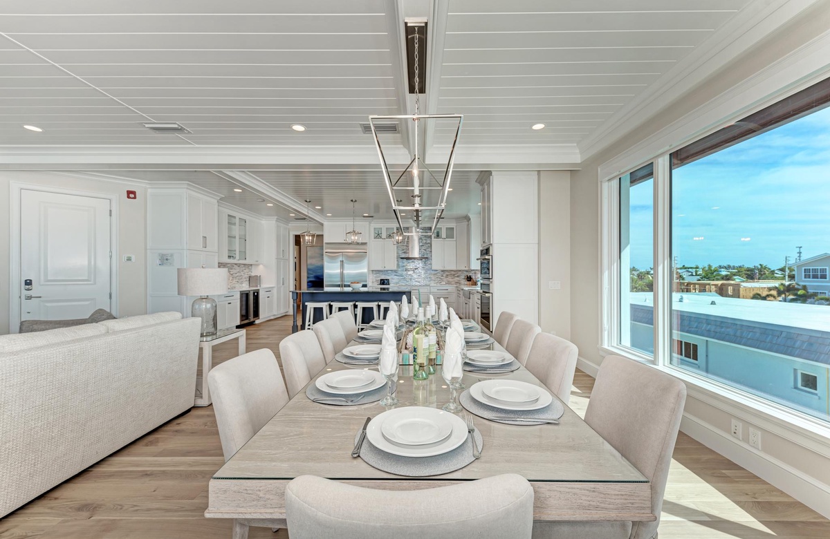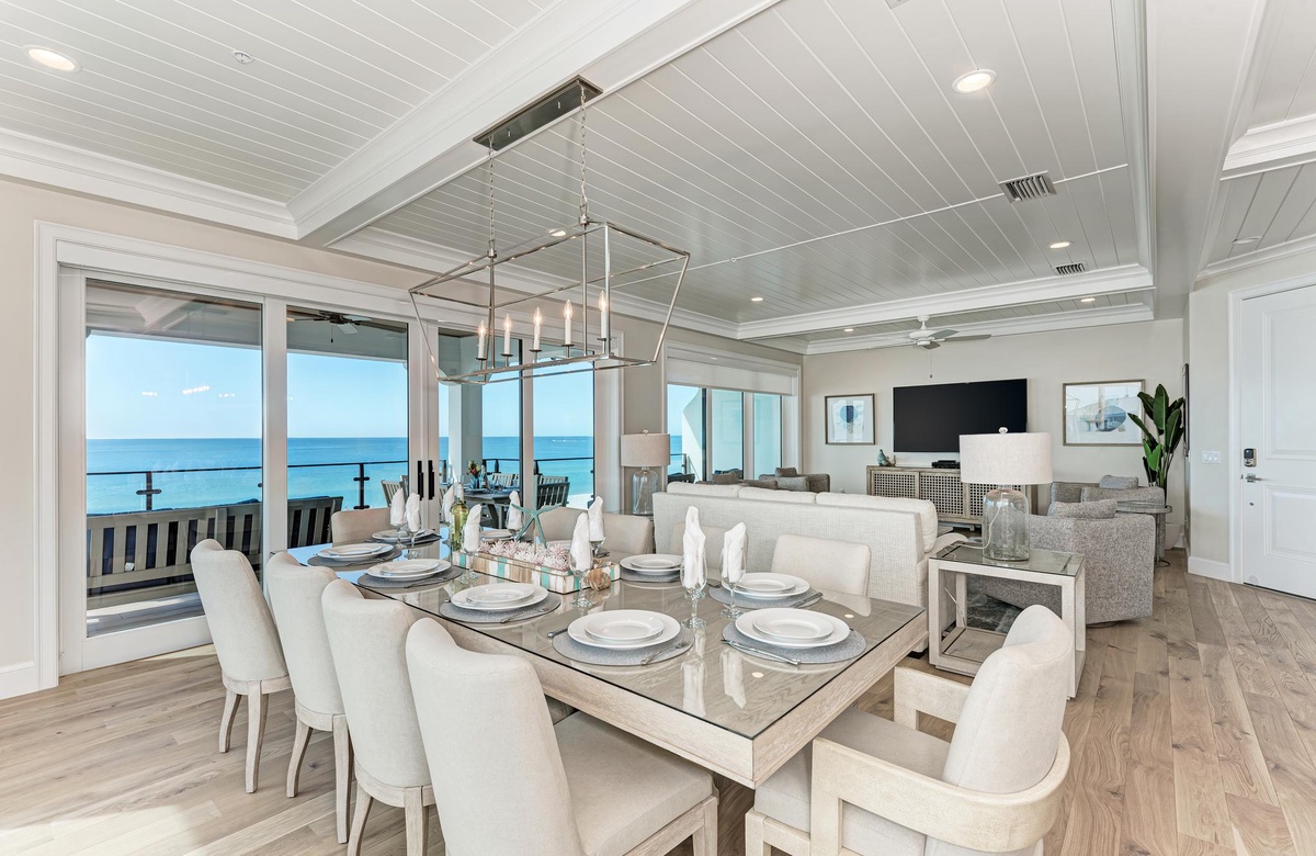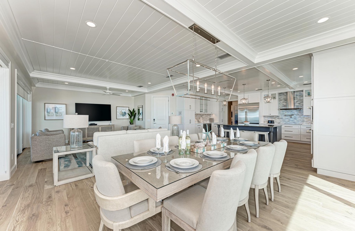 Die Küche bietet Edelstahlgeräte, inklusive Geschirrspülmaschine, Induktionsherd, Weinkühlschrank und einen gigantischen Esstisch für 10 Personen. Zusätzlich gibt es eine Frühstücksbar für Vier, um nur mal schnell eine Kleinigkeit zu sich zu nehmen. Der voll möblierte Außenbereich am Balkon lädt ebenso für ein Essen unter freiem Himmel ein. Vom Balkon aus sehen Sie den beheizbaren Gemeinschaftspool und Spa. Hier gibt es auch viele Aufenthaltsmöglichkeiten, um sich zu erholen. Große Fenster lassen das natürliche Licht herein, damit sich schnell das Florida-Gefühl einstellt.