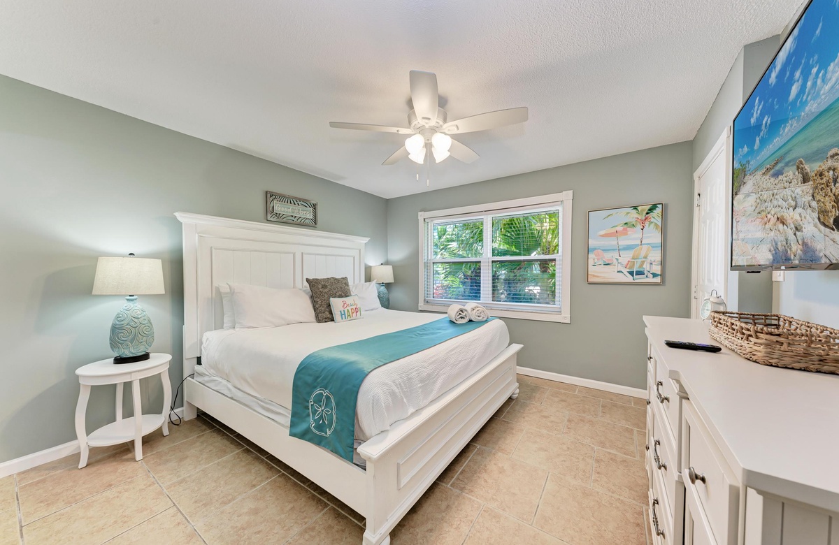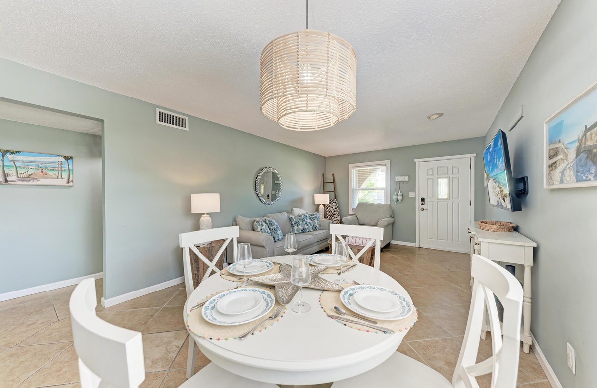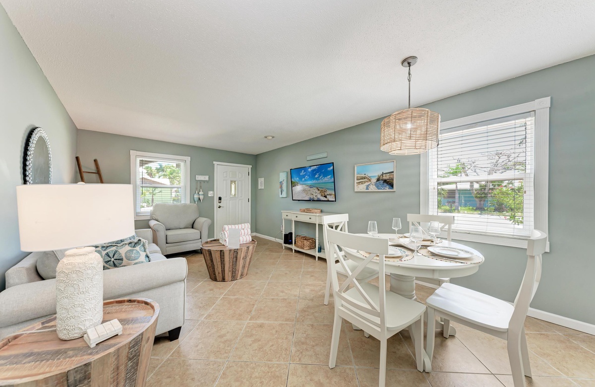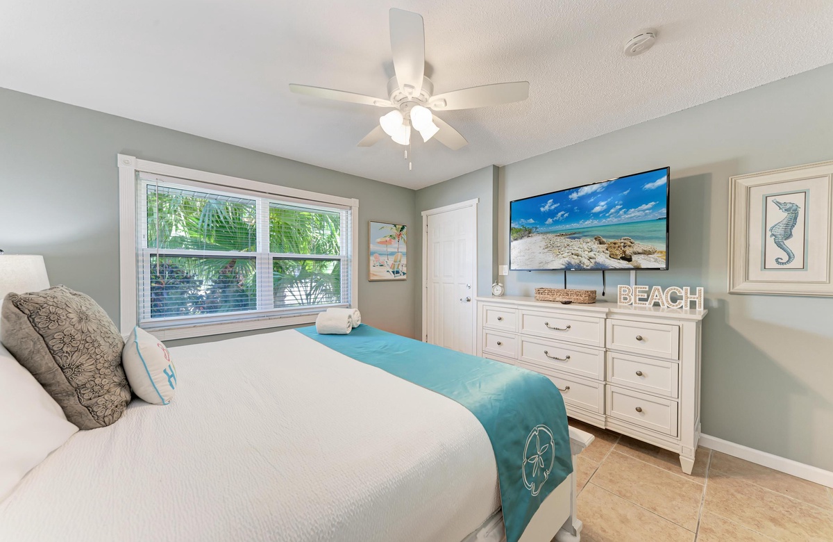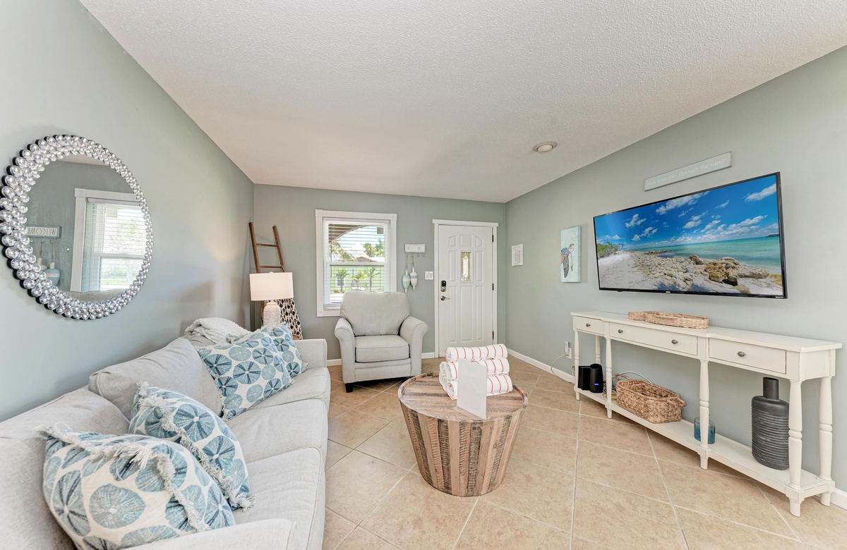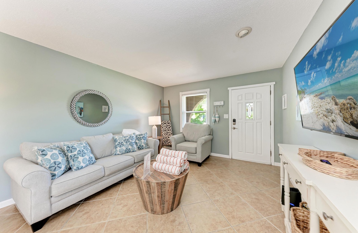 Innen in diesem Anna Maria Island Apartment finden Sie viel Charm und Komfort mit legerem, modernen Dekor und Küstenflair. Das Wohnzimmer biete über bequeme Couchen, um sich zurückzulehnen und das WLAN und den Flachbildfernseher zu genießen, während man gemütlich mit Familie und Freunden plaudert. In der Küche finden Sie alle Utensilien, inklusive Edelstahl-Geräte und Geschirrspüler. Es gibt eine gemeinschaftlich genutzte Waschmaschine und einen Trockner. Die Schlafzimmer sind bequem und großzügig und verfügen alle über Fernseher. Beide Bäder haben eine begehbare Dusche. Eines der Bäder liegt am Hauptschlafzimmer und das andere bei dem zweien Schlafzimmer mit Einzelbetten.