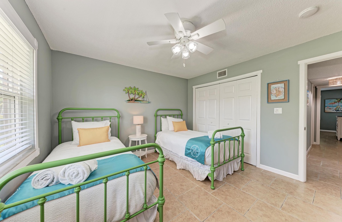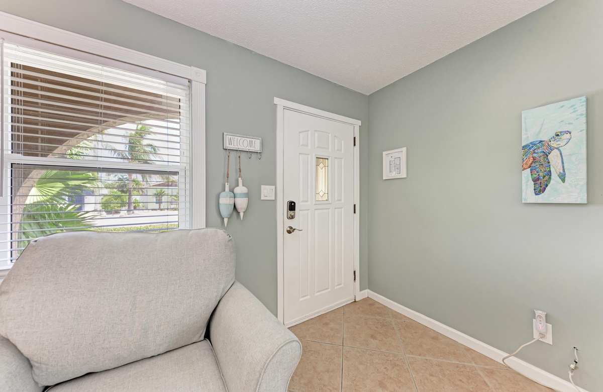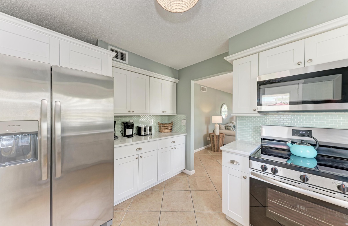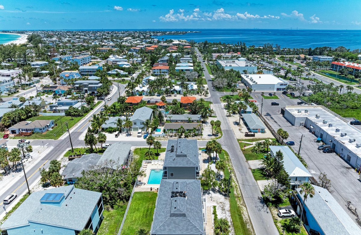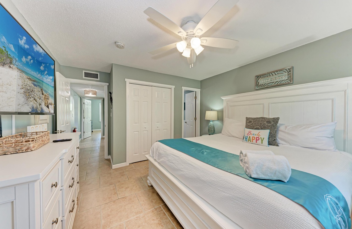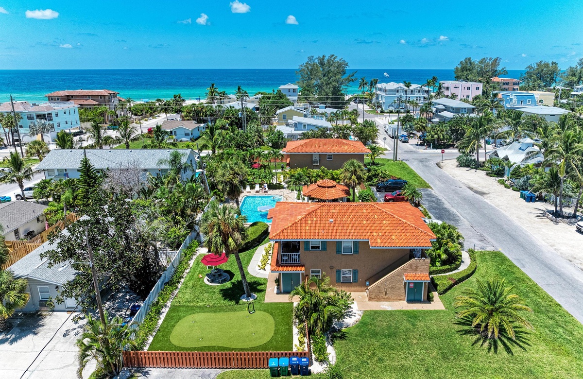 Innen in diesem Anna Maria Island Apartment finden Sie viel Charm und Komfort mit legerem, modernen Dekor und Küstenflair. Das Wohnzimmer biete über bequeme Couchen, um sich zurückzulehnen und das WLAN und den Flachbildfernseher zu genießen, während man gemütlich mit Familie und Freunden plaudert. In der Küche finden Sie alle Utensilien, inklusive Edelstahl-Geräte und Geschirrspüler. Es gibt eine gemeinschaftlich genutzte Waschmaschine und einen Trockner. Die Schlafzimmer sind bequem und großzügig und verfügen alle über Fernseher. Beide Bäder haben eine begehbare Dusche. Eines der Bäder liegt am Hauptschlafzimmer und das andere bei dem zweien Schlafzimmer mit Einzelbetten.
