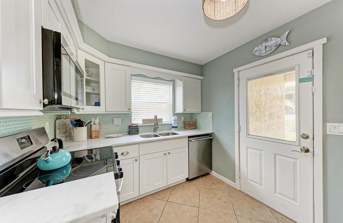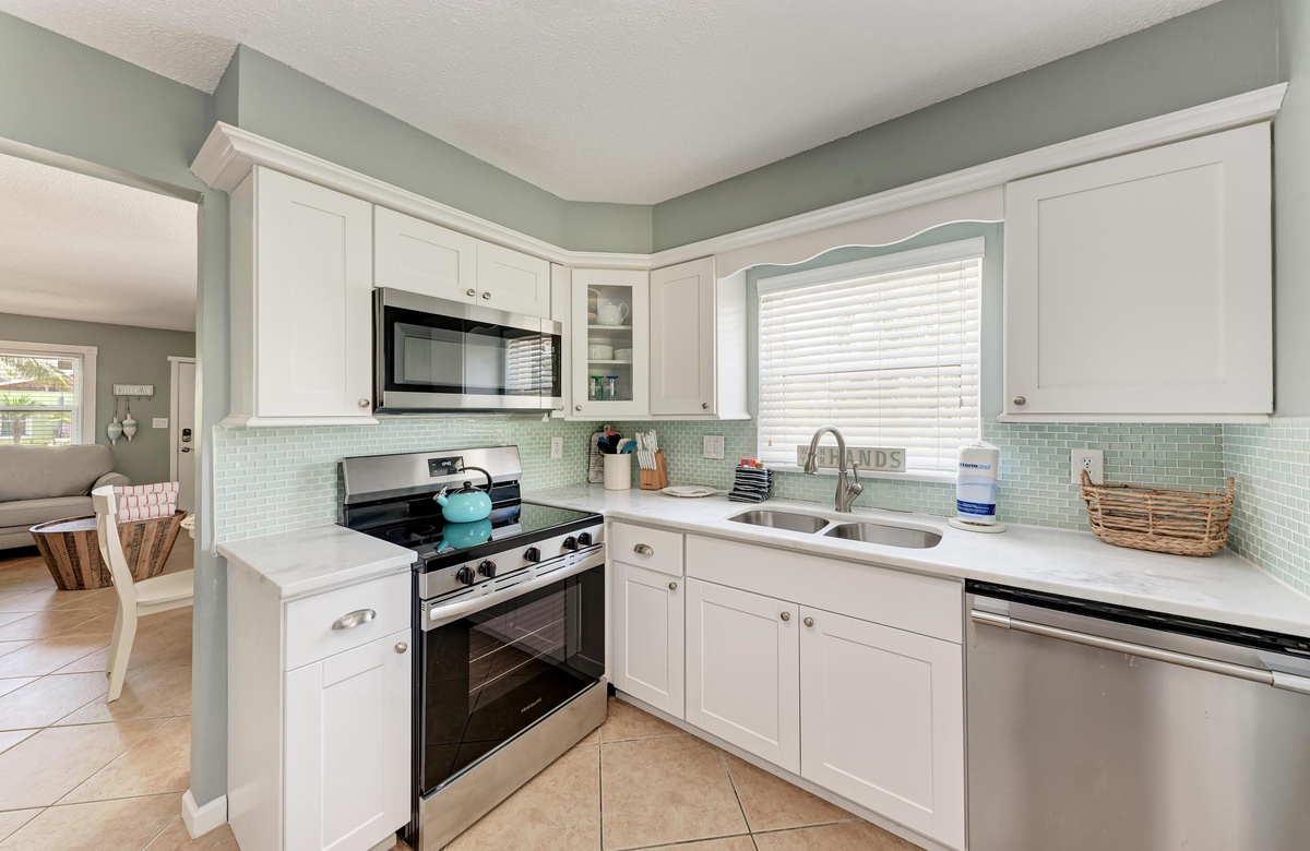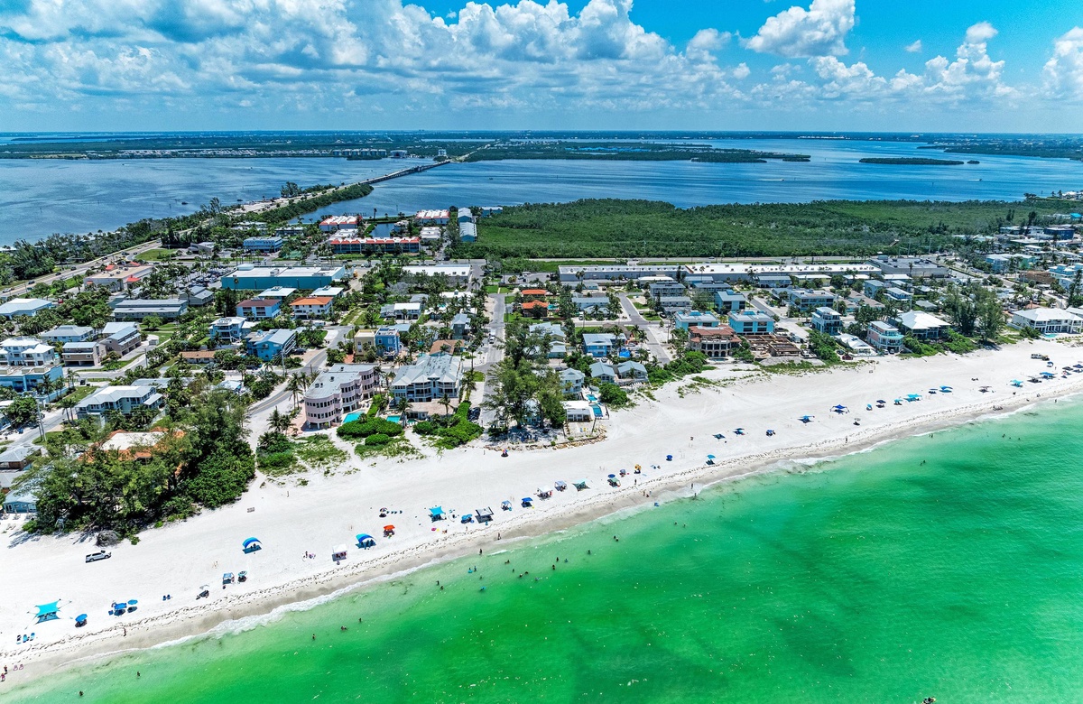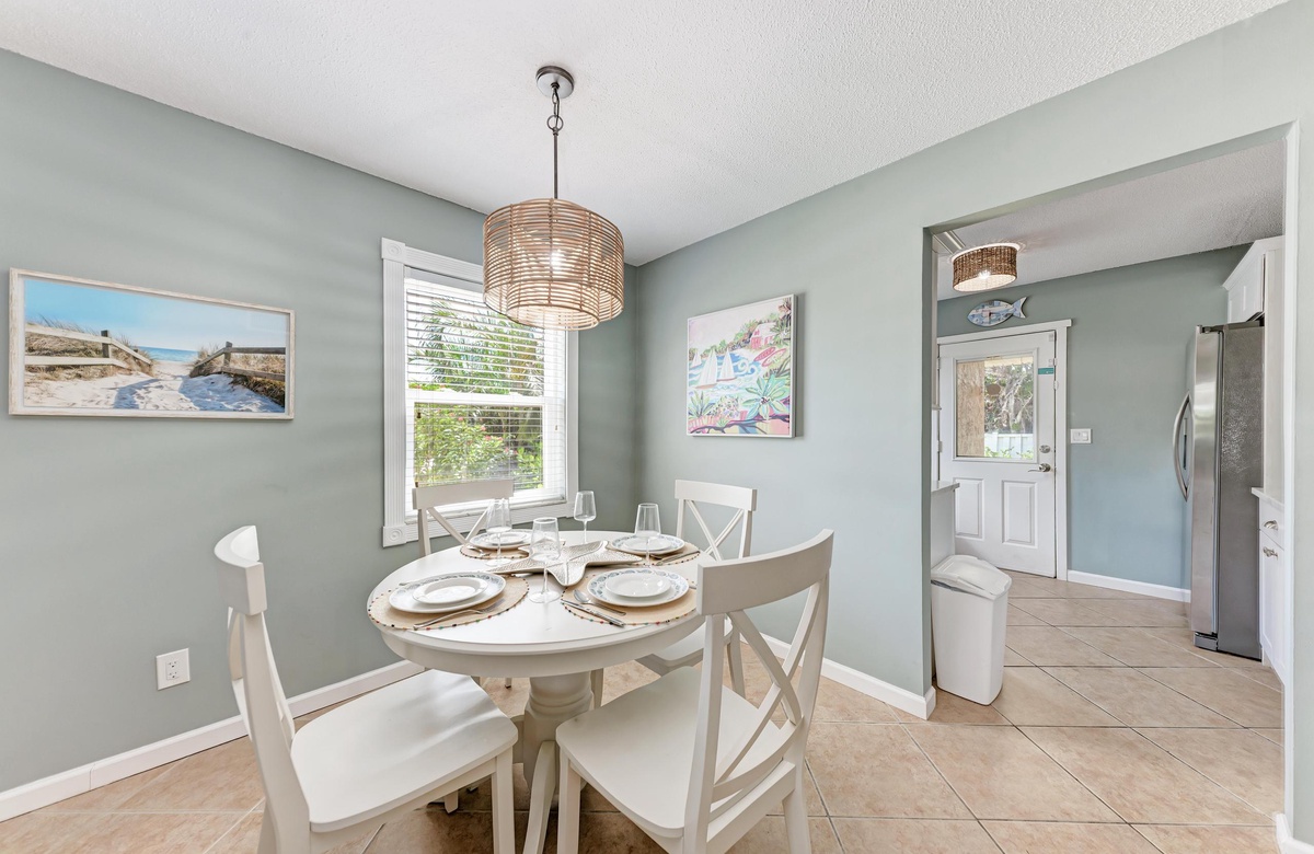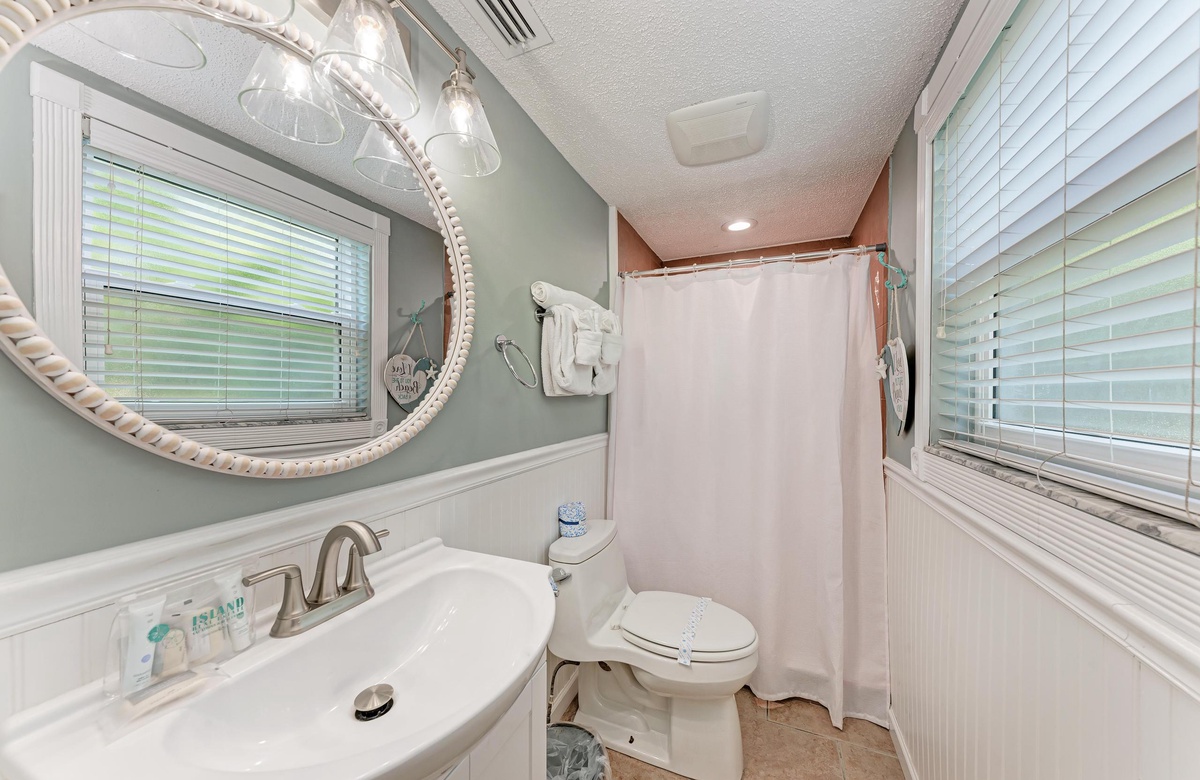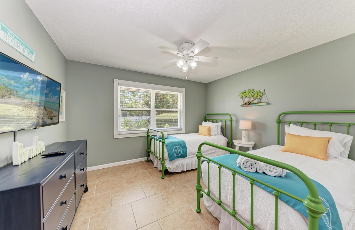 Innen in diesem Anna Maria Island Apartment finden Sie viel Charm und Komfort mit legerem, modernen Dekor und Küstenflair. Das Wohnzimmer biete über bequeme Couchen, um sich zurückzulehnen und das WLAN und den Flachbildfernseher zu genießen, während man gemütlich mit Familie und Freunden plaudert. In der Küche finden Sie alle Utensilien, inklusive Edelstahl-Geräte und Geschirrspüler. Es gibt eine gemeinschaftlich genutzte Waschmaschine und einen Trockner. Die Schlafzimmer sind bequem und großzügig und verfügen alle über Fernseher. Beide Bäder haben eine begehbare Dusche. Eines der Bäder liegt am Hauptschlafzimmer und das andere bei dem zweien Schlafzimmer mit Einzelbetten.