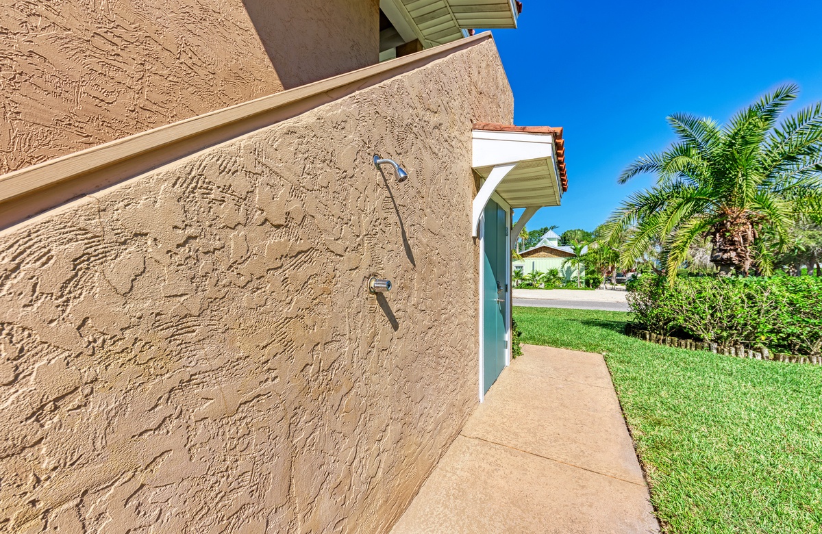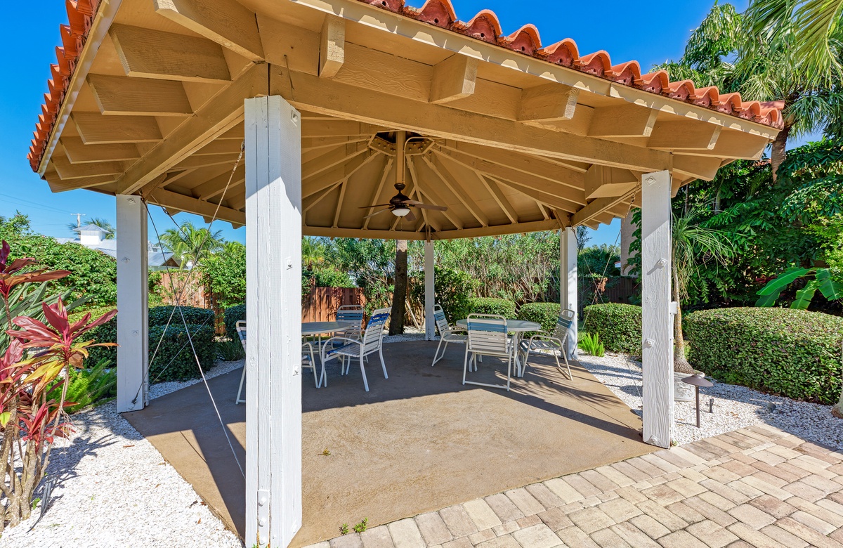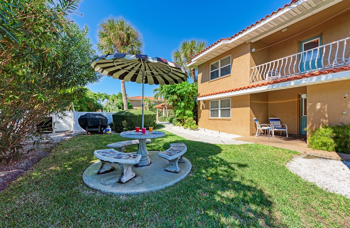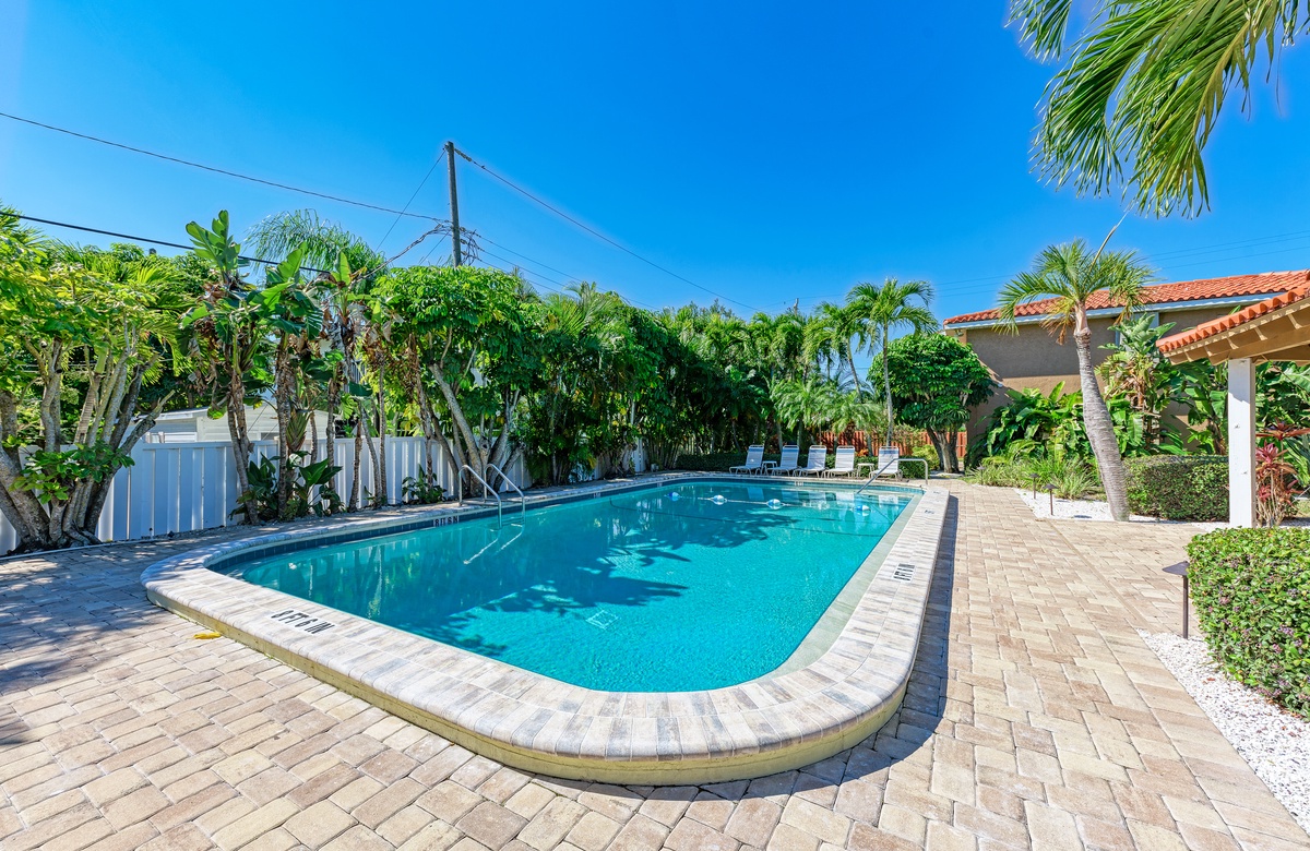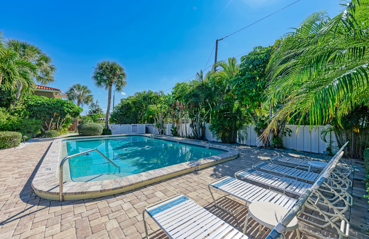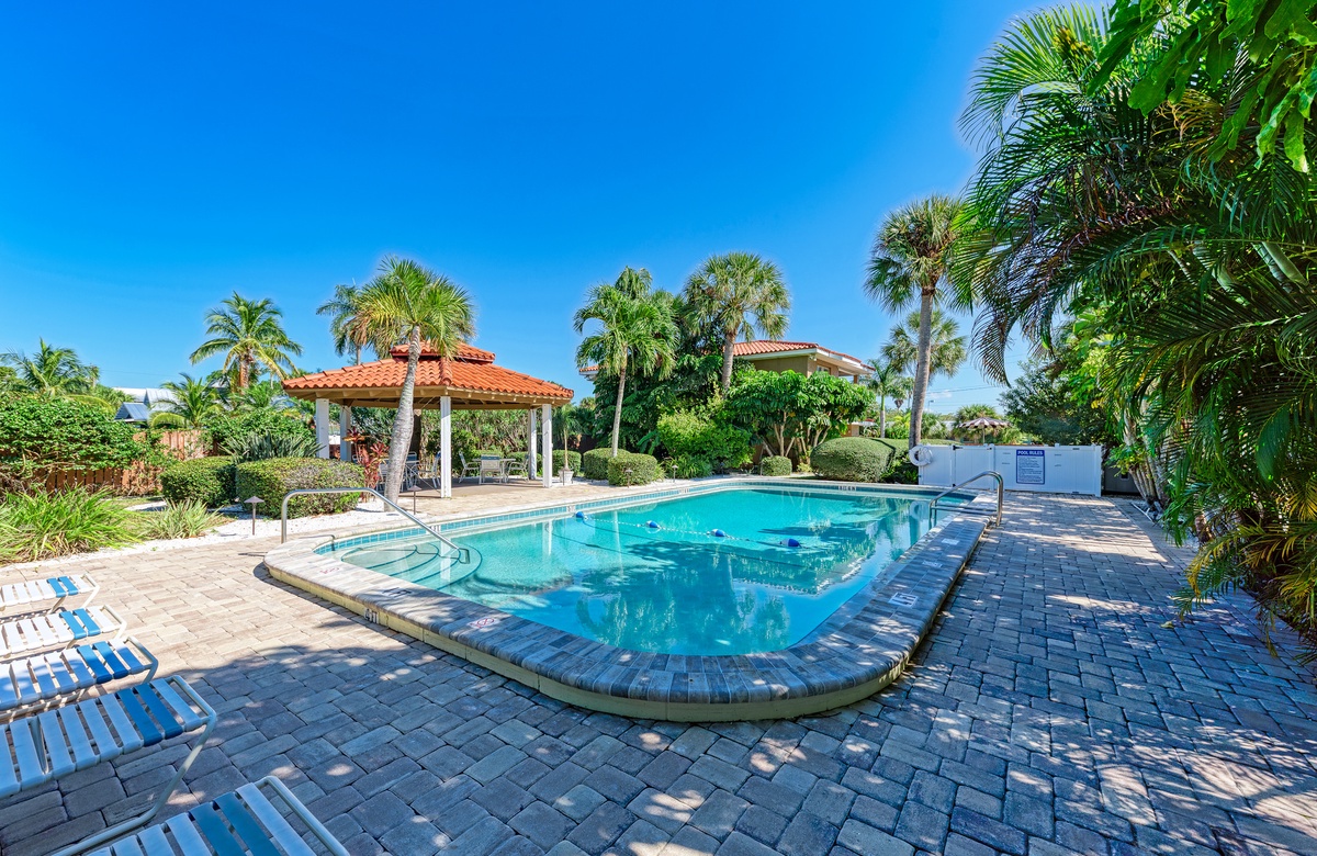 Wenn Sie in der ruhigen Anlage mit nur vier Einheiten wohnen, können Sie tolle Annehmlichkeiten nutzen, wie den beheizten Gemeinschaftspool mit überdachter Terrasse und Loungebereich, Außendusche, Kohlegrill und Picknick-Tische.