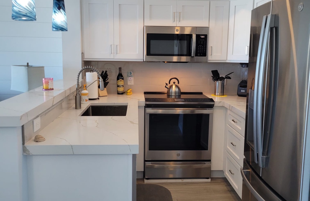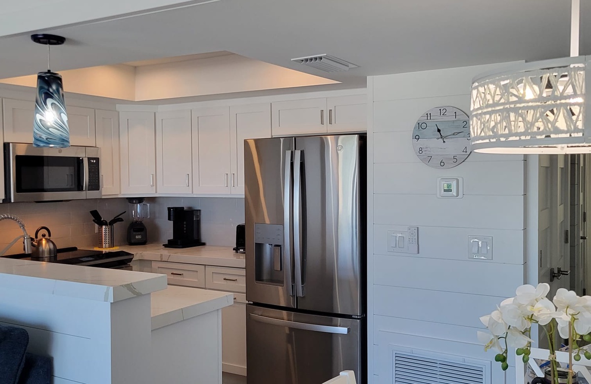 Die Küche des "Coconuts Beach Resort 108" bietet alle Utensilien und ist mit allen nötigen Geräten ausgestattet, inklusive eines großen Kühlschranks, Herd und Backofen, Mikrowelle, Kaffeemaschine, Mixer und Toaster. Der gemütliche Esstische hat vier Sitzplätze.