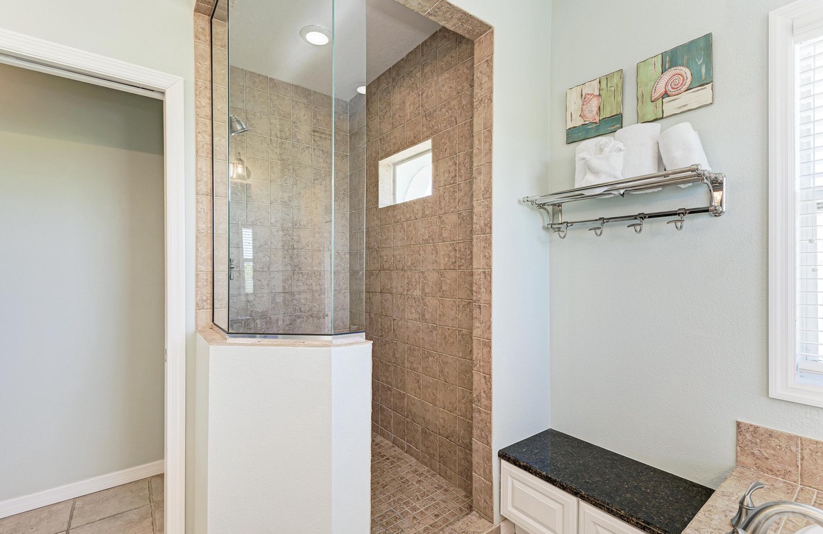 Im 2. Stock liegt das luxuriöse Hauptschlafzimmer. Fühlen Sie sich wie eine royales Paar in dieser enormen Suite mit einem großen Doppelbett. Loungebereich mit Couch und einem 43-Zoll-Flachbild-TV. Spülen Sie Ihre Sorgen in der Eckbadewanne oder begehbaren Dusche einfach weg. Dieser großzügige Grundriss bietet zwei separate Waschtische und einen abgeschlossenen WC-Raum für die perfekte Privatsphäre. Von diesem Schlafzimmer geht ein weiterer Wohnbereich mit Fernseher und einem Futon-Bett für extra Schlafplatz ab. Außerdem steht Ihnen ein großer Wäscheraum mit Bügelstation auf diesem Geschoss zur Verfügung.