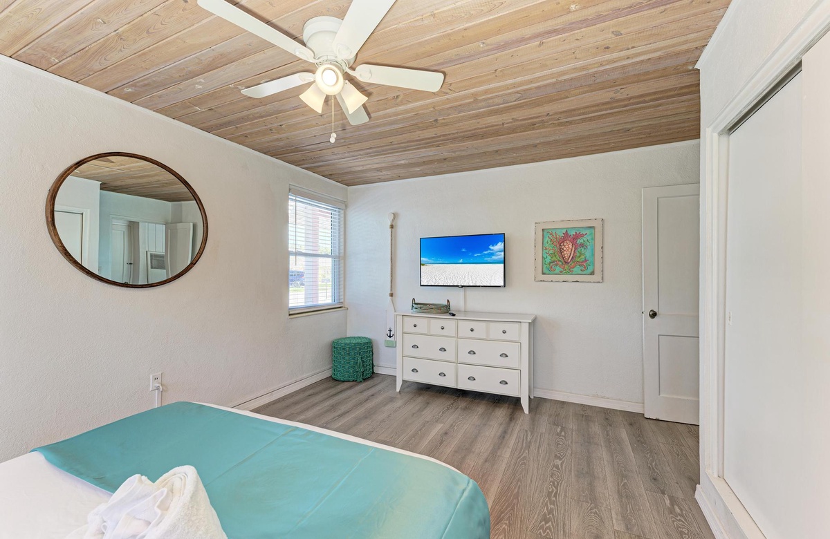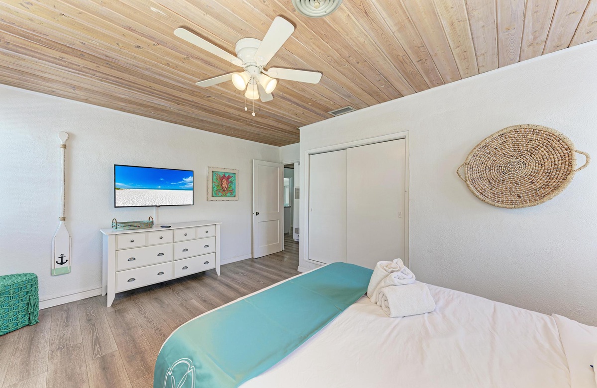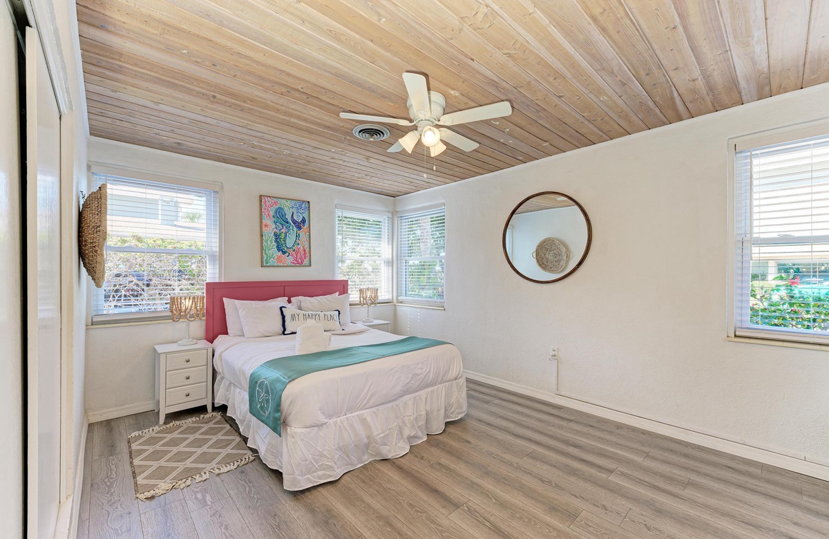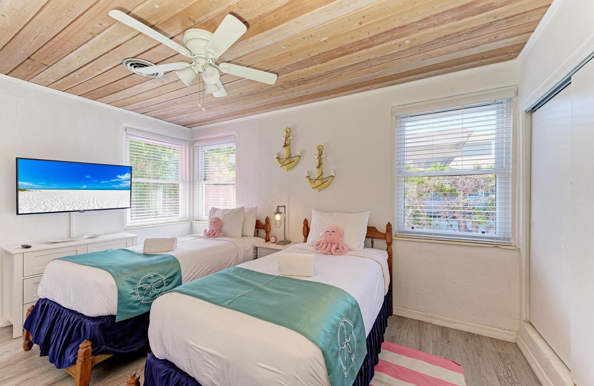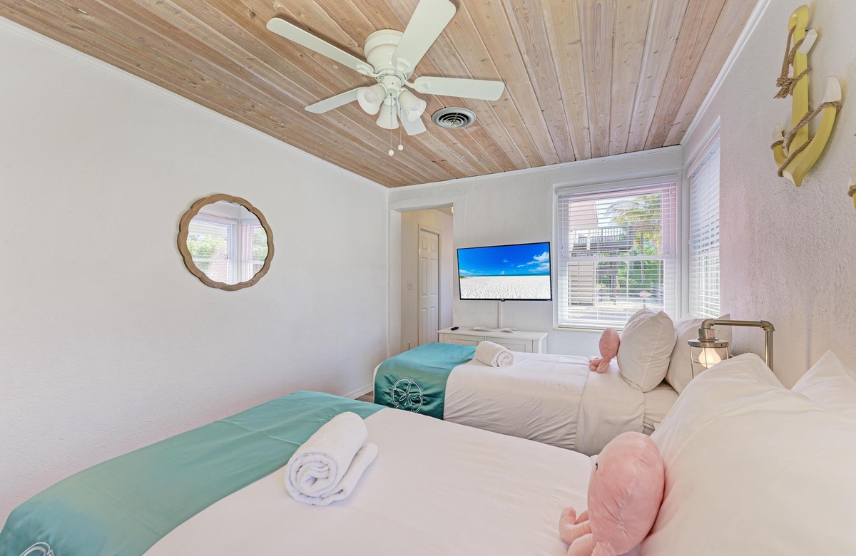 Beide Schlafzimmer im "Flirty Flamingo" bieten professionell gereinigte Premium-Qualitätswäsche plus Strand- und Handtücher für alle. Das Hauptschlafzimmer verfügt über ein Queensize-Bett. Das zweite Schlafzimmer hat zwei Einzelbetten mit einem en-suite-Badezimmer sowie Waschmaschine und Trockner. Hier wohnen bequem bis zu 4 Gäste. Zusätzlich gibt es ein Bad am Gang und ein komplettes Bad beim Wohnbereich. Eines hat eine Wannen-/Duschkombination und das andere eine begehbare Dusche. Weitere Annehmlichkeiten in diesem Strandhaus sind die neue Waschmaschine und Trockner sowie zwei Parkplätze.