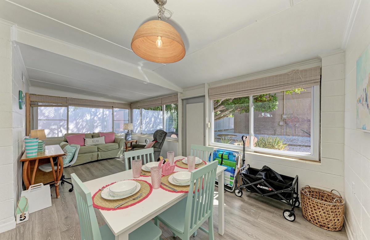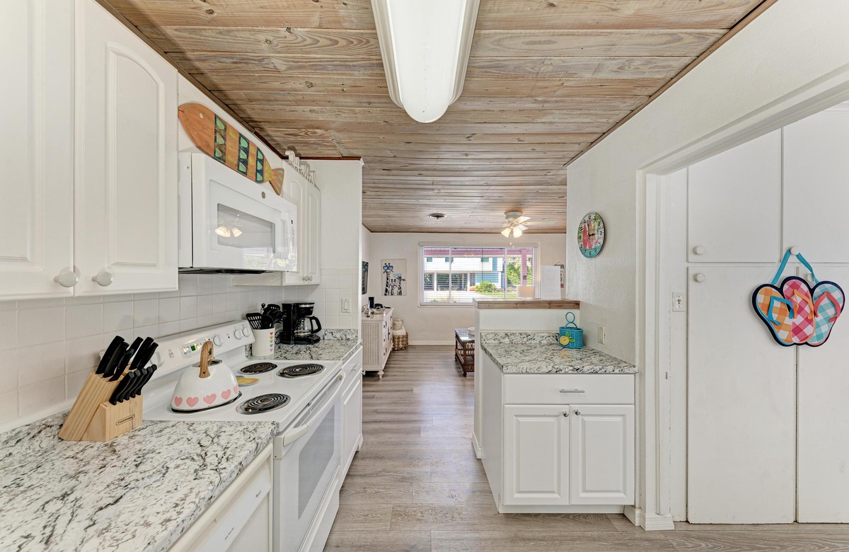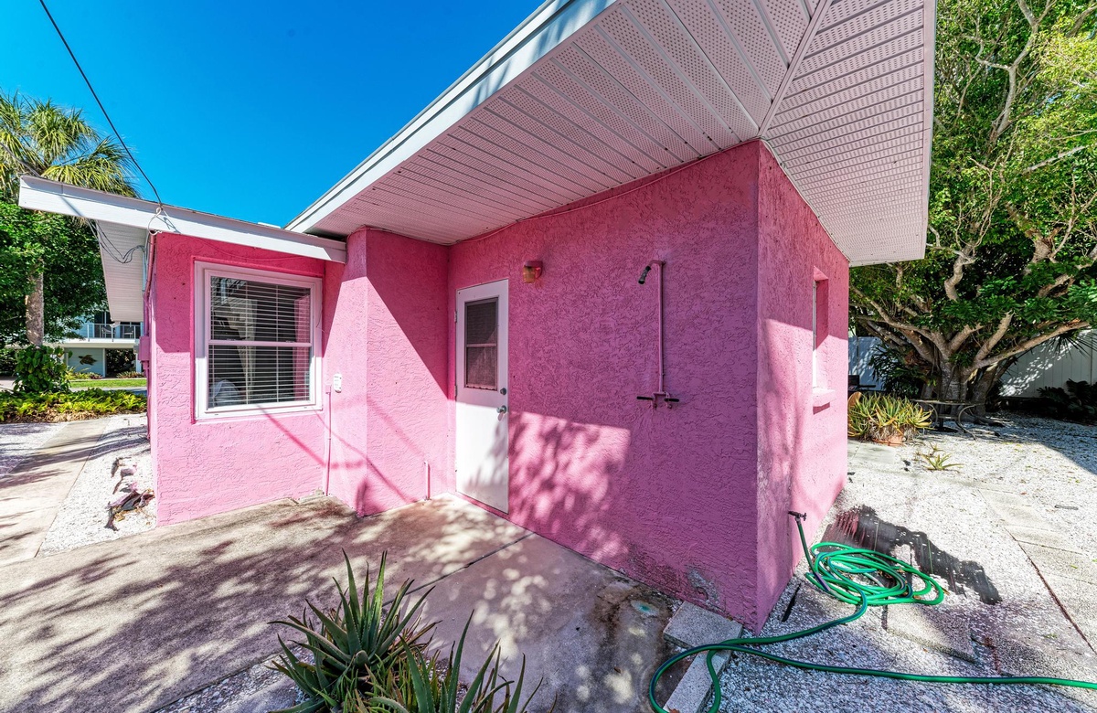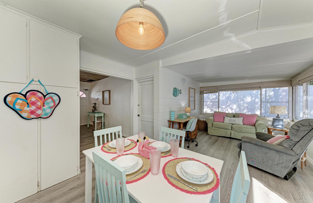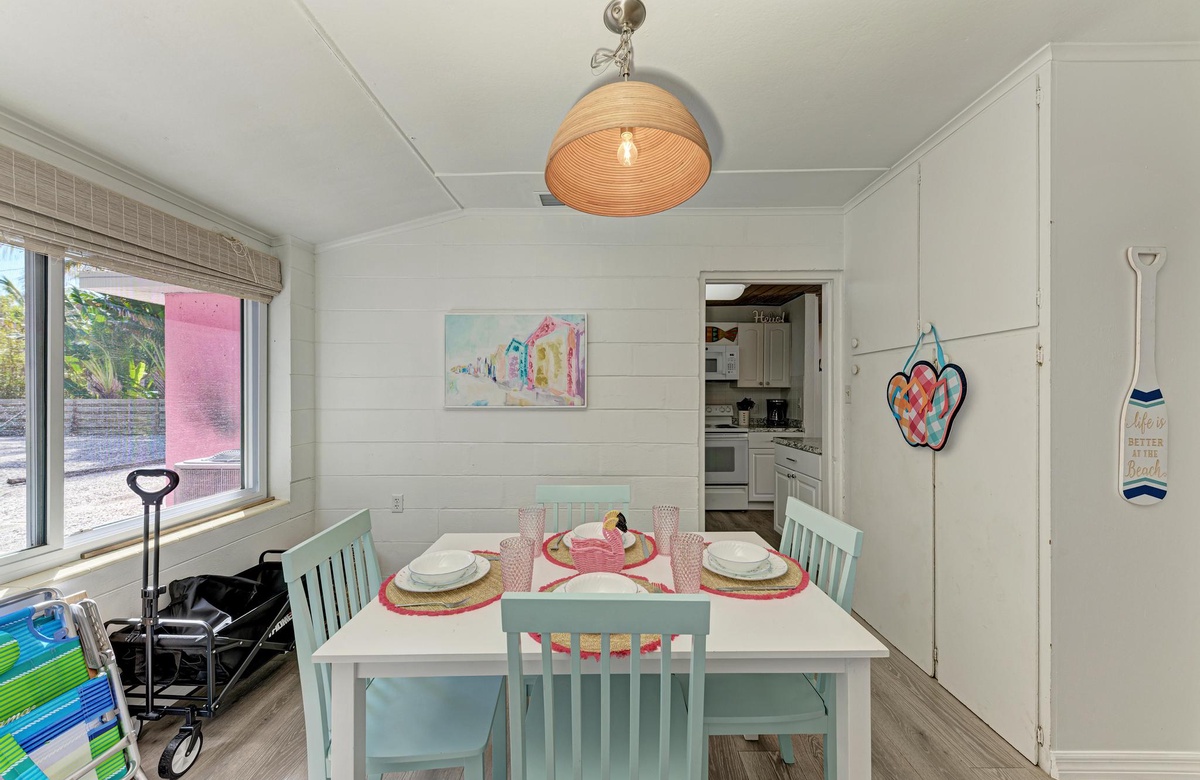 Dieses originelle Haus hat eine lebendige, pinke Fassade, die einen sofort in Inselstimmung versetzt. Wenn Sie "Flirty Flamingo" betreten, werden Sie die beruhigenden tropischen Farbtöne und gemütliches Dekor genießen. Der Grundriss ist offen gehalten mit dem Essbereich in der Ecke des hinteren Raums. Das Wohnzimmer ist ein Ort der Erholung, vielleicht beim Fernsehen am Flachbild-TV oder mit dem WLAN. Das Esszimmer bietet Platz für 4 Gäste. Sie finden in der Küche alles Nötige, um Mahlzeiten auf den Originalküchengeräten vorzubereiten. Es gibt keinen Grund zum Essen das Haus zu verlassen, da Sie die erforderliche Basisausstattung vor Ort haben.