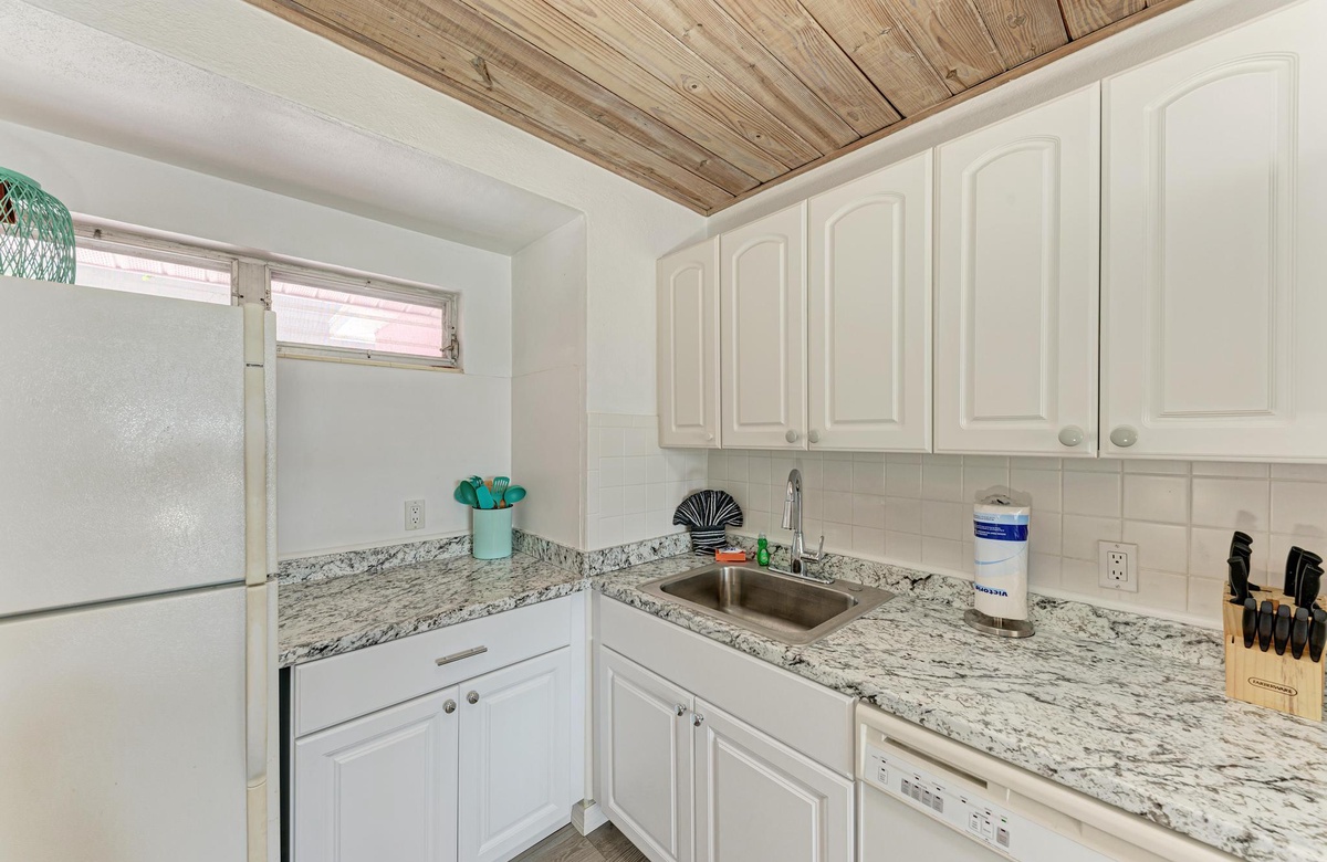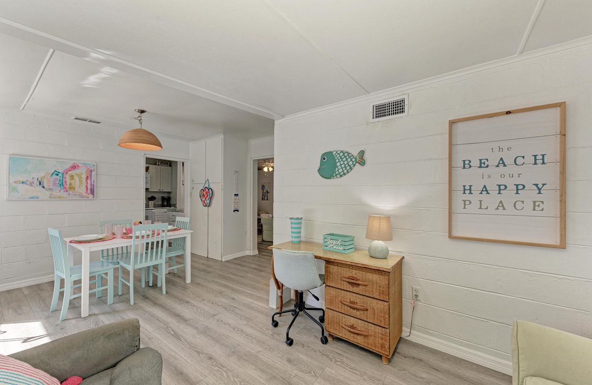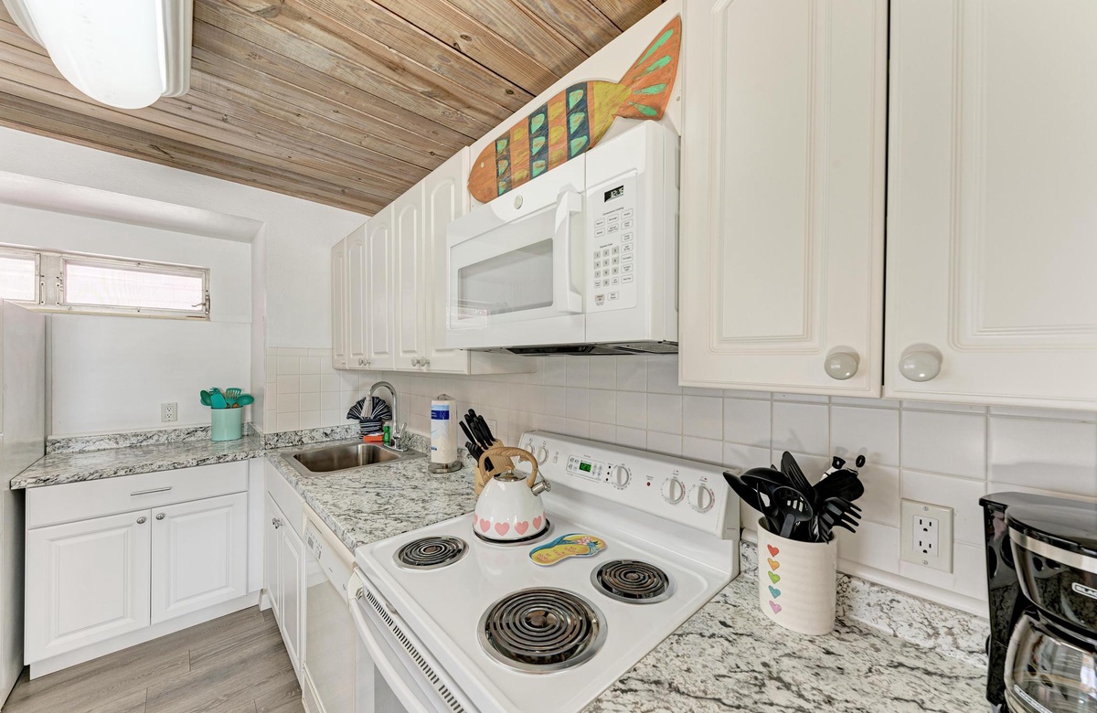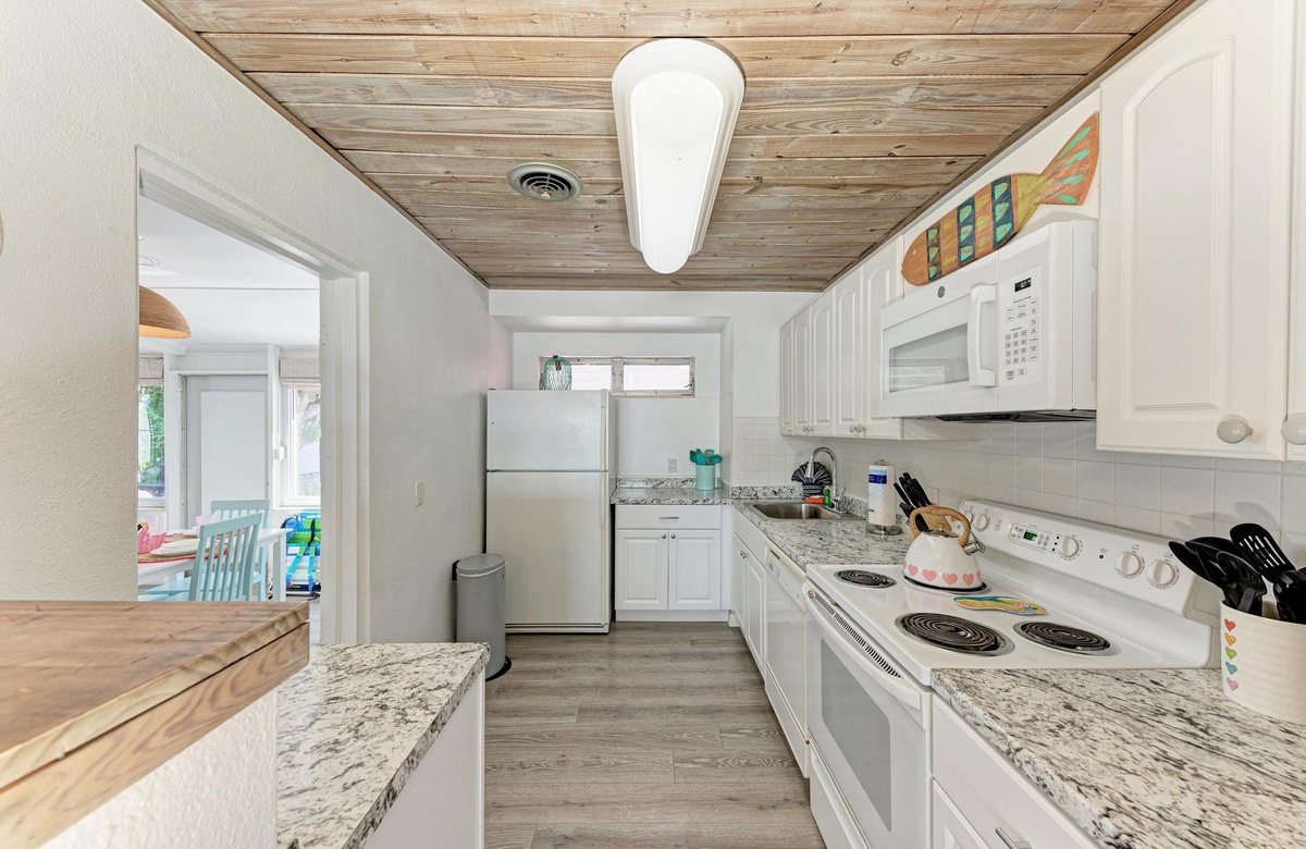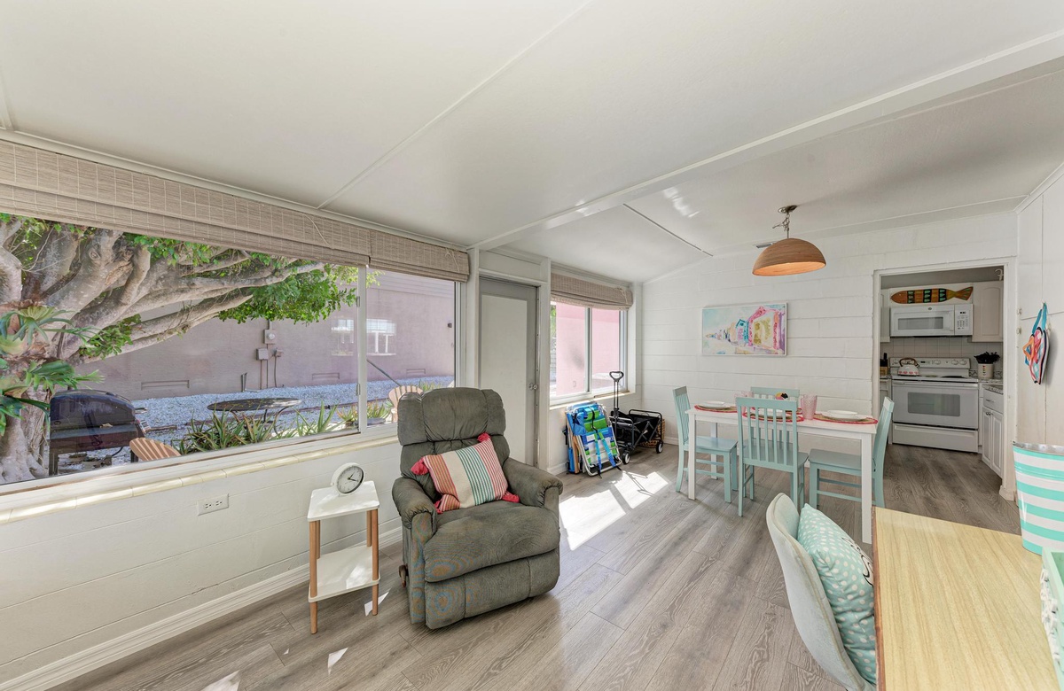 Dieses originelle Haus hat eine lebendige, pinke Fassade, die einen sofort in Inselstimmung versetzt. Wenn Sie "Flirty Flamingo" betreten, werden Sie die beruhigenden tropischen Farbtöne und gemütliches Dekor genießen. Der Grundriss ist offen gehalten mit dem Essbereich in der Ecke des hinteren Raums. Das Wohnzimmer ist ein Ort der Erholung, vielleicht beim Fernsehen am Flachbild-TV oder mit dem WLAN. Das Esszimmer bietet Platz für 4 Gäste. Sie finden in der Küche alles Nötige, um Mahlzeiten auf den Originalküchengeräten vorzubereiten. Es gibt keinen Grund zum Essen das Haus zu verlassen, da Sie die erforderliche Basisausstattung vor Ort haben.