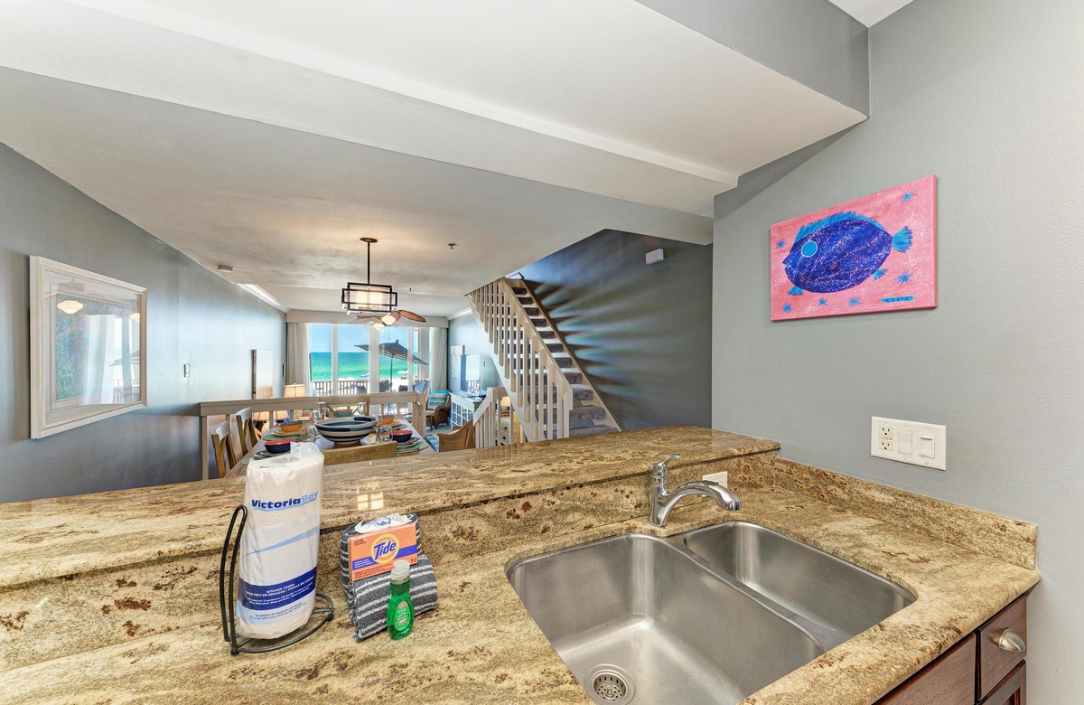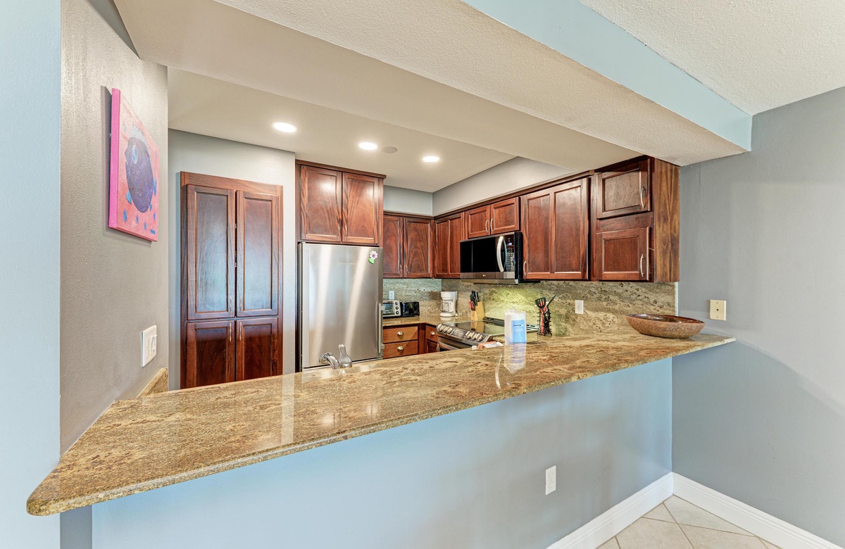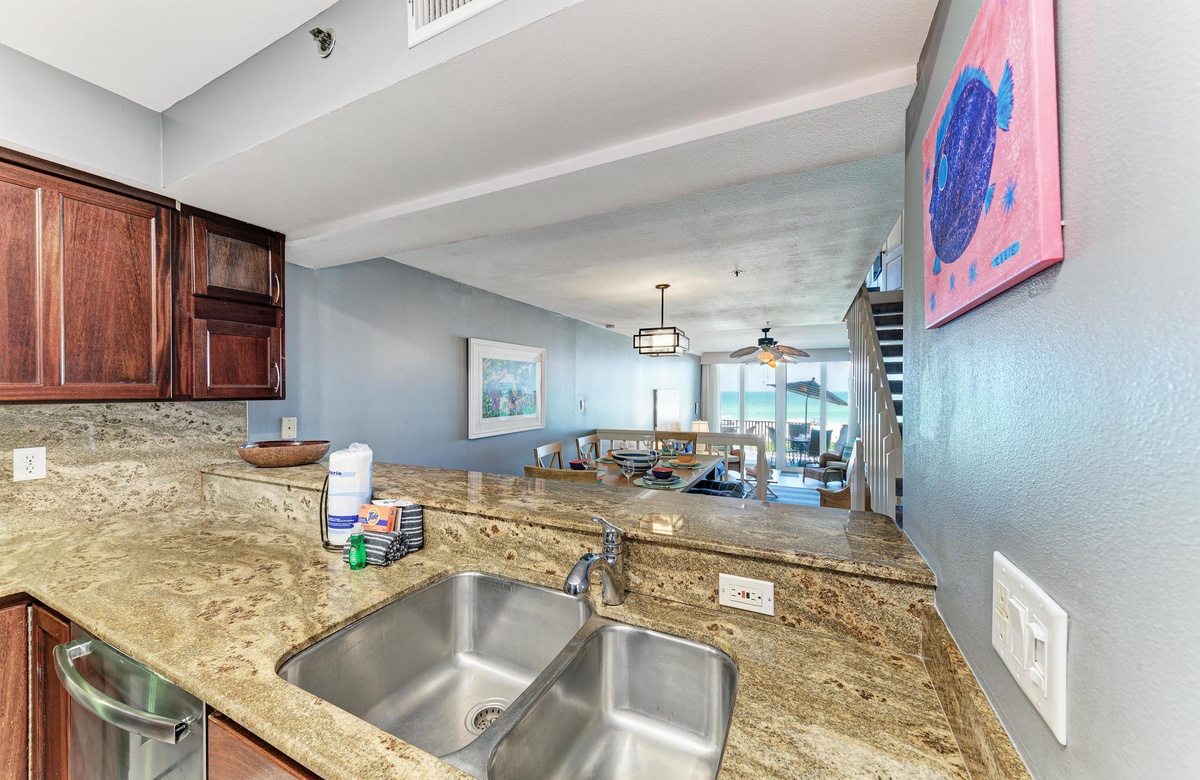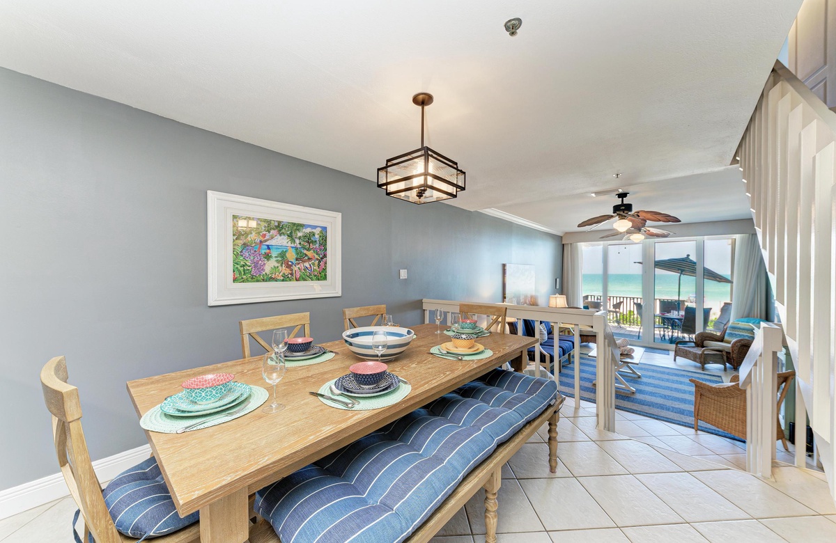 Vom Wohnzimmer, Esszimmer und der Küche aus haben Sie über den Außenbereich hinweg Blick auf den wunderschönen Golf. Das Wohnzimmer ist im tropischen Flair dekoriert. Die modernisierte Küche hat Granit-Arbeitsplatten und Edelstahlgeräte. Es gibt eine Frühstückstheke und einen großen Esstisch mit ausreichend Platz für alle.