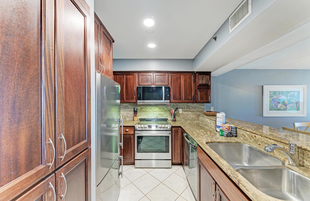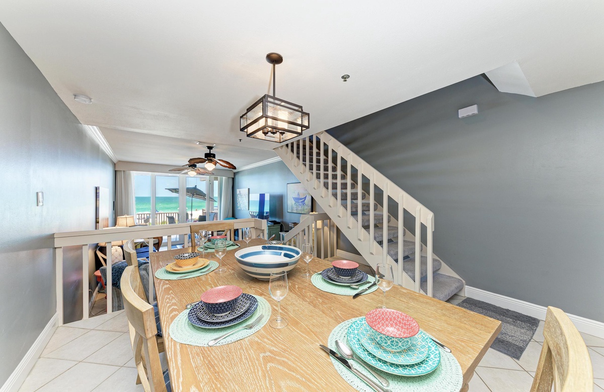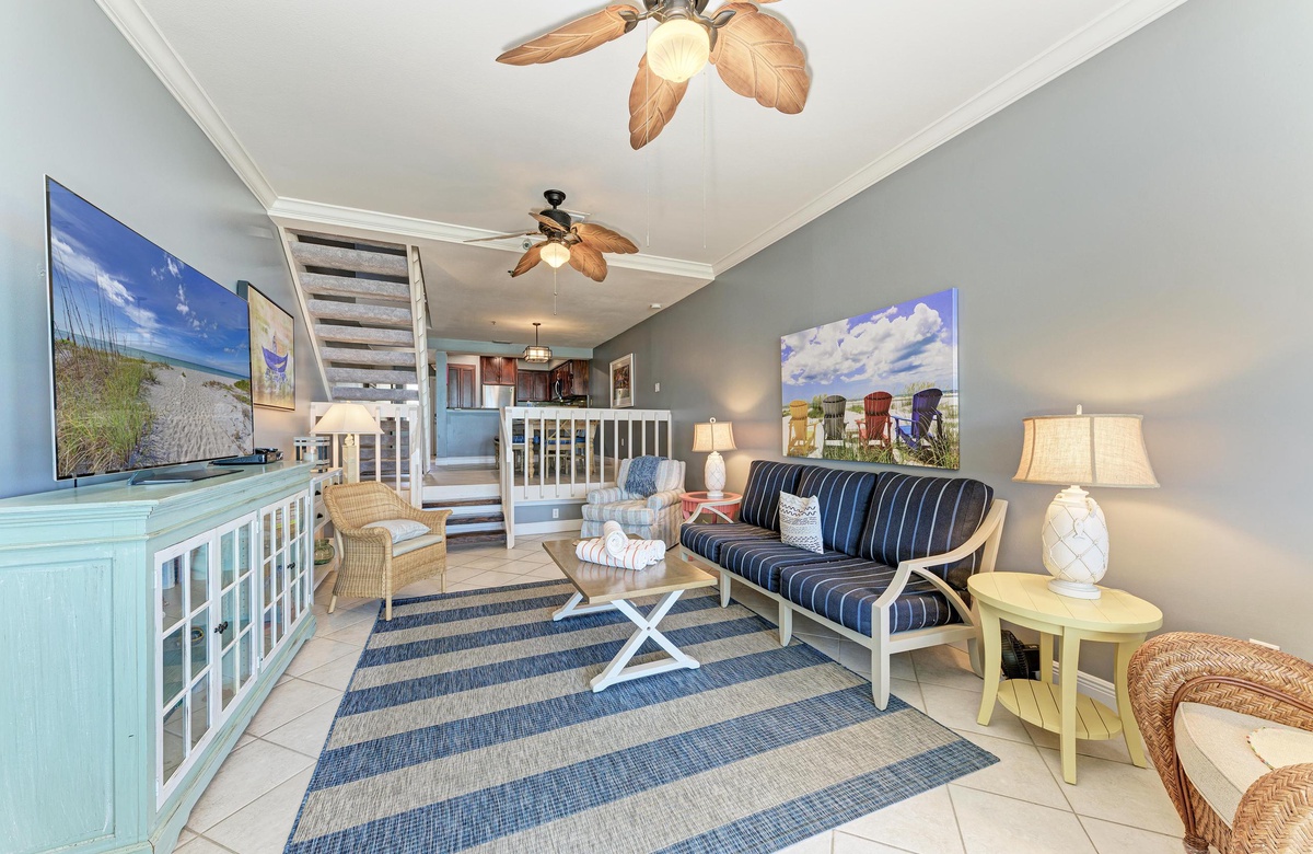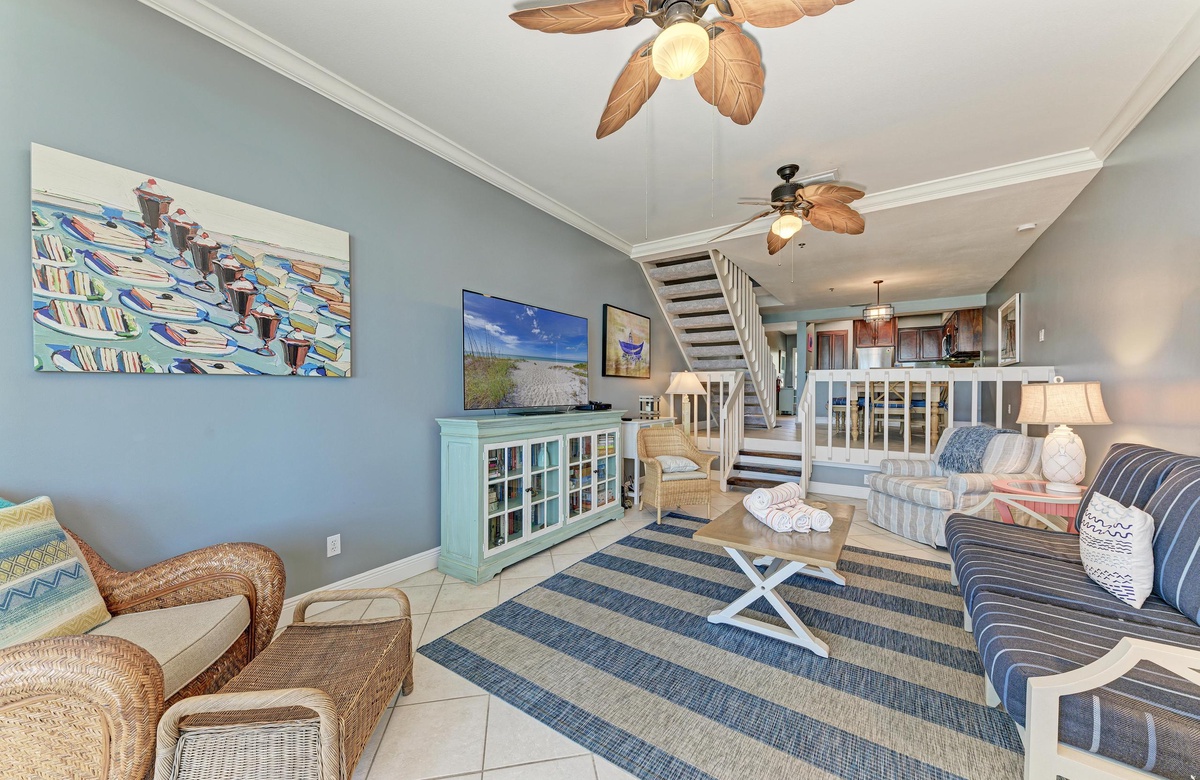 Vom Wohnzimmer, Esszimmer und der Küche aus haben Sie über den Außenbereich hinweg Blick auf den wunderschönen Golf. Das Wohnzimmer ist im tropischen Flair dekoriert. Die modernisierte Küche hat Granit-Arbeitsplatten und Edelstahlgeräte. Es gibt eine Frühstückstheke und einen großen Esstisch mit ausreichend Platz für alle.