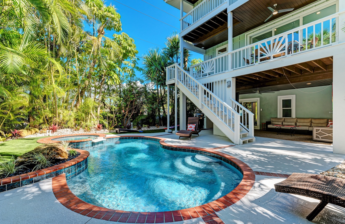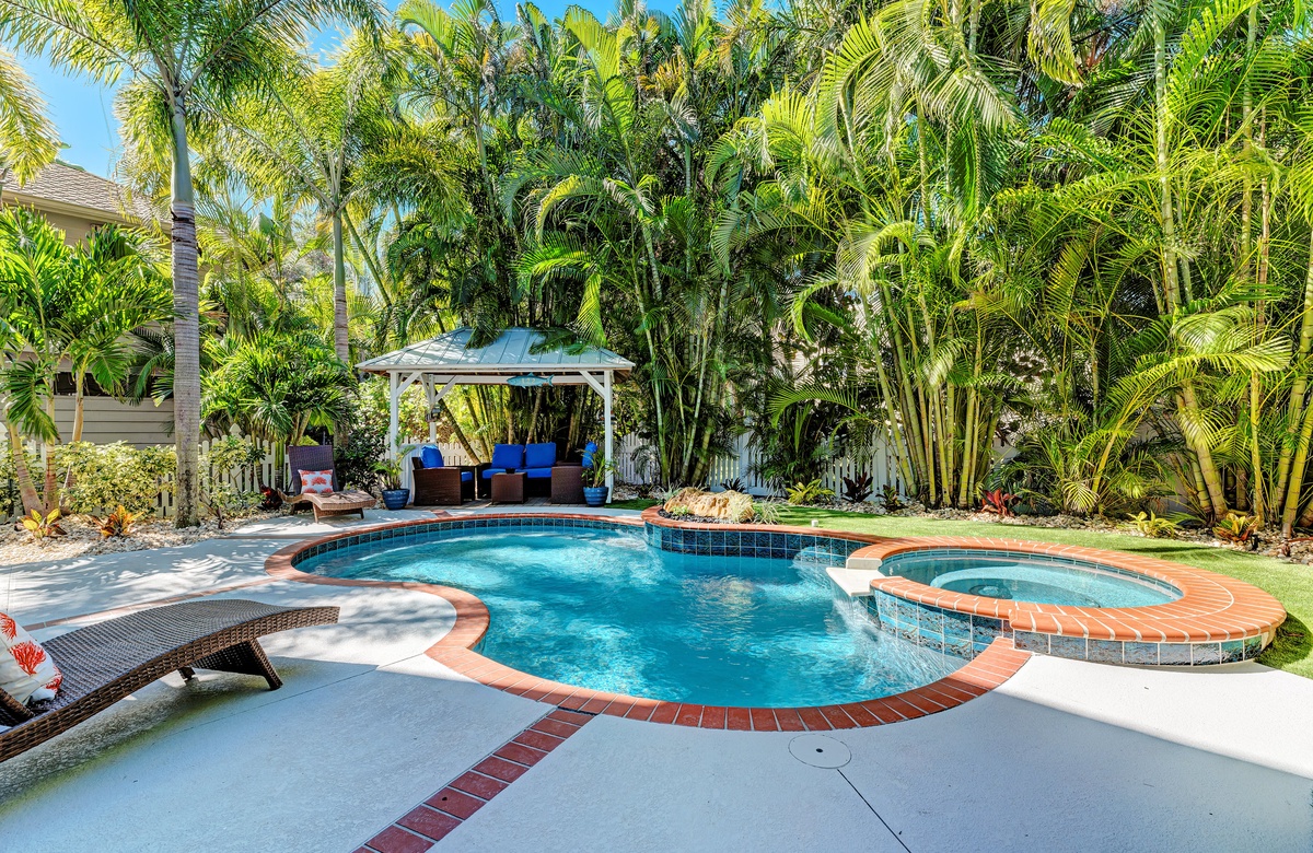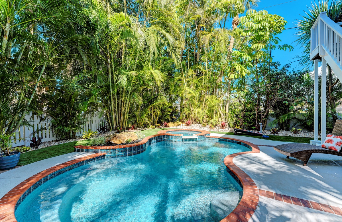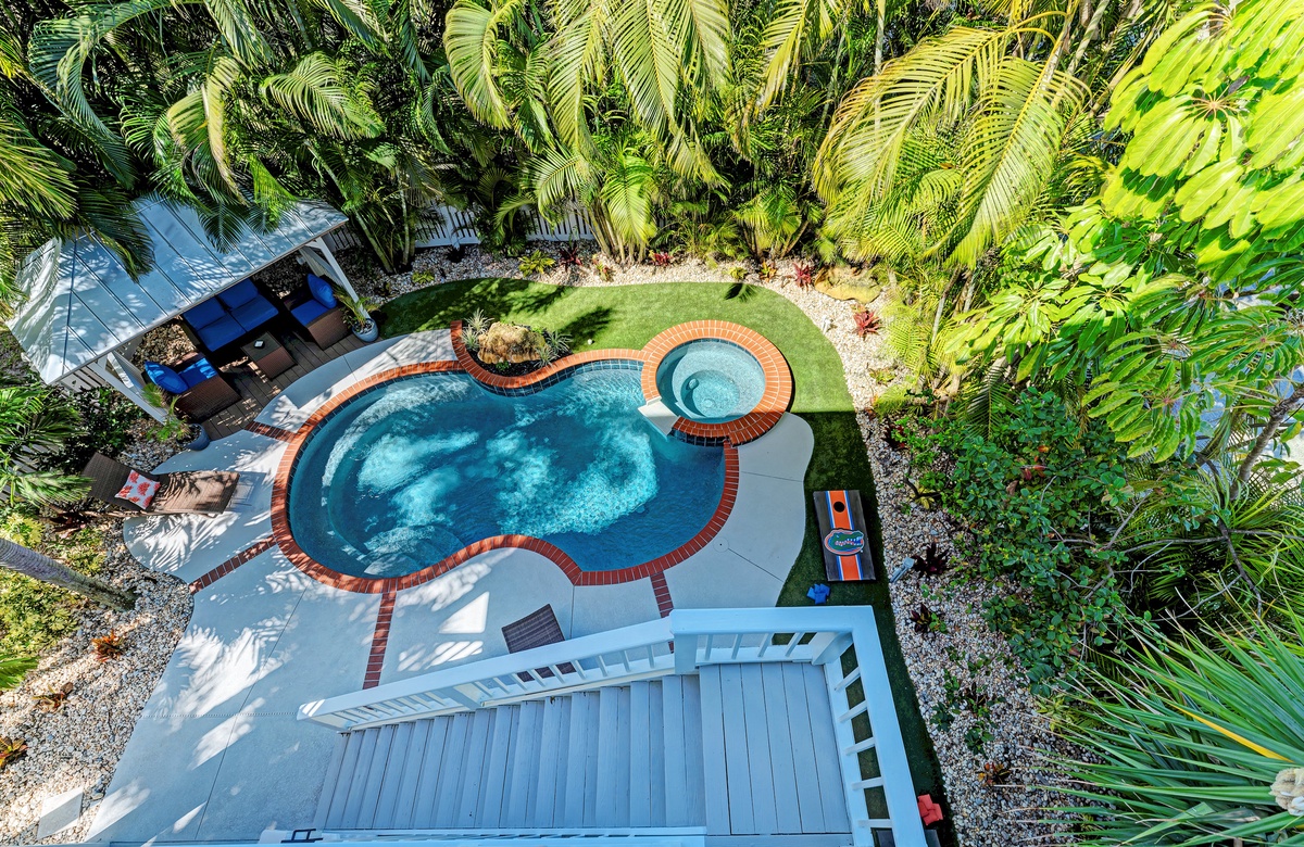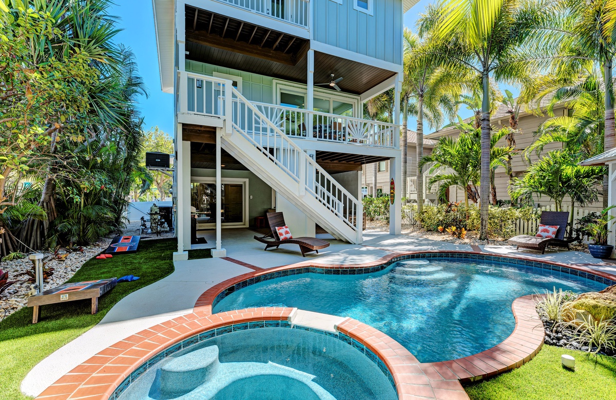 Der großzügige Garten besticht durch tropische Gartengestaltung und einem privaten, beheizten Salzwasserpool mit Spa. Vom überdachten Pavillon überblickt man den großen Pool. Gleich ab vom Poolbereich liegt innen ein Hobbyraum samt Bar, Vintage-Kühlschrank, elektronischem Dart-Brett und großem Fernseher, perfekt für regnerische Tage. Es gibt zudem ein maßgefertigtes Corn Hole Spiel, das der Eigentümer zur Verfügung stellt.