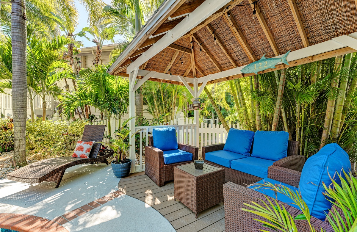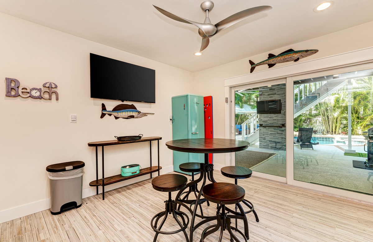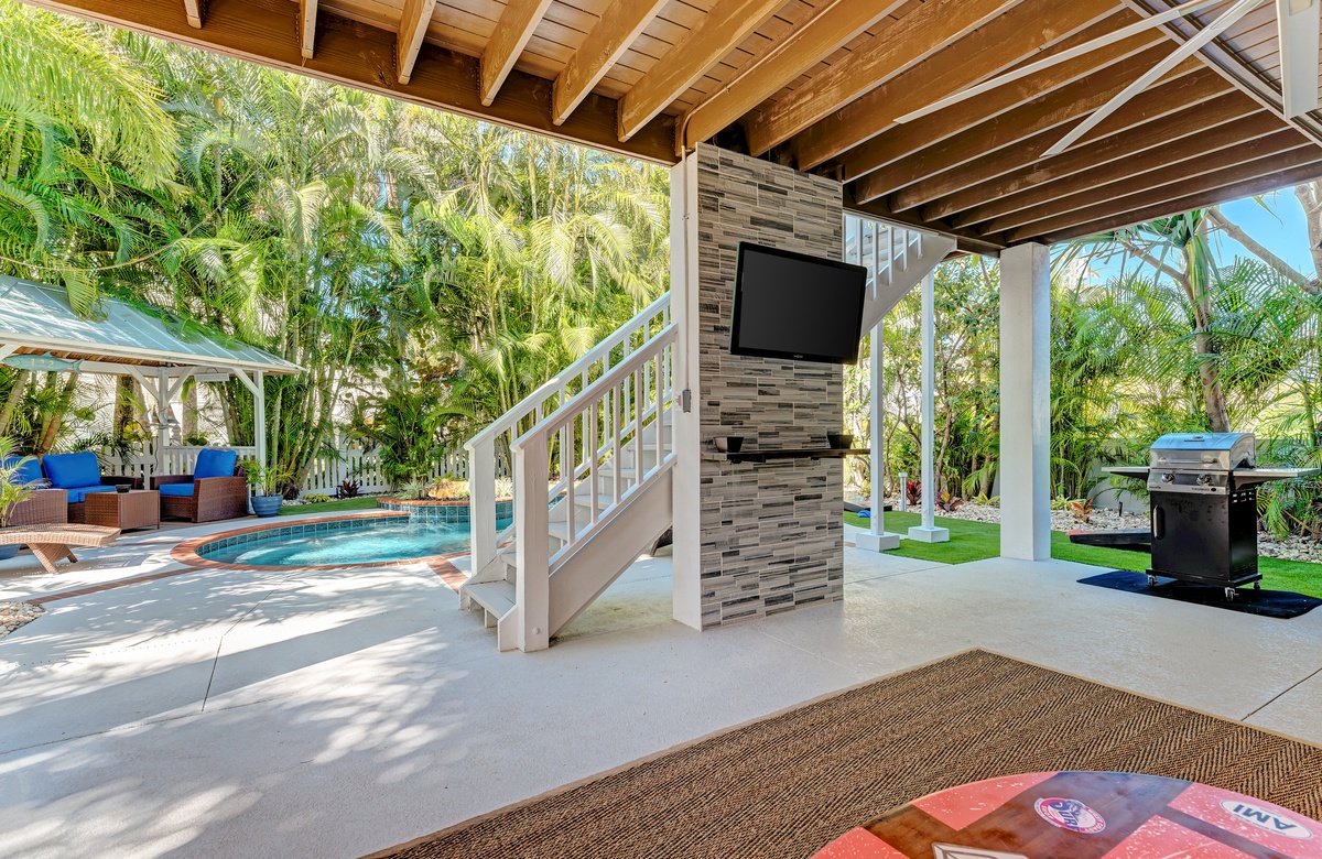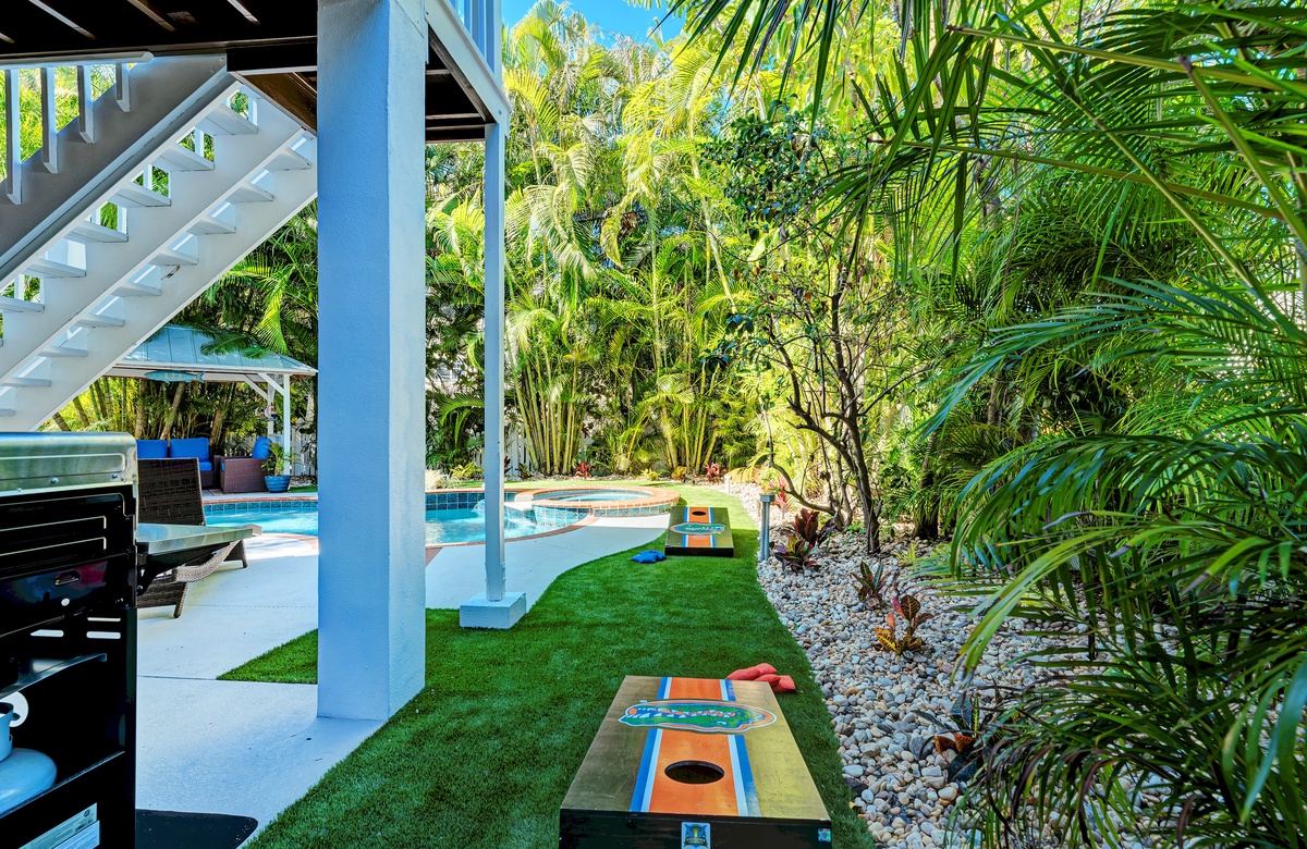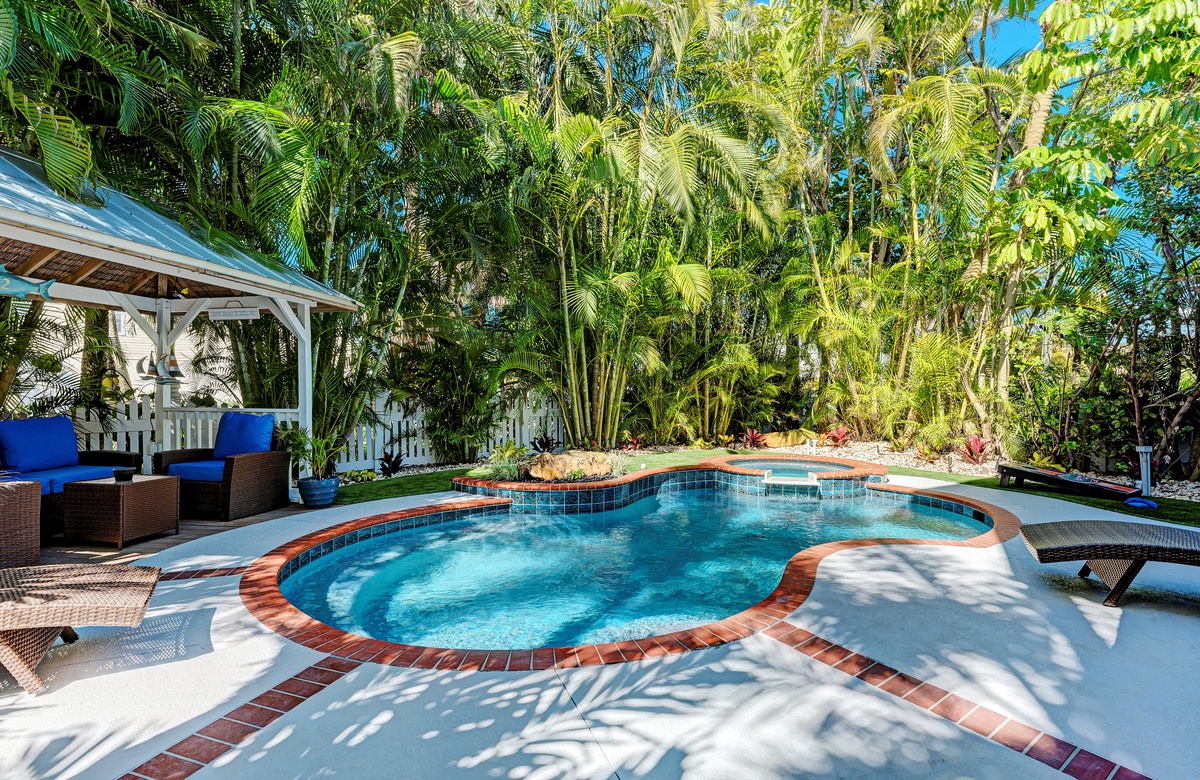 Der großzügige Garten besticht durch tropische Gartengestaltung und einem privaten, beheizten Salzwasserpool mit Spa. Vom überdachten Pavillon überblickt man den großen Pool. Gleich ab vom Poolbereich liegt innen ein Hobbyraum samt Bar, Vintage-Kühlschrank, elektronischem Dart-Brett und großem Fernseher, perfekt für regnerische Tage. Es gibt zudem ein maßgefertigtes Corn Hole Spiel, das der Eigentümer zur Verfügung stellt.