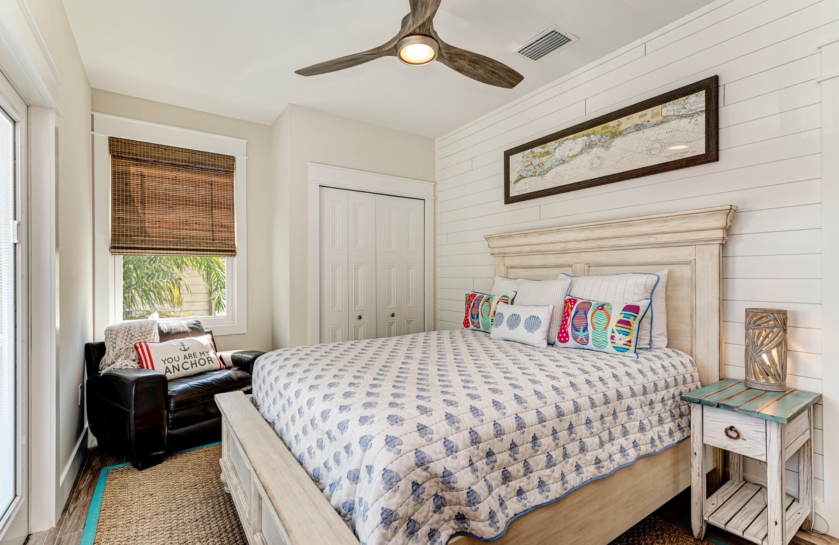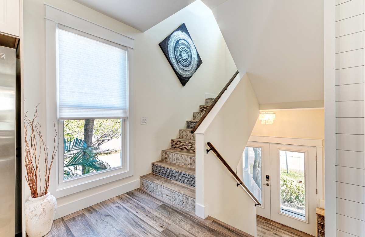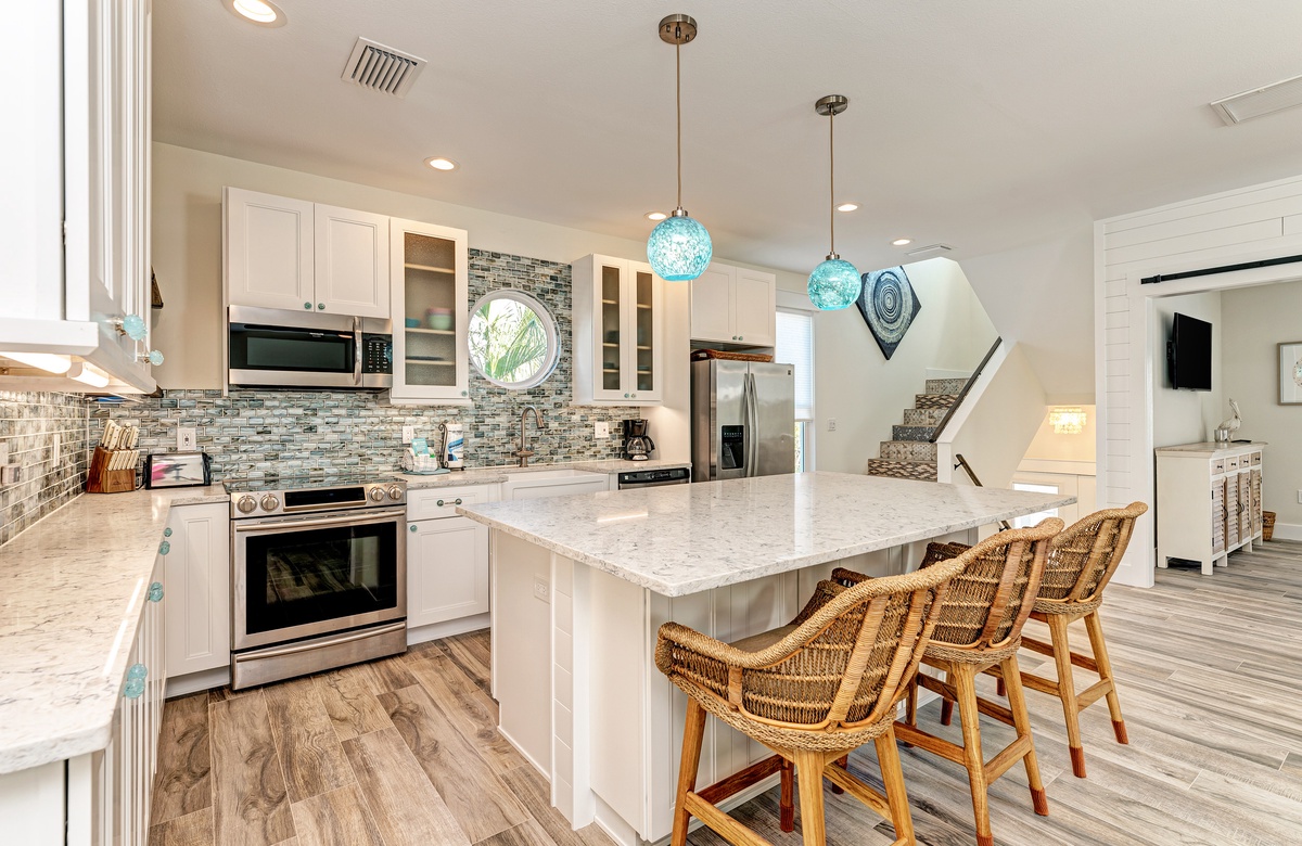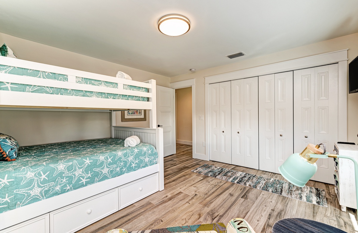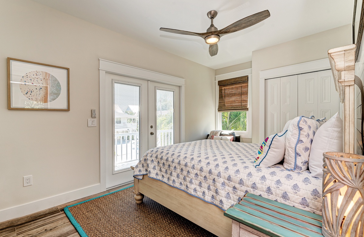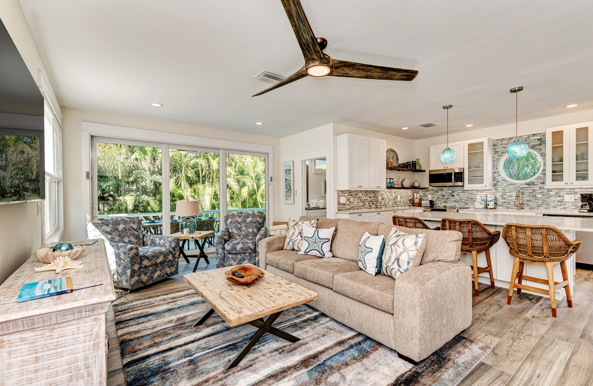 Der Hauptwohnbereich bietet einen offenen Grundriss mit Terrassen nach vorn und hinten im 1. Stock. Der Wohnbereich ist offen und beinhaltet die komplett ausgestattete Küche, das Wohnzimmer und Esszimmer. Oben beim Hauptschlafzimmer befinden sich Waschmaschine und Trockner. Drei der vier Schlafzimmer sind auf dem 2. Stock, inklusive des Hauptschlafzimmers. Das vierte Schlafzimmer ist auf der selben Ebene, wie der Wohnbereich und umfasst ein Badezimmer bei der Küche, welches für Gäste gut erreichbar ist. Dieses private Haus westlich des Gulf Drive beherbergt bequem bis zu 8 Personen mit einem Kingsize-Bett im Hauptschlafzimmer, einem Queensize-Bett im zweiten Schlafzimmer und einer zweiter Schlafzimmer-Suite mit ebenfalls einem Kingsize-Bett im 2. Stock und einem Stockbett bestehend aus oben einem großen Einzelbett und darunter einem Queensize-Bett im 4. Schlafzimmer, welches perfekt für Kinder und Erwachsene ist!