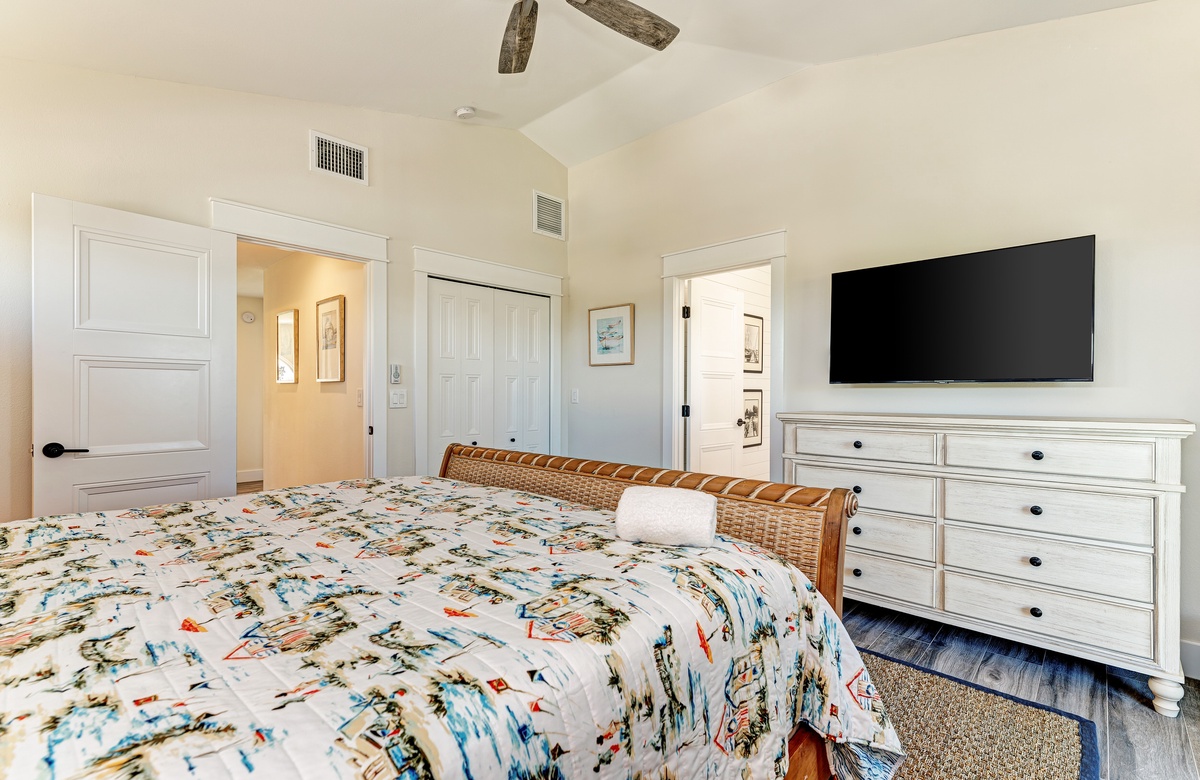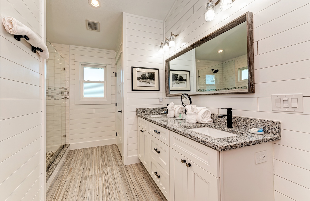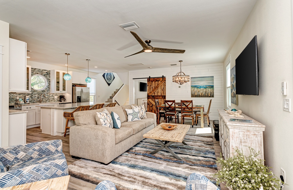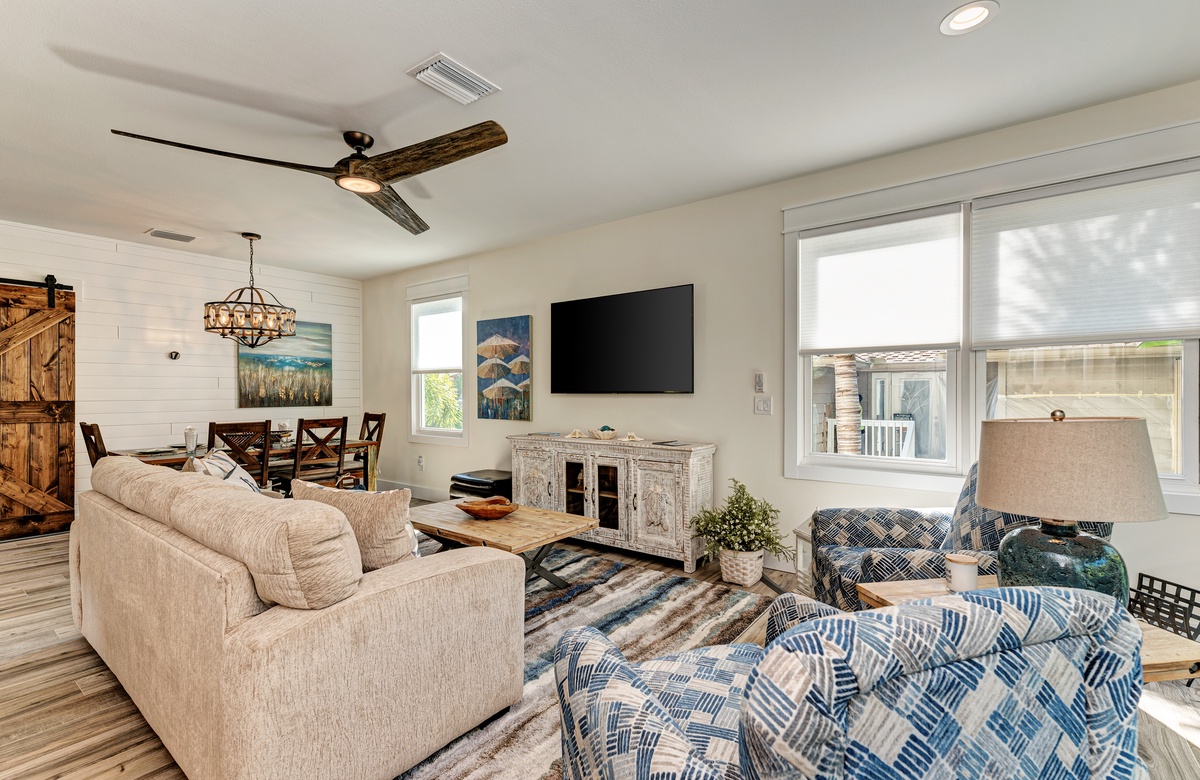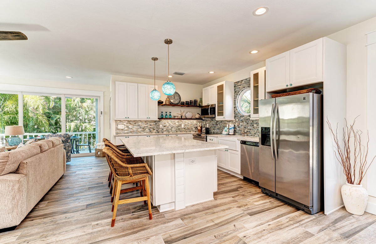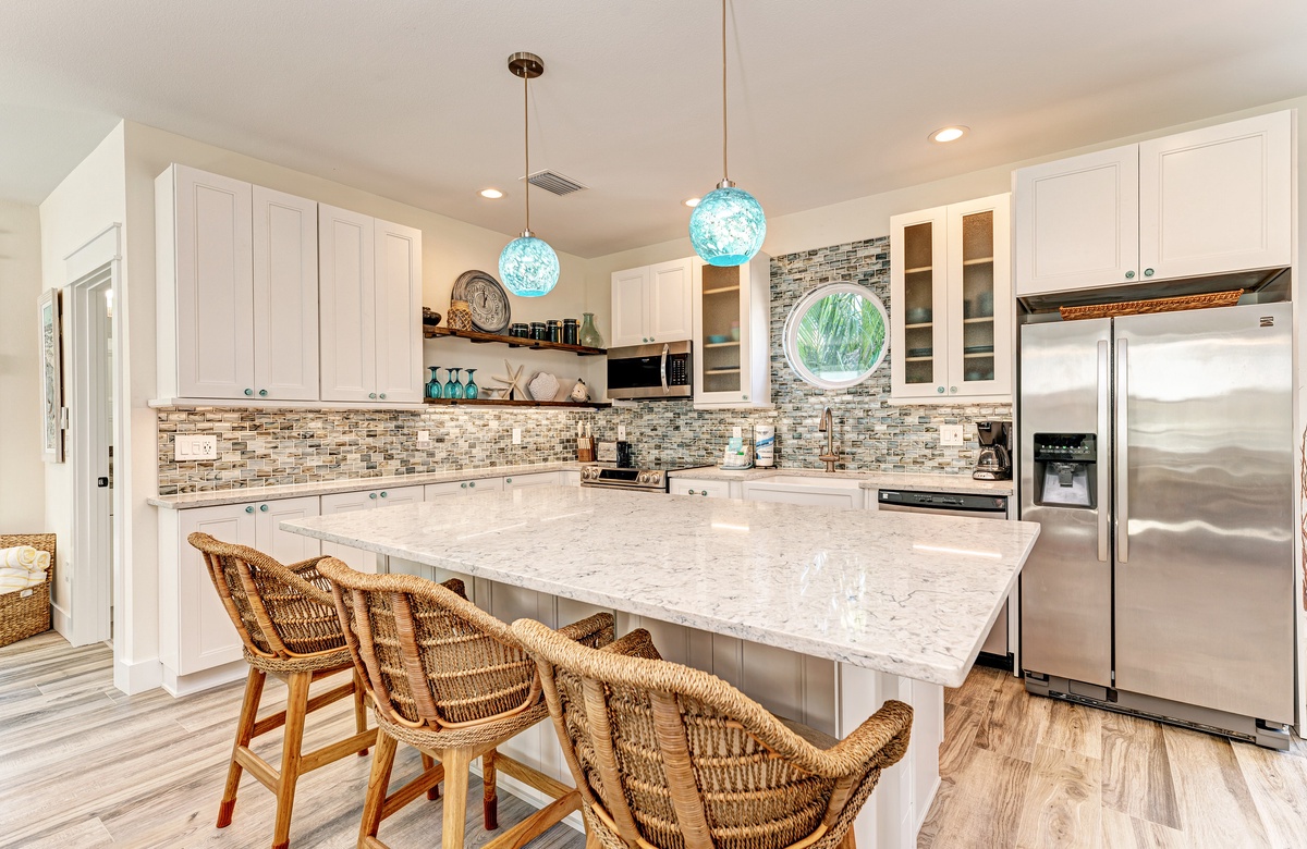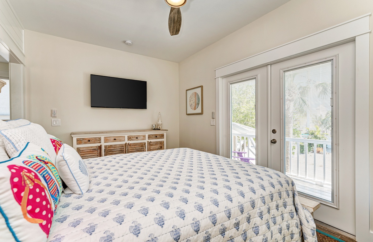 Der Hauptwohnbereich bietet einen offenen Grundriss mit Terrassen nach vorn und hinten im 1. Stock. Der Wohnbereich ist offen und beinhaltet die komplett ausgestattete Küche, das Wohnzimmer und Esszimmer. Oben beim Hauptschlafzimmer befinden sich Waschmaschine und Trockner. Drei der vier Schlafzimmer sind auf dem 2. Stock, inklusive des Hauptschlafzimmers. Das vierte Schlafzimmer ist auf der selben Ebene, wie der Wohnbereich und umfasst ein Badezimmer bei der Küche, welches für Gäste gut erreichbar ist. Dieses private Haus westlich des Gulf Drive beherbergt bequem bis zu 8 Personen mit einem Kingsize-Bett im Hauptschlafzimmer, einem Queensize-Bett im zweiten Schlafzimmer und einer zweiter Schlafzimmer-Suite mit ebenfalls einem Kingsize-Bett im 2. Stock und einem Stockbett bestehend aus oben einem großen Einzelbett und darunter einem Queensize-Bett im 4. Schlafzimmer, welches perfekt für Kinder und Erwachsene ist!