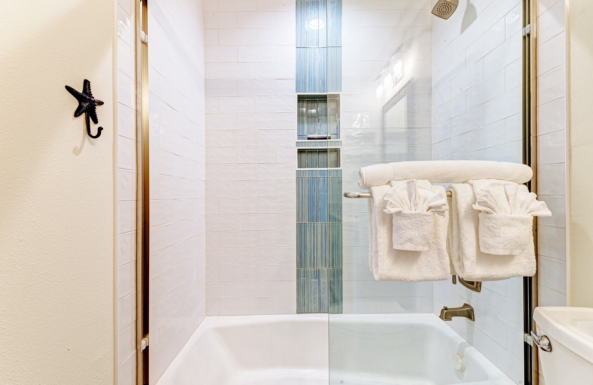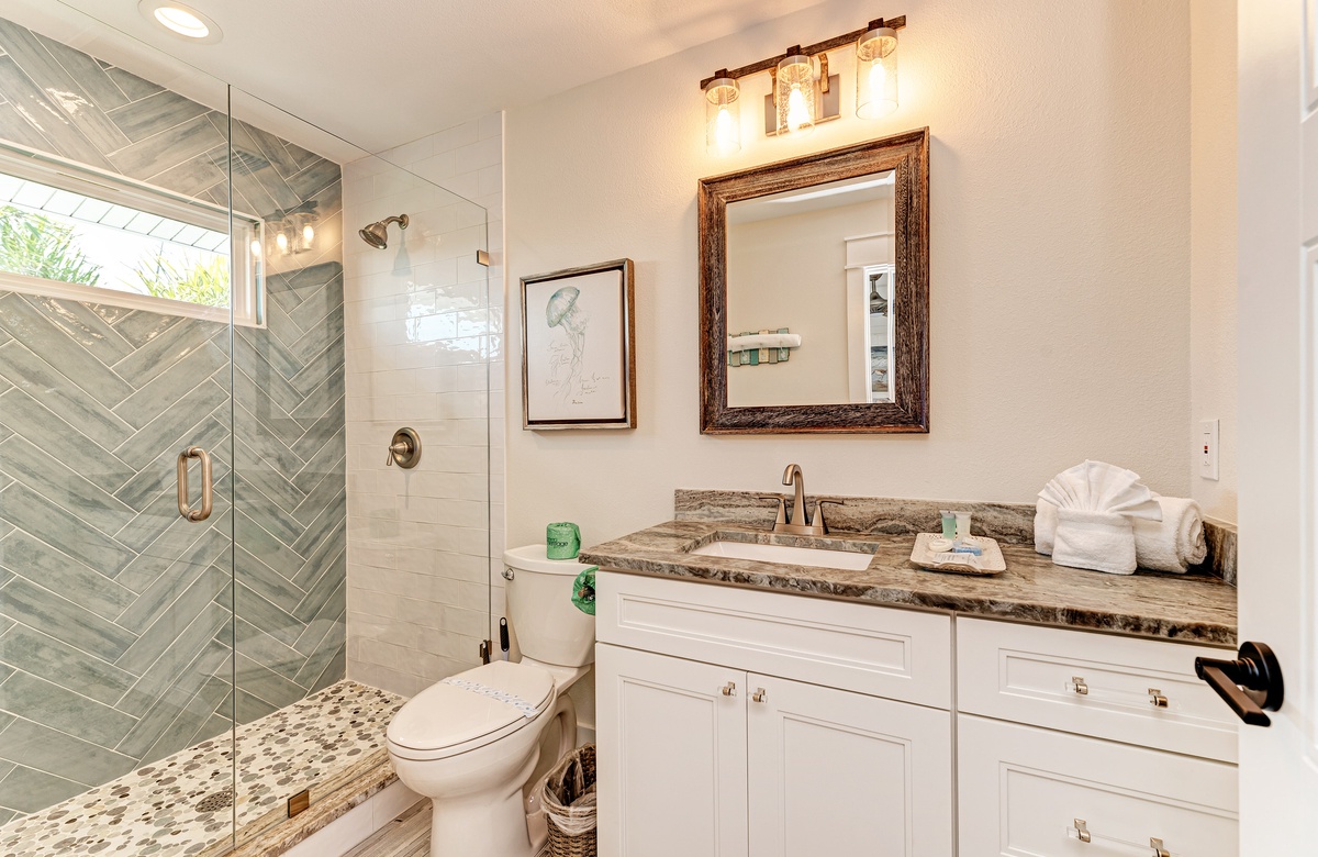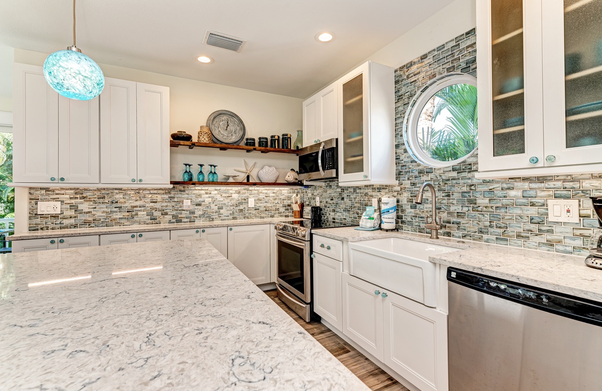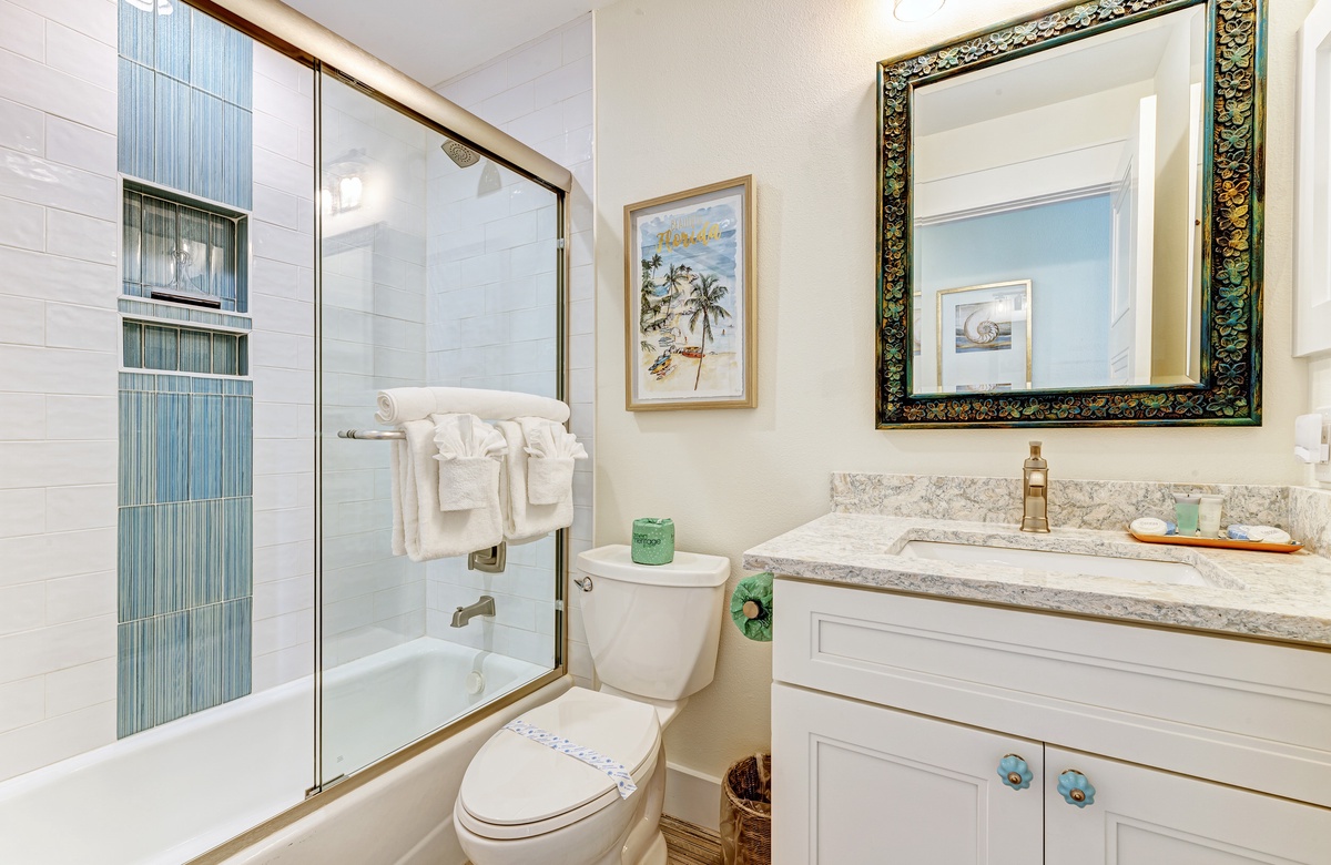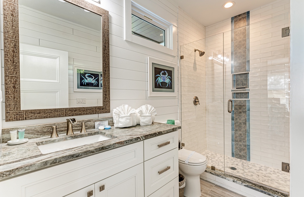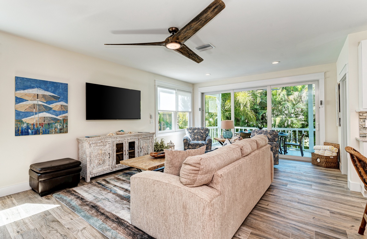 Der Hauptwohnbereich bietet einen offenen Grundriss mit Terrassen nach vorn und hinten im 1. Stock. Der Wohnbereich ist offen und beinhaltet die komplett ausgestattete Küche, das Wohnzimmer und Esszimmer. Oben beim Hauptschlafzimmer befinden sich Waschmaschine und Trockner. Drei der vier Schlafzimmer sind auf dem 2. Stock, inklusive des Hauptschlafzimmers. Das vierte Schlafzimmer ist auf der selben Ebene, wie der Wohnbereich und umfasst ein Badezimmer bei der Küche, welches für Gäste gut erreichbar ist. Dieses private Haus westlich des Gulf Drive beherbergt bequem bis zu 8 Personen mit einem Kingsize-Bett im Hauptschlafzimmer, einem Queensize-Bett im zweiten Schlafzimmer und einer zweiter Schlafzimmer-Suite mit ebenfalls einem Kingsize-Bett im 2. Stock und einem Stockbett bestehend aus oben einem großen Einzelbett und darunter einem Queensize-Bett im 4. Schlafzimmer, welches perfekt für Kinder und Erwachsene ist!