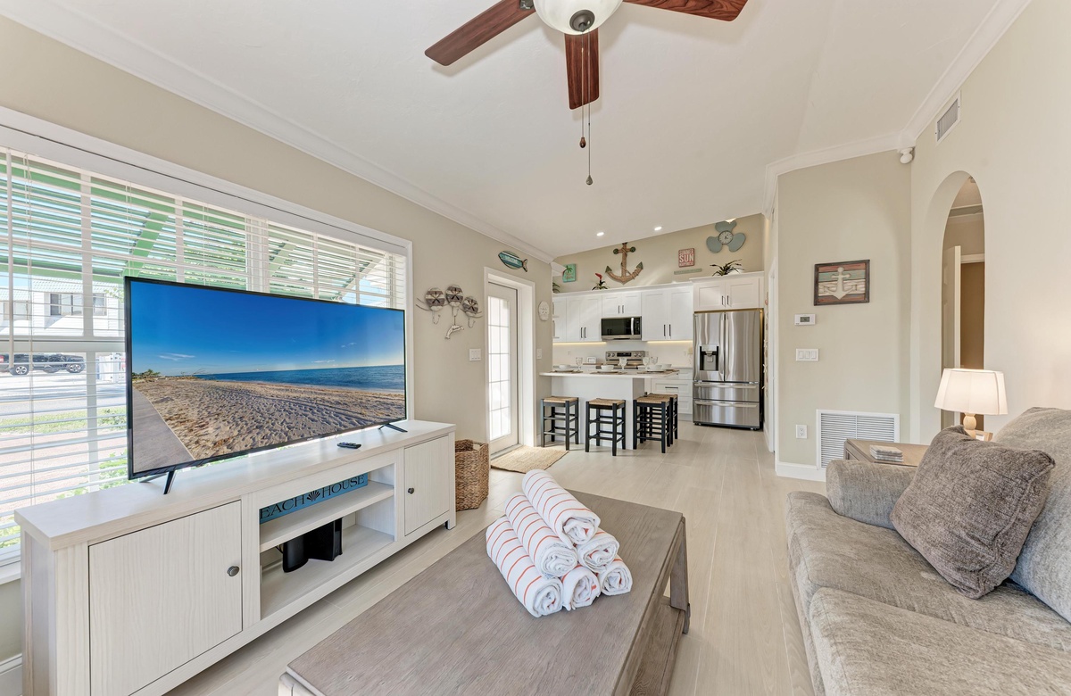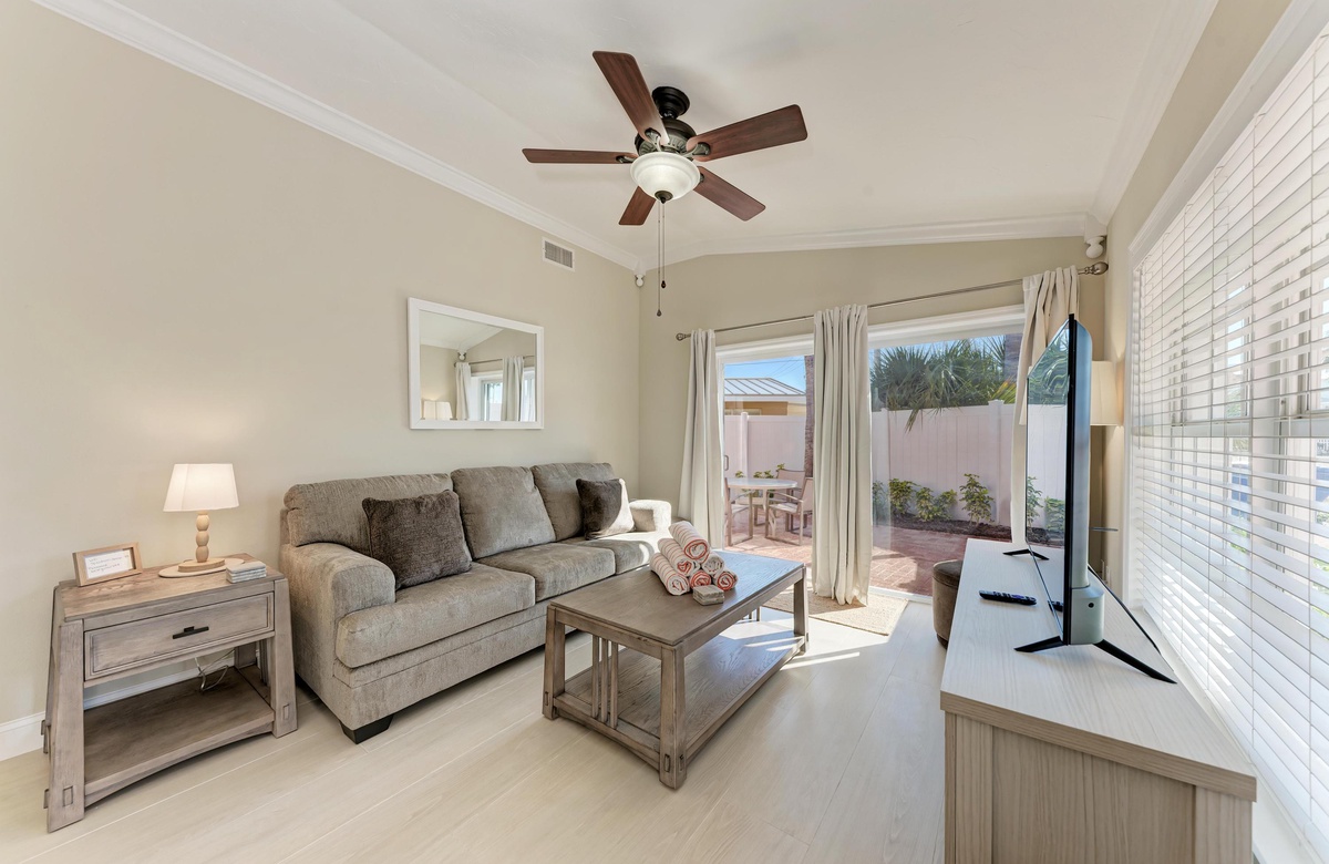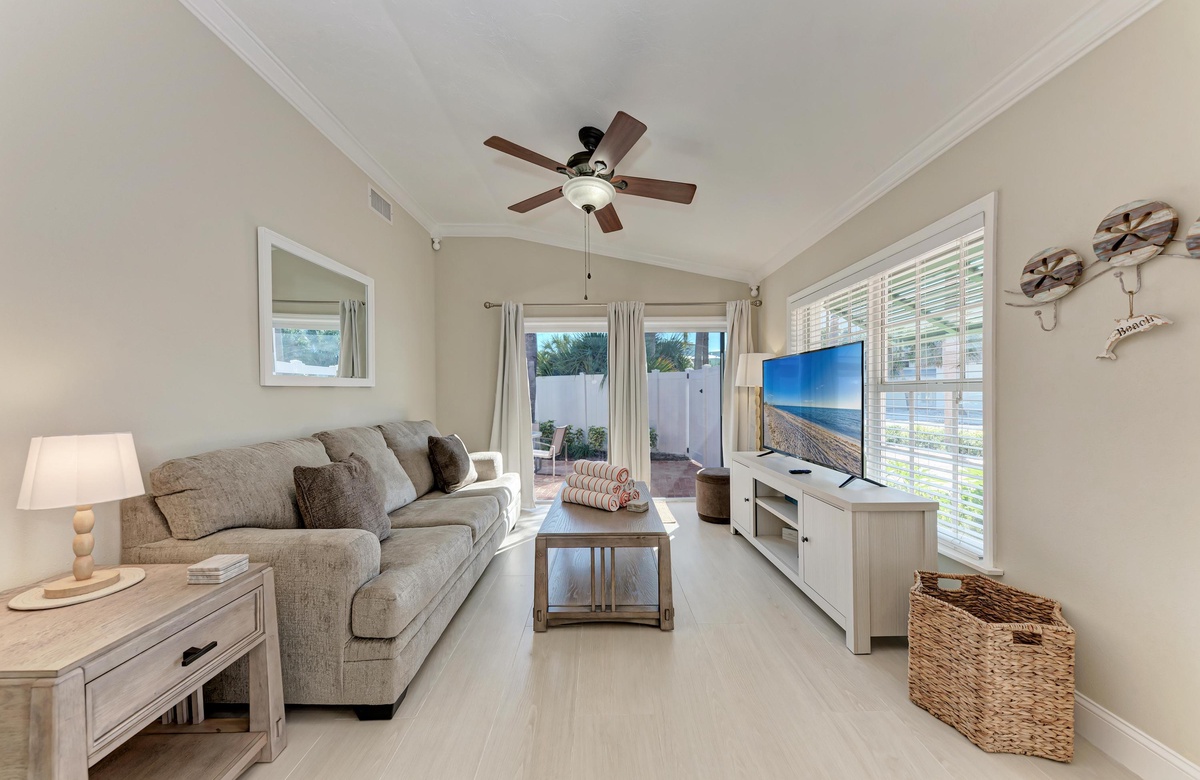Die wunderschön ausgestatteten Erdgeschoss-Wohnungen mit 2 Schlafzimmern und 2 Bädern haben ein Kingsize-Bett und ein Queensize-Bett mit einer zusätzlichen Doppel-Ausziehcouch, um eine Familie von 6 bequem unterzubringen. Die voll ausgestattete, erneuerte Küche hat alles, was Sie für das perfekte Frühstück, Mittag-oder Abendessen benötigen, sofern Sie gern daheim essen. Der offene Wohnbereich ist perfekt, um sich seine Lieblingsserien anzusehen oder mit kostenlosen Highspeed-WLAN zu surfen. Es gibt einen privaten eingezäunten Terrassenbereich, der das Essen im Freien zum Vergnügen werden lässt und vergessen Sie nicht den Gasgrill der Anlage zu benutzen.