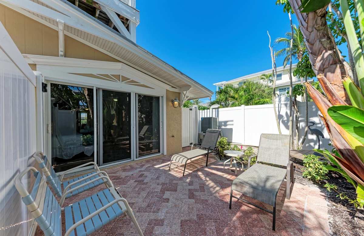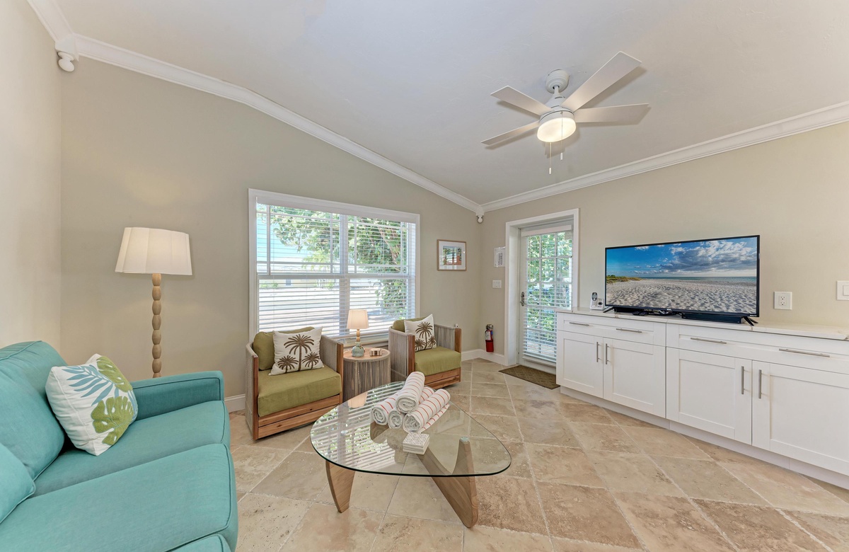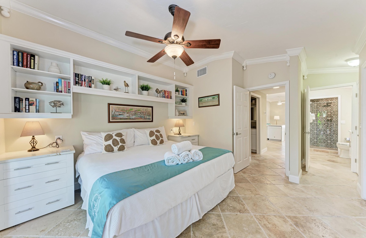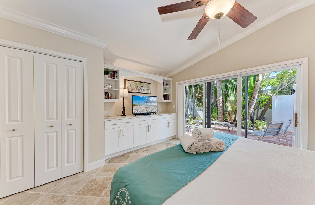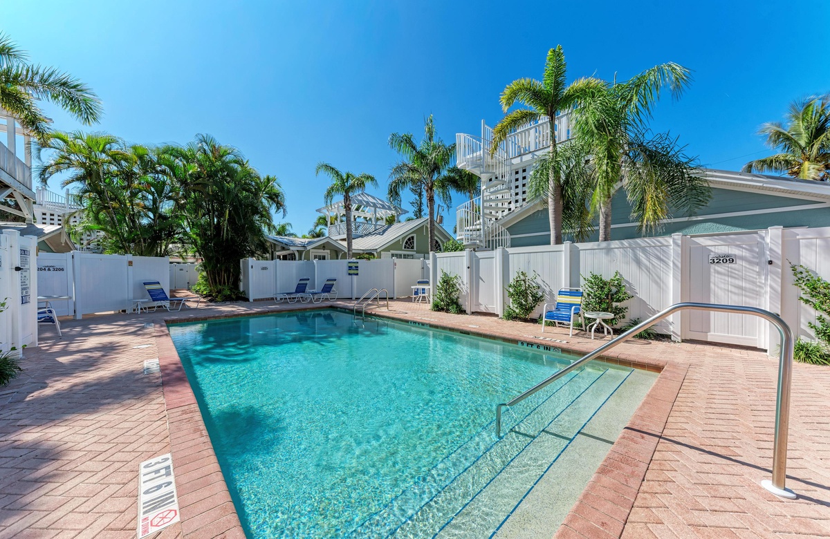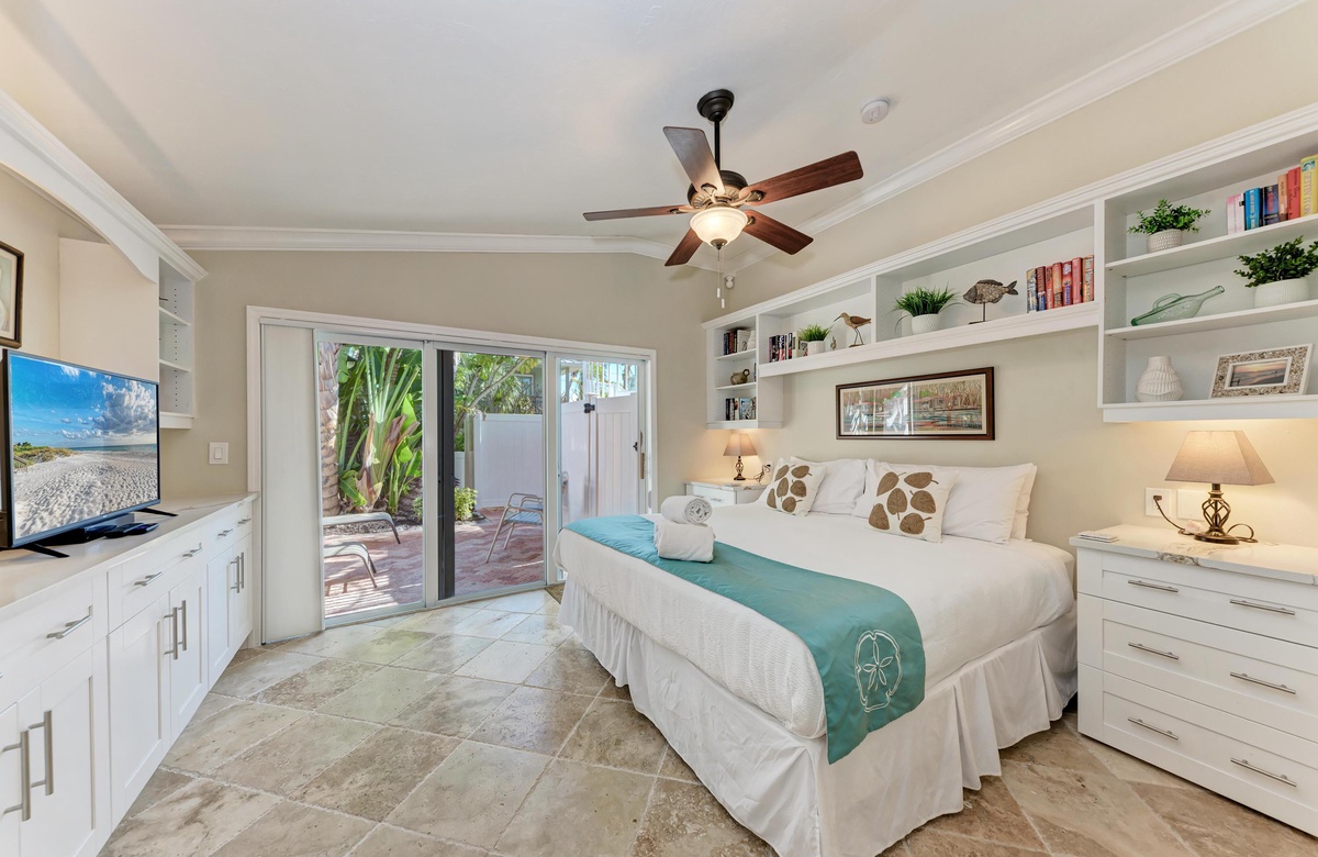 Diese Anna Maria Island Ferienwohnung bietet ein Schlafzimmer mit Kingsize-Bett von dem aus Sie die private Terrasse mit Liegestühlen erreichen. Hier können Sie wunderbar entspannen, während Sie in ein gutes Buch abtauchen, das Sie sich aus dem Bücherregal im Apartment ausgesucht haben. Das Grundstück verfügt über einen beheizten Gemeinschaftspool, der sich gleich hinter Ihrem Tor befindet. Zudem gibt es auf jedem Dach ein kleine Dachterrasse. Erklimmen Sie die Wendeltreppe und verlieren Sie sich dort in dem ausgedehnten Wasserblick und traumhaften Sonnenuntergängen. Jede erdenkliche Ausstattung macht Ihren Aufenthalt zum Vergnügen, von der begehbaren Dusche bis hin zur Waschmaschine & Trockner. Von der komplett ausgestatteten Küche aus, können Sie die Schiebetüren öffnen und Ihr Frühstück oder einen Grillabend draußen auf Ihrer privaten Terrasse einnehmen.