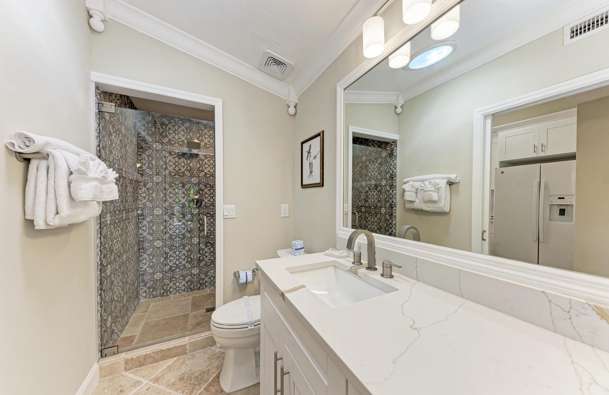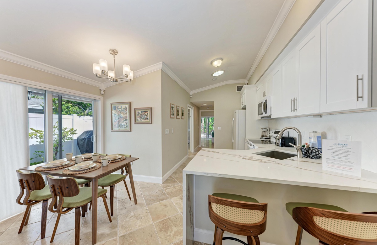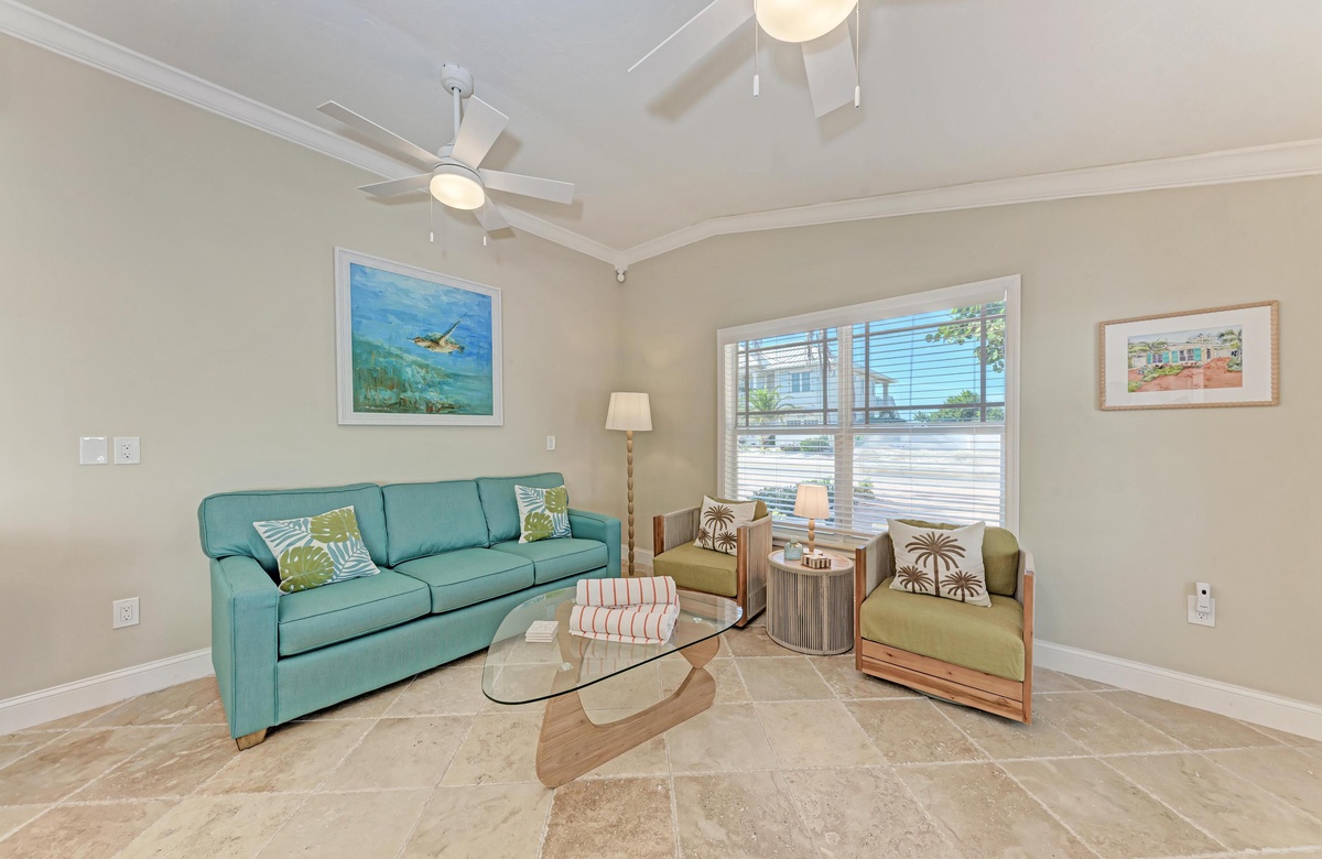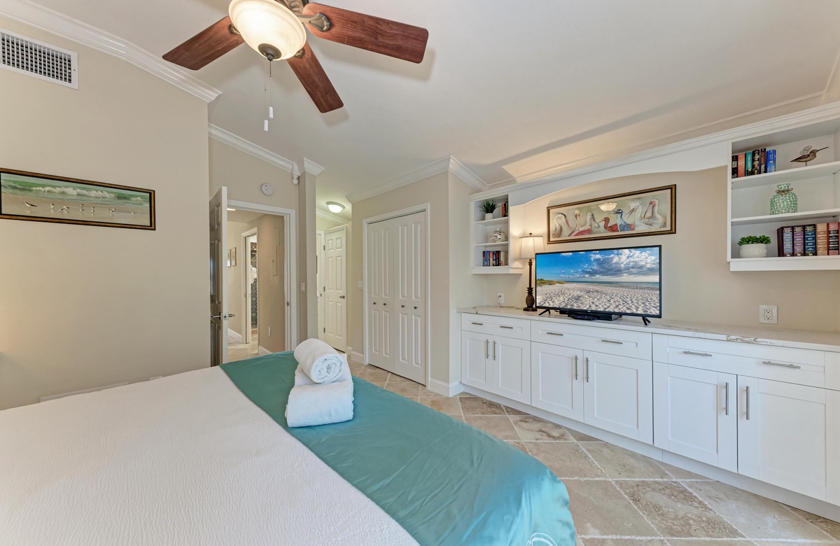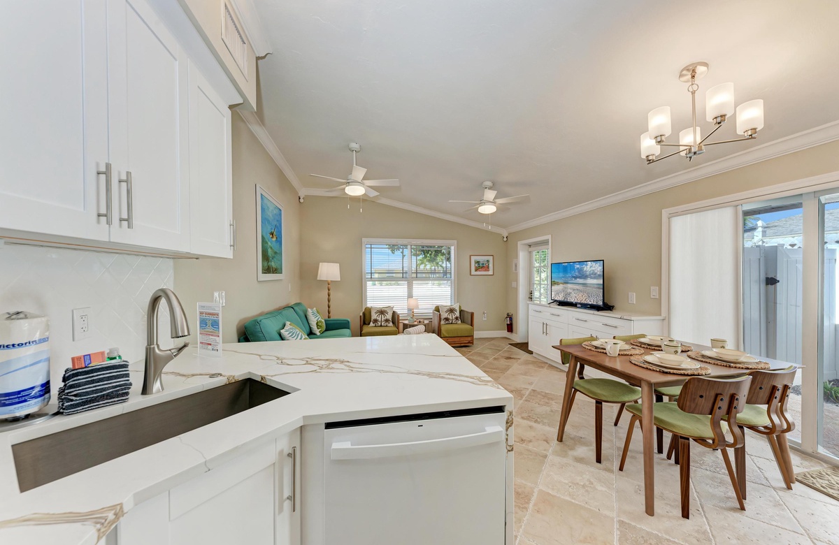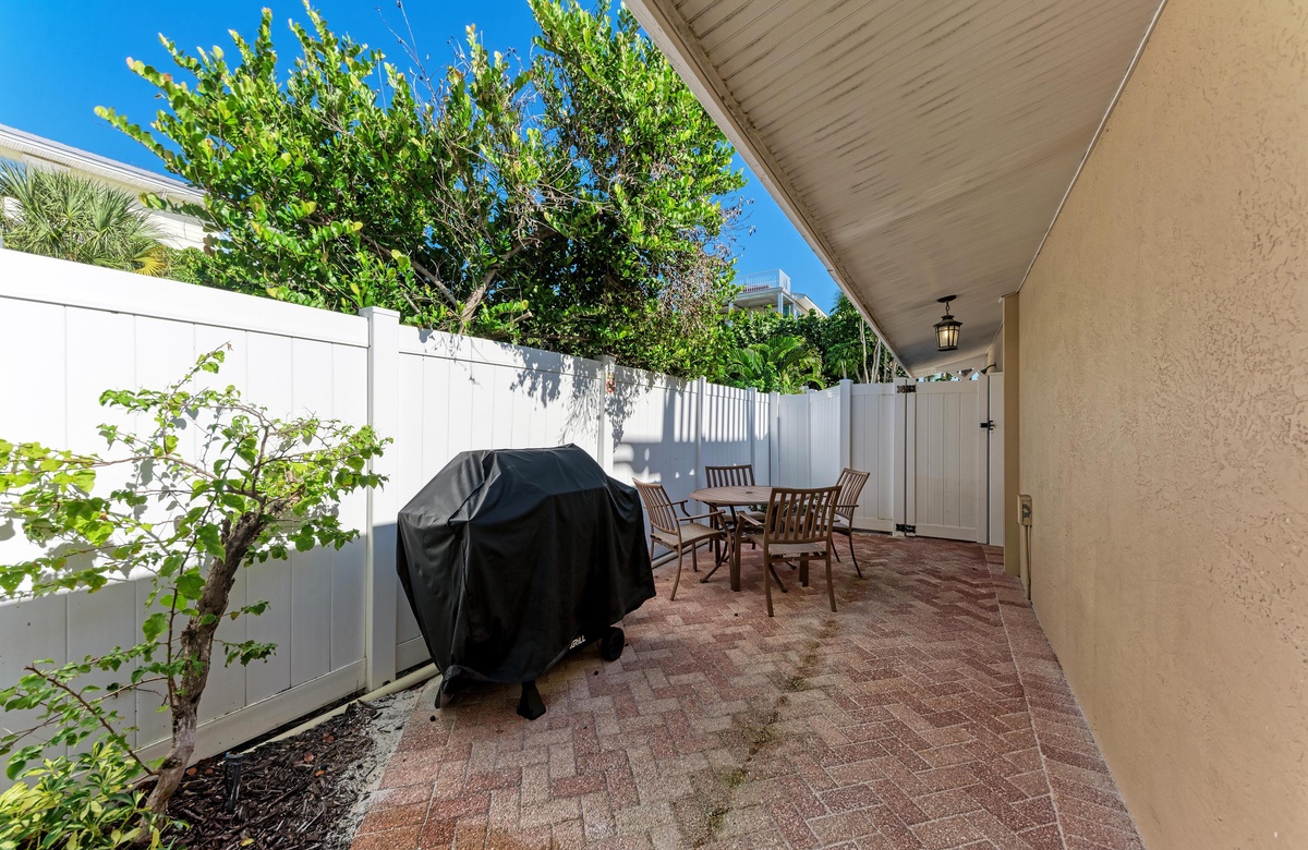 Diese Anna Maria Island Ferienwohnung bietet ein Schlafzimmer mit Kingsize-Bett von dem aus Sie die private Terrasse mit Liegestühlen erreichen. Hier können Sie wunderbar entspannen, während Sie in ein gutes Buch abtauchen, das Sie sich aus dem Bücherregal im Apartment ausgesucht haben. Das Grundstück verfügt über einen beheizten Gemeinschaftspool, der sich gleich hinter Ihrem Tor befindet. Zudem gibt es auf jedem Dach ein kleine Dachterrasse. Erklimmen Sie die Wendeltreppe und verlieren Sie sich dort in dem ausgedehnten Wasserblick und traumhaften Sonnenuntergängen. Jede erdenkliche Ausstattung macht Ihren Aufenthalt zum Vergnügen, von der begehbaren Dusche bis hin zur Waschmaschine & Trockner. Von der komplett ausgestatteten Küche aus, können Sie die Schiebetüren öffnen und Ihr Frühstück oder einen Grillabend draußen auf Ihrer privaten Terrasse einnehmen.