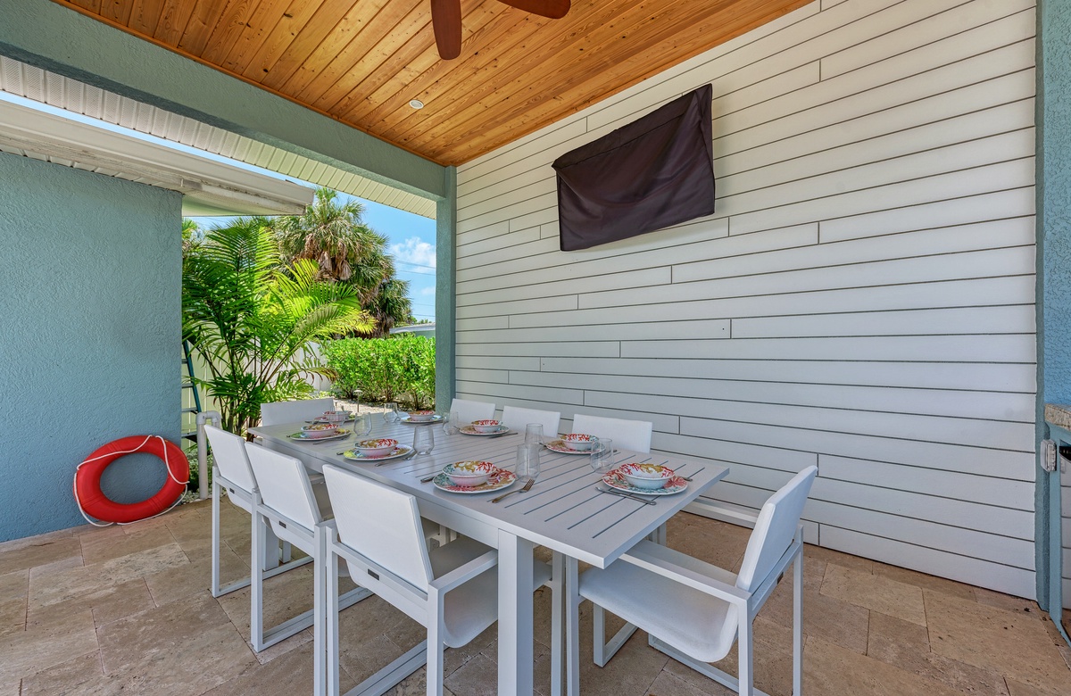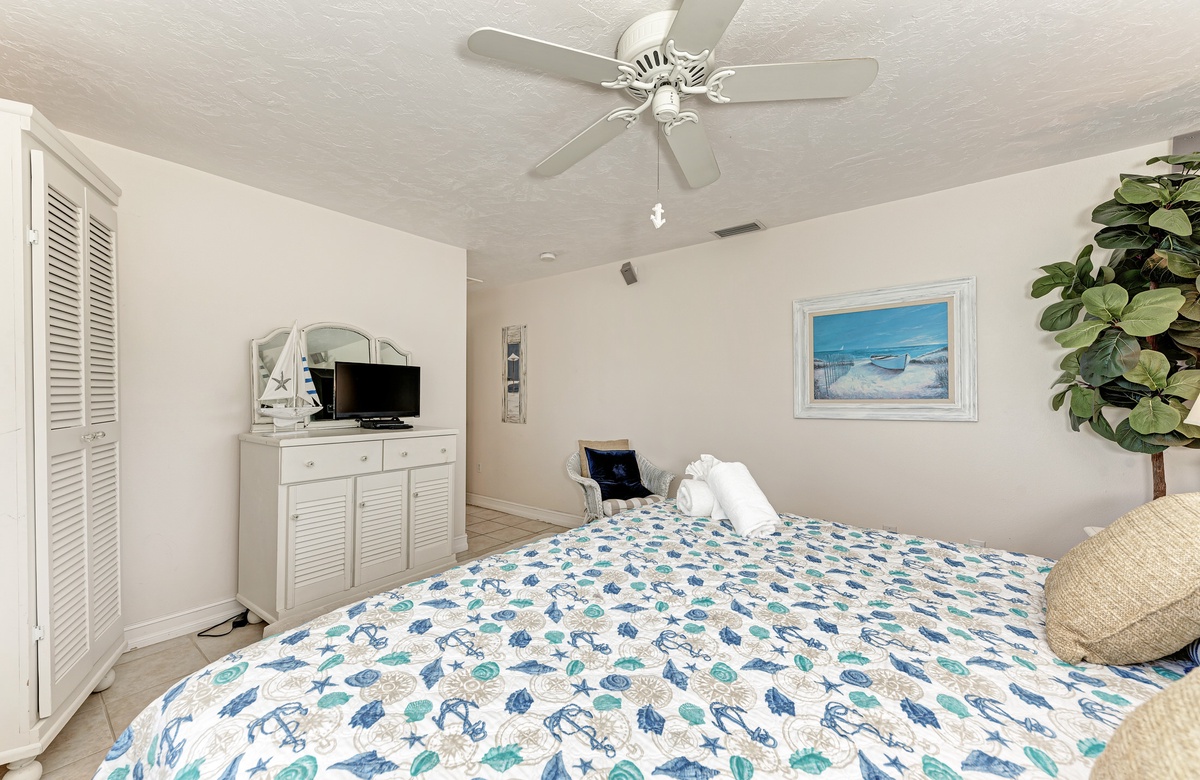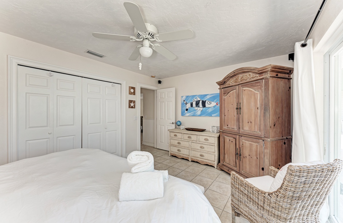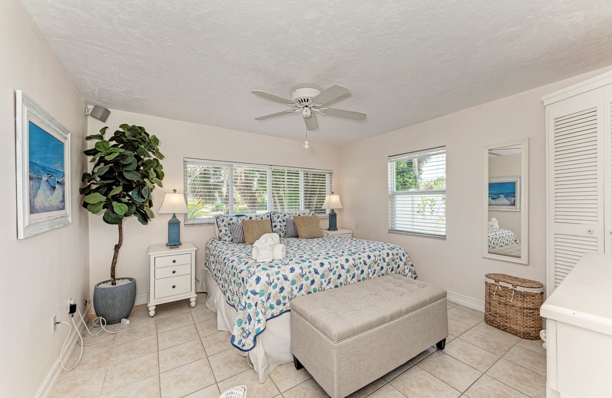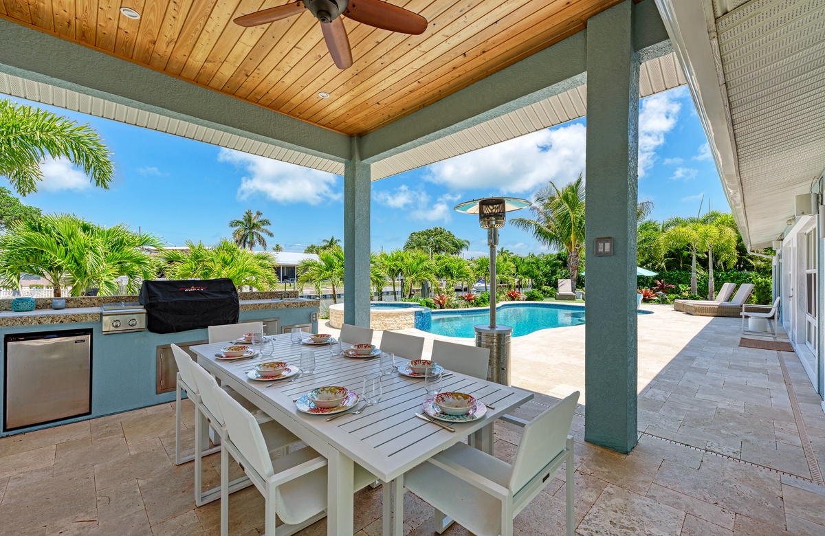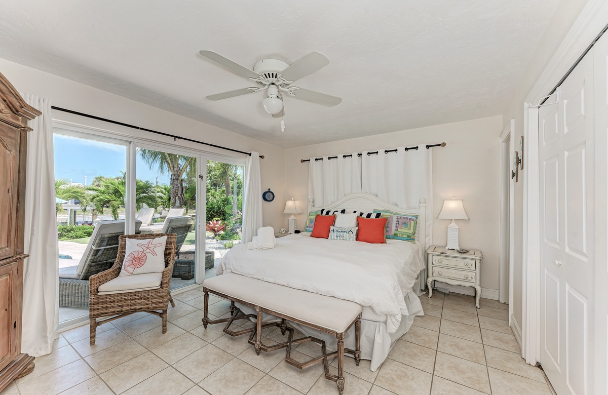 Im Wohnzimmer und den beiden Hauptschlafzimmer-Suiten stehen für Sie brandneue Designermöbel zur Verfügung. Von einem der Hauptschlafzimmer können Sie den Poolbereich betreten und den Blick auf das Wasser und die Bucht genießen. Außen haben Sie einen überdachten Essbereich mit Sitzgelegenheiten und einer maßgefertigten Außenküche sowie Grill, damit Sie das Inselleben auch ausgiebig genießen können.