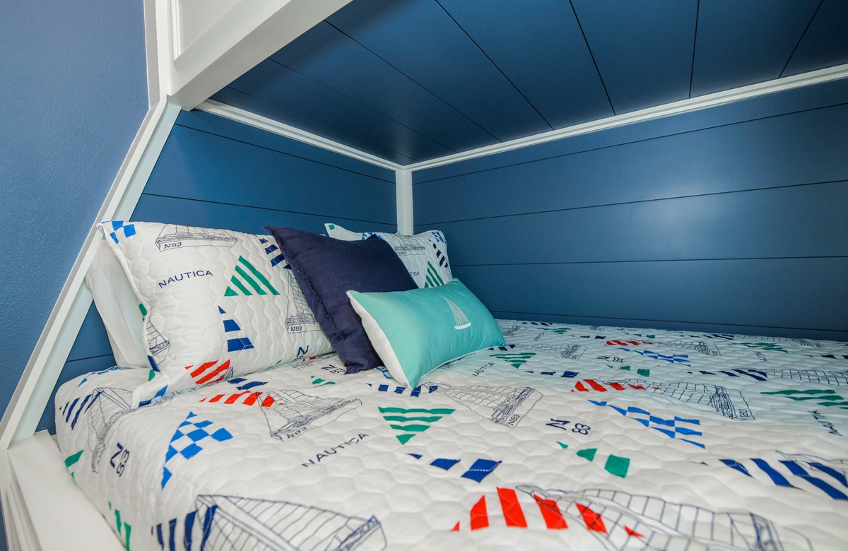 • Schlafzimmer 4: Stockbett bestehend aus Einzelbett oben und kleines Doppelbett unten, en-suite Bad mit Wannen-/Duschkombination