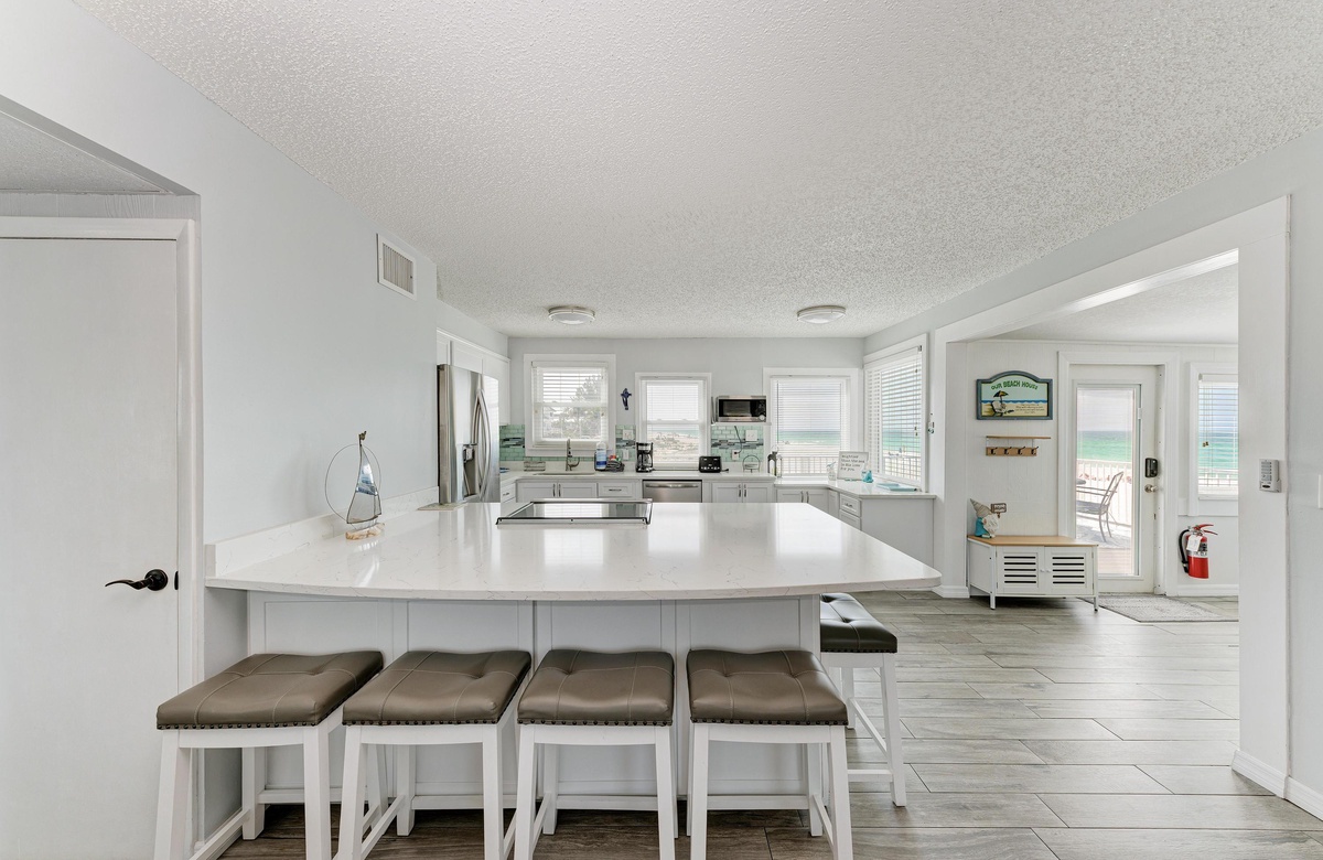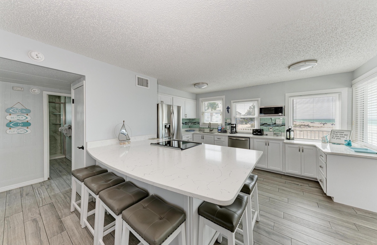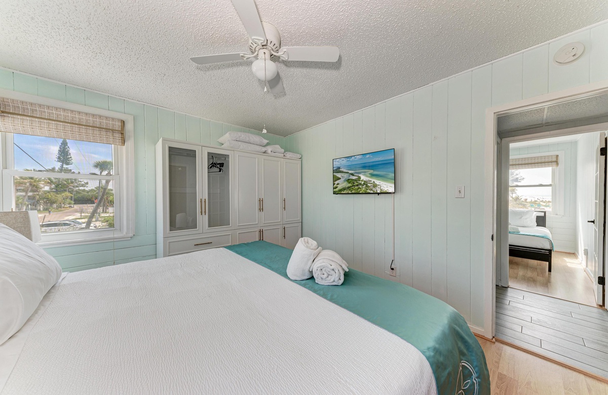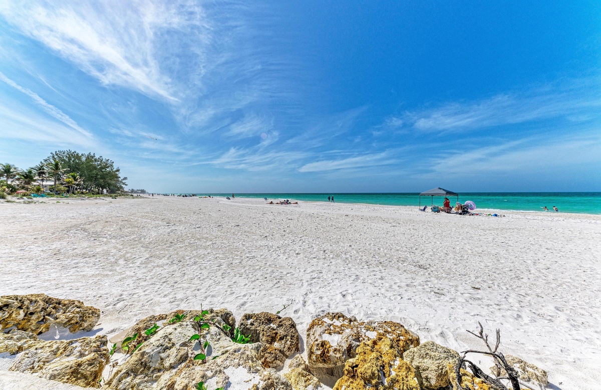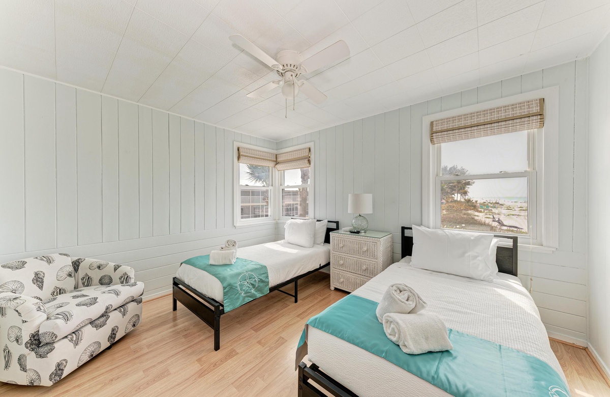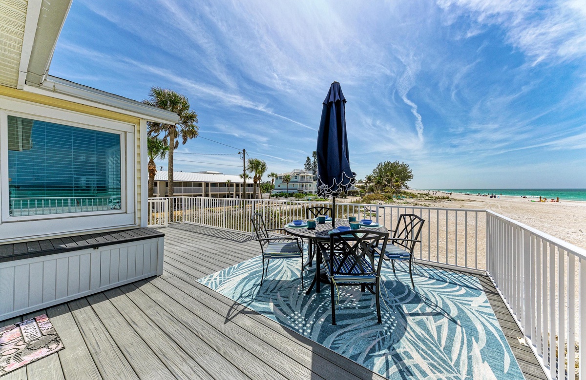 Der Innenbereich besticht durch eine farbenfrohe Einrichtung im Küstenstil und einladende Wohnbereiche, die sich perfekt für Familien oder kleine Gruppen eignen. Bleiben Sie dank kostenlosem WLAN in Verbindung, genießen Sie Filmabende mit zwei Flachbildfernsehern und einem DVD-Player oder bereiten Sie Ihre Lieblingsgerichte in der super ausgestatteten Küche zu. Draußen können Sie den Gasgrill anwerfen und ein gemütliches Barbecue auf der möblierten Terrasse genießen, während die warme Brise vom Golf über Sie hinweg streicht. Mit unglaublicher Aussicht, direktem Strandzugang und dem Besten, was Anna Maria Island zu bieten hat, direkt vor der Haustür, heißt Sie dieses Refugium an der Küste herzlich willkommen.