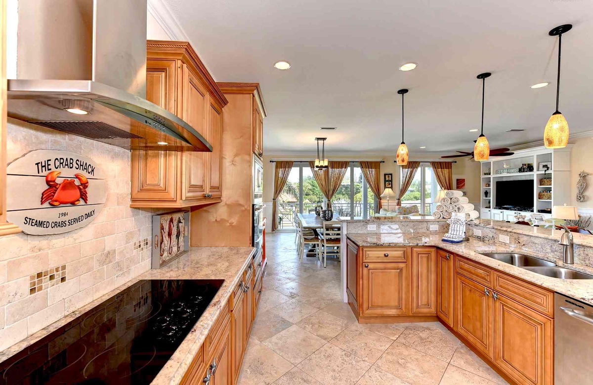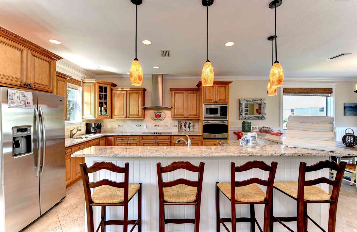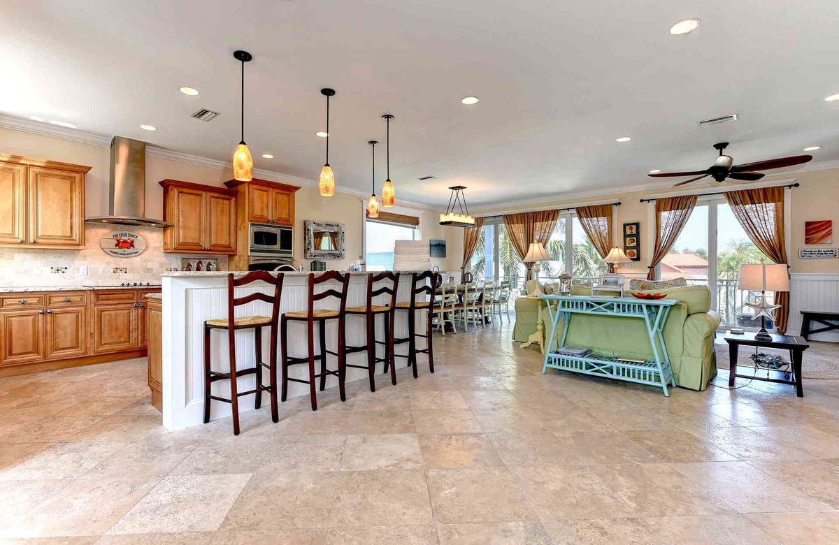 Küche, Ess- und Wohnbereich sind offen gestaltet, damit alle an einem Ort zusammen sein können. In der Küche gibt es Edelstahlgeräte, inklusive Geschirrspüler sowie vier Barhocker und Granit-Arbeitsplatten. Sitzen Sie zu viert an dem kleineren Frühstückstisch oder mit allen am großen Esstisch. Im Wohnzimmer finden Sie einen großen Flachbild-TV und einen nach vorne hin ausgerichteten Balkon, von dem aus Sie einen Blick auf den Golf von Mexiko erhaschen.