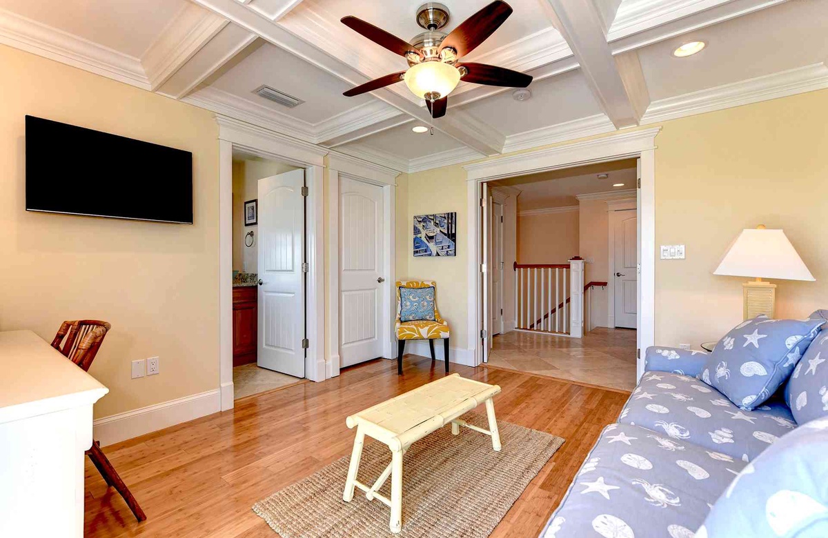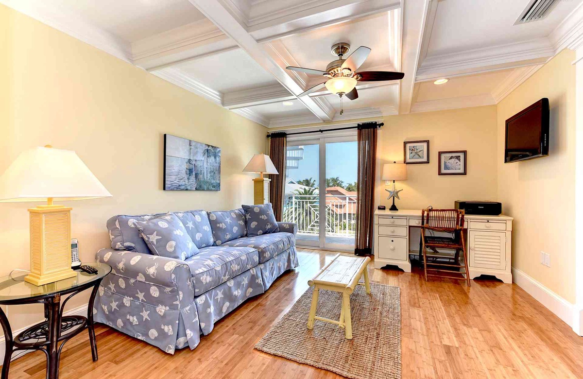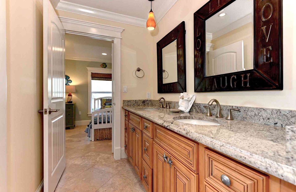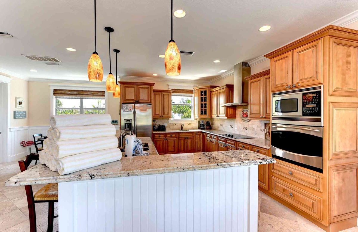 Küche, Ess- und Wohnbereich sind offen gestaltet, damit alle an einem Ort zusammen sein können. In der Küche gibt es Edelstahlgeräte, inklusive Geschirrspüler sowie vier Barhocker und Granit-Arbeitsplatten. Sitzen Sie zu viert an dem kleineren Frühstückstisch oder mit allen am großen Esstisch. Im Wohnzimmer finden Sie einen großen Flachbild-TV und einen nach vorne hin ausgerichteten Balkon, von dem aus Sie einen Blick auf den Golf von Mexiko erhaschen.