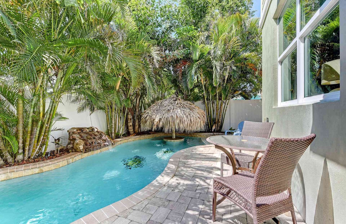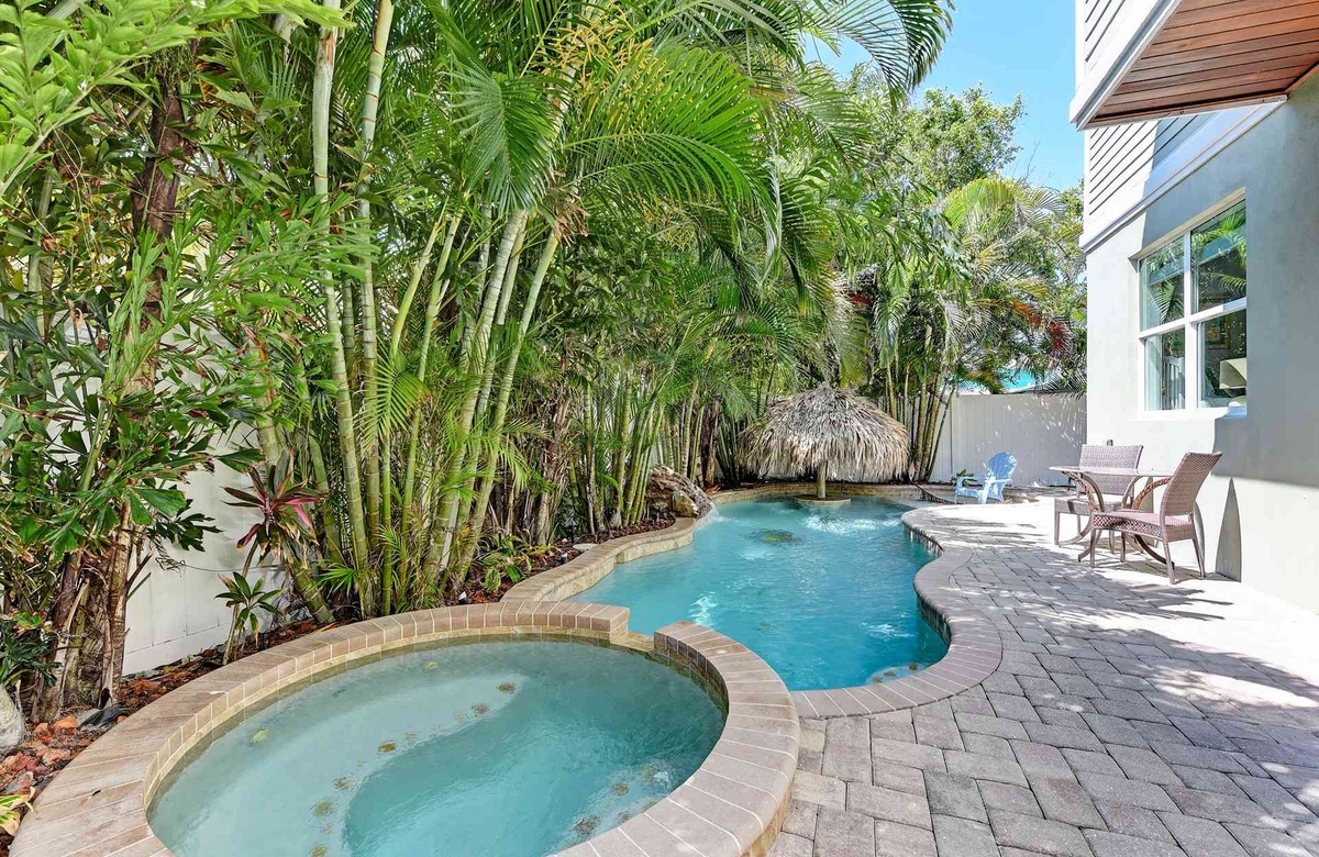 Im Garten des Ferienhauses verlieben Sie sich in den grandiosen Spa und beheizten Pool mit einem lustigen Sonnenschirm. Erholen Sie sich in den komfortablen Terrassenmöbeln unter üppiger und gepflegter Vegetation. Praktischer Weise gibt es sogar ein Bad direkt am Pool. Diese Gartenoase mit dem Grasgrill ist perfekt für ein typisches amerikanisches Barbecue.