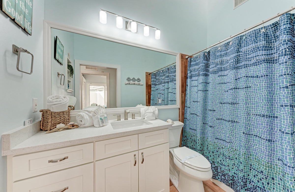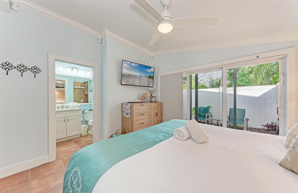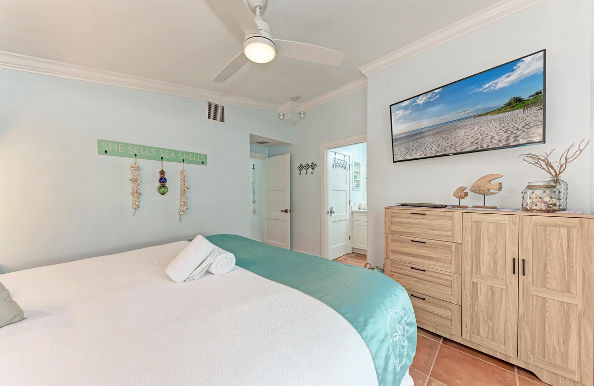 Im Inneren von Star Fisch Beach 2 finden Sie genug Platz, um komfortabel vier Gäste in den zwei Schlafzimmern und zwei Bädern unterzubringen. Beide Schlafzimmer bieten Premiumwäsche in Hotelqualität, Zugang zum Terrassenbereich und Flachbild-TVs. Das Hauptschlafzimmer verfügt über ein Queensize-Bett und einem Hauptbadezimmer mit einer begehbaren Dusche. Das Gästezimmer hat ebenfalls ein Queensize-Bett. Das Bad ist im Gang gleich beim Gästezimmer und bietet eine Wannen-/Duschkombination.