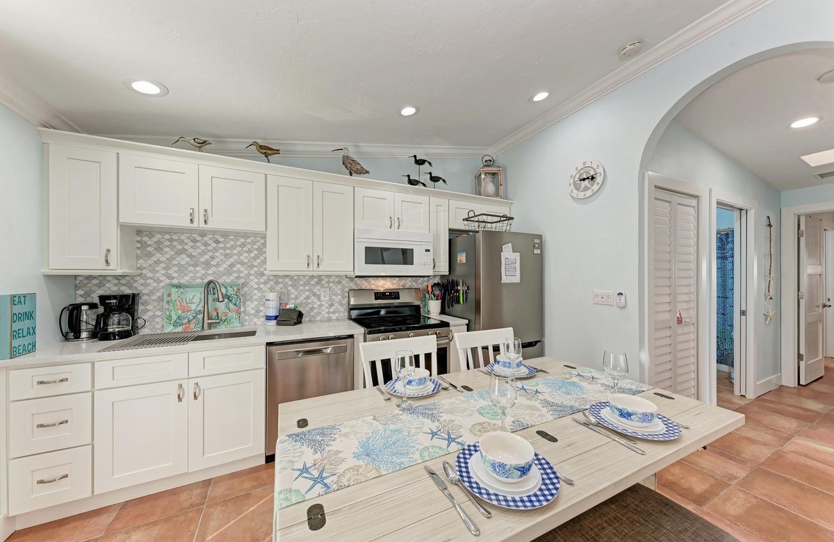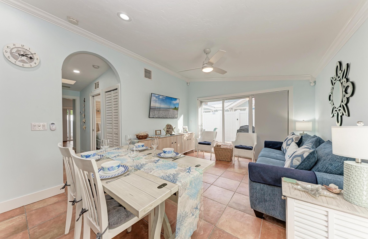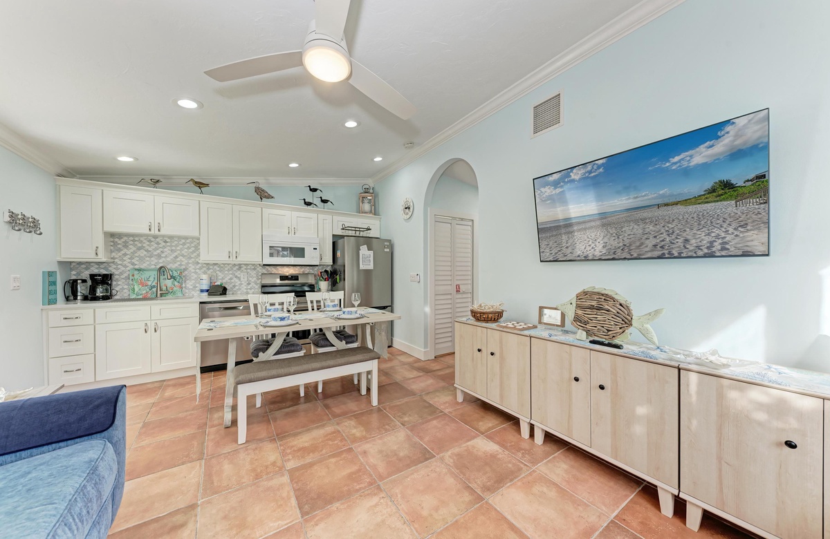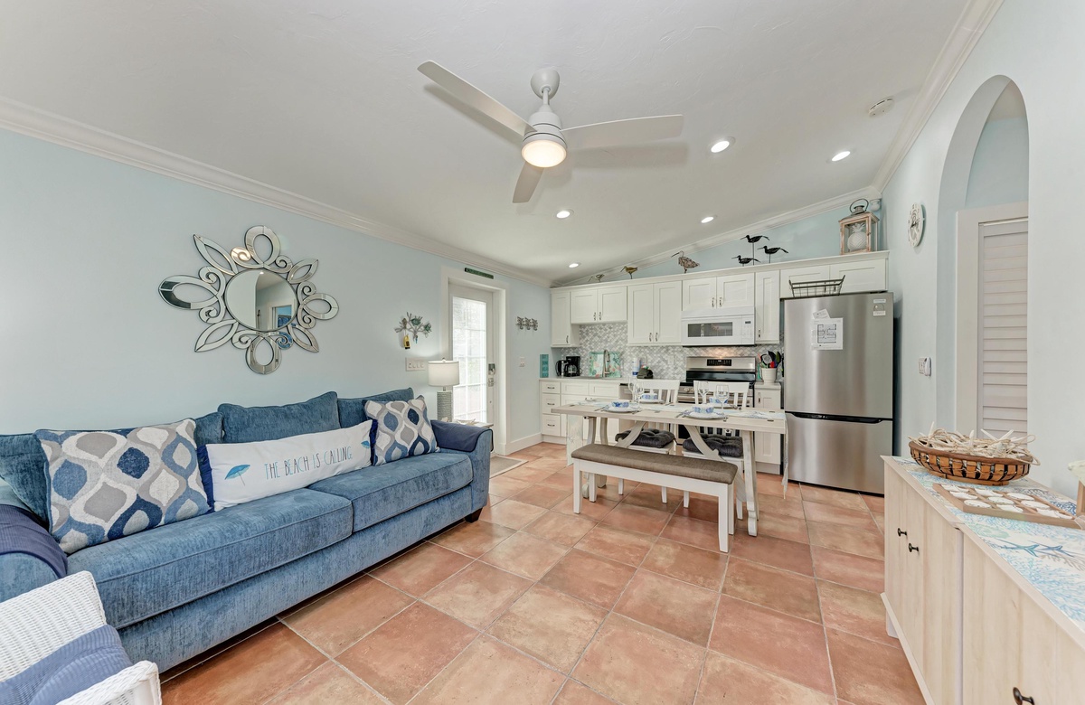 Der Wohnbereich in diesem Anna Maria Island Ferienhaus ist gemütlich und dennoch offen und hat eine Ausziehcouch. Die hohen Decken und das coole blaue Dekor geben dem Raum eine luftige Atmosphäre. Jeder wird sich hier wohl und entspannt fühlen. Die Küche hat wunderschöne Arbeitsflächen und Fliesenspiegel mit allen Utensilien, die Sie für die Zubereitung eines guten Essens brauchen. Und einen Geschirrspüler gibt es auch!