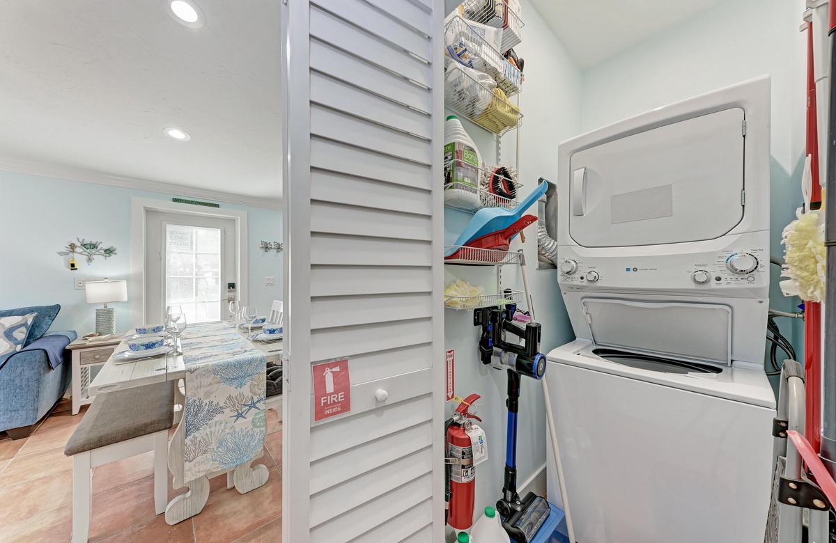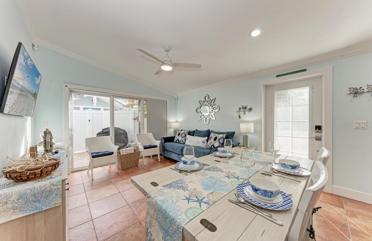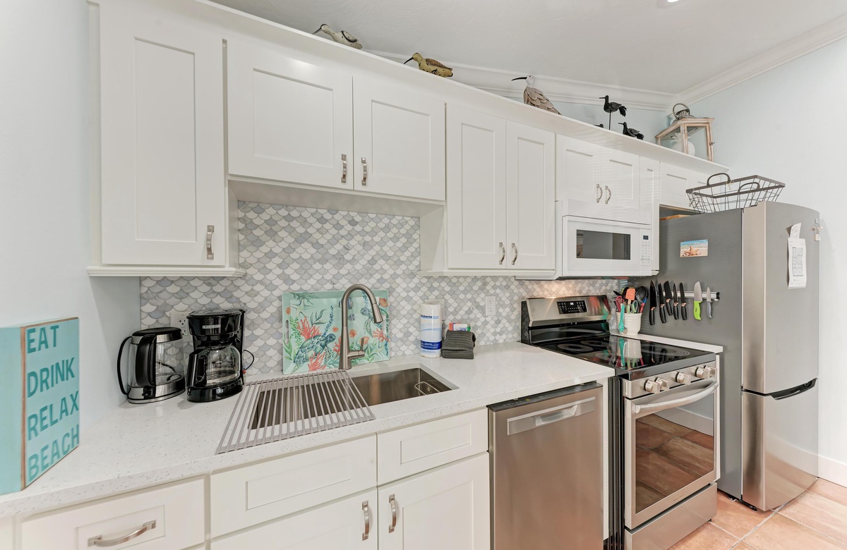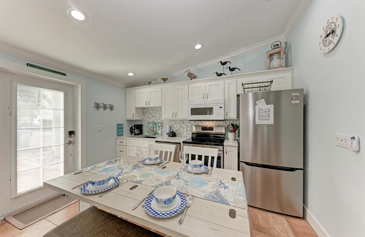 Der Wohnbereich in diesem Anna Maria Island Ferienhaus ist gemütlich und dennoch offen und hat eine Ausziehcouch. Die hohen Decken und das coole blaue Dekor geben dem Raum eine luftige Atmosphäre. Jeder wird sich hier wohl und entspannt fühlen. Die Küche hat wunderschöne Arbeitsflächen und Fliesenspiegel mit allen Utensilien, die Sie für die Zubereitung eines guten Essens brauchen. Und einen Geschirrspüler gibt es auch!