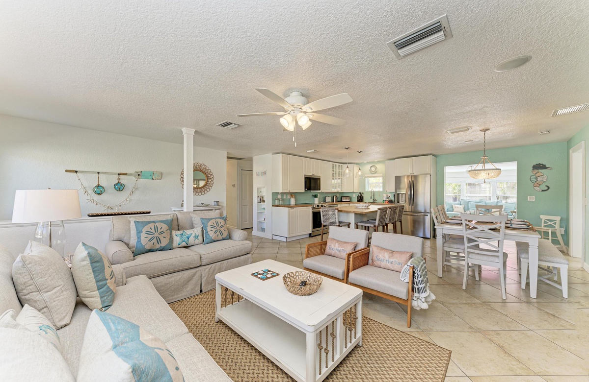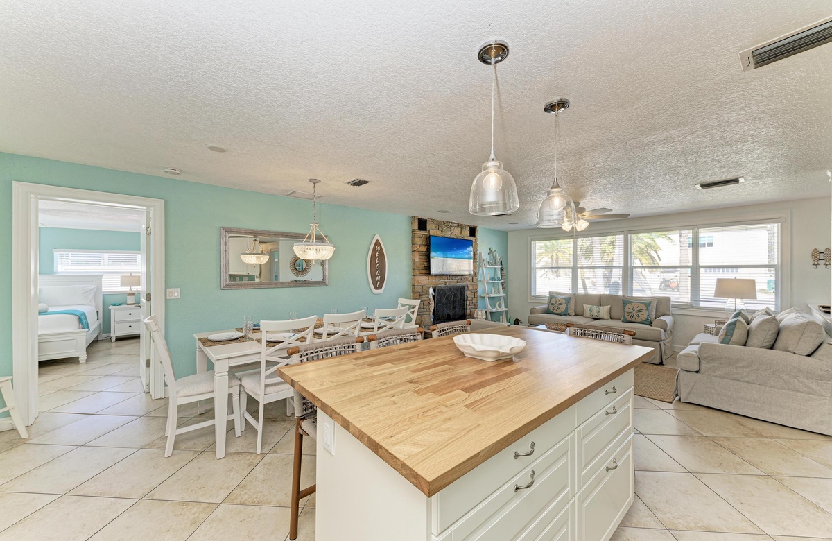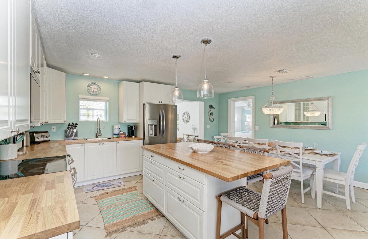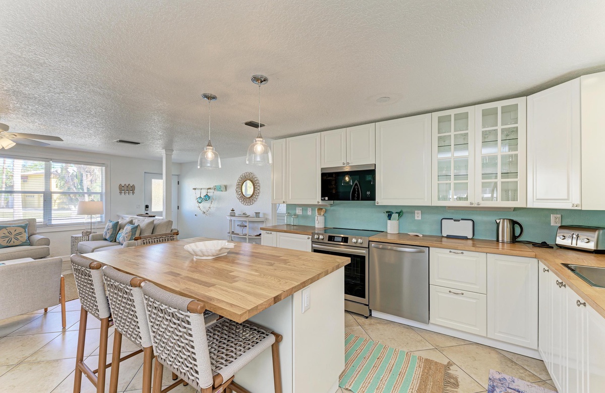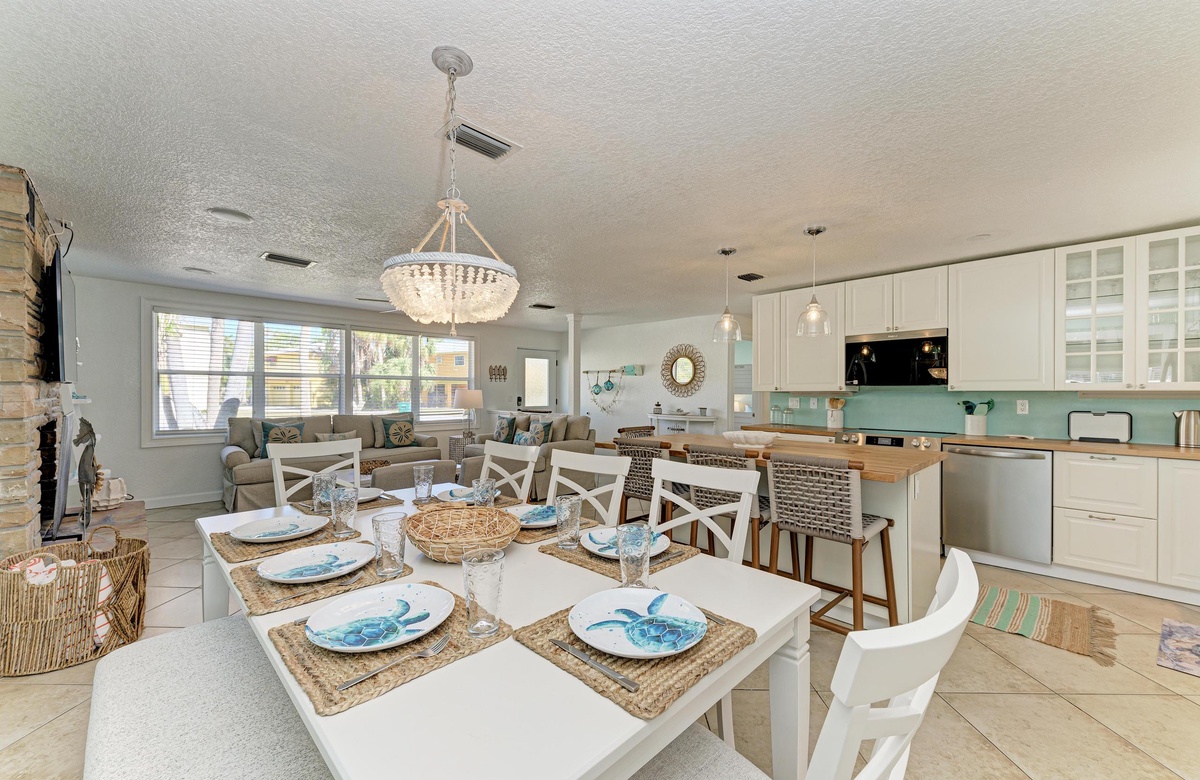 Der offene Grundriss von Küche, Wohn- und Essbereich sind im beruhigenden, Küstendekor gehalten und bieten ausreichend Platz für Ihre gesamte Familie. Küche und Esszimmer machen gemeinsames Essen mit der Familie zum Vergnügen! Die schicke Küche ist gut ausgestattet, inklusive der Edelstahlgeräte und Geschirrspülmaschine. Am Esstisch finden bis zu 10 Gäste Platz und zusätzlich vier an der Kücheninsel. Alle können hier bequem zusammenkommen!