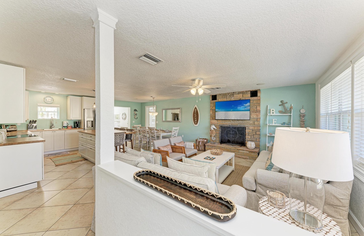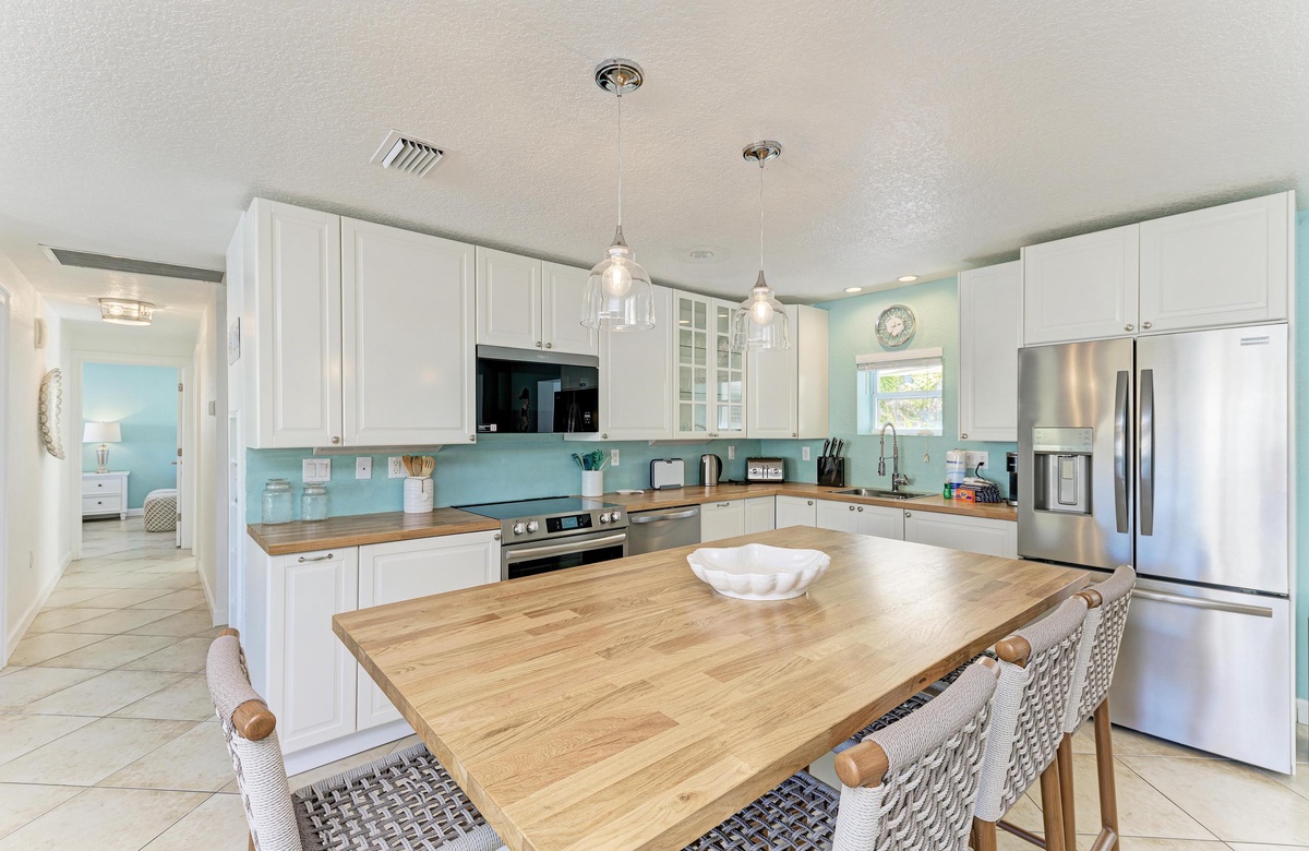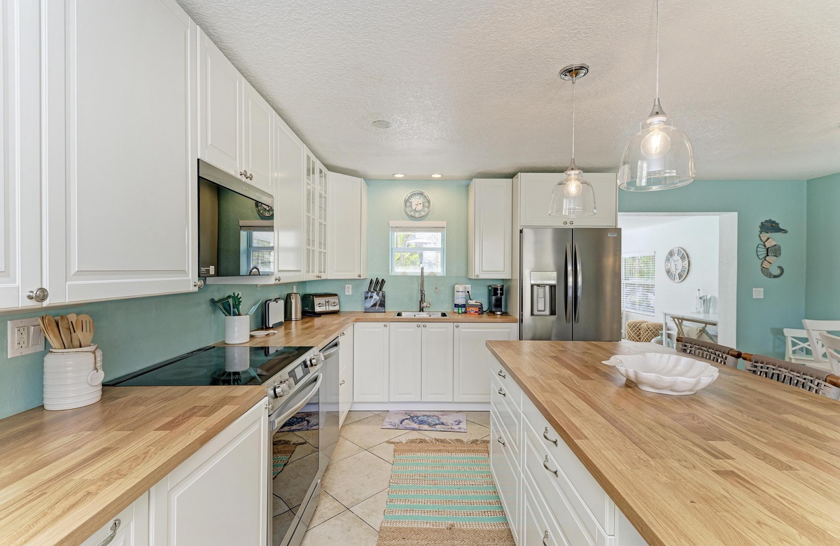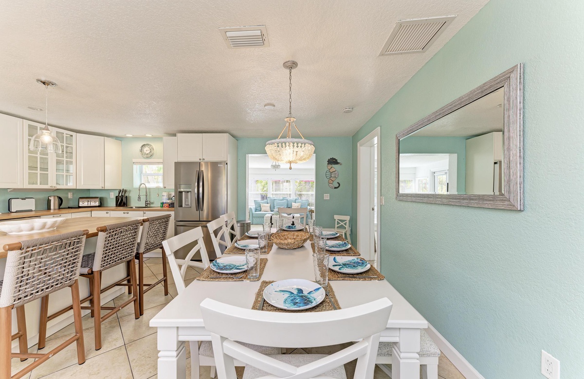 Der offene Grundriss von Küche, Wohn- und Essbereich sind im beruhigenden, Küstendekor gehalten und bieten ausreichend Platz für Ihre gesamte Familie. Küche und Esszimmer machen gemeinsames Essen mit der Familie zum Vergnügen! Die schicke Küche ist gut ausgestattet, inklusive der Edelstahlgeräte und Geschirrspülmaschine. Am Esstisch finden bis zu 10 Gäste Platz und zusätzlich vier an der Kücheninsel. Alle können hier bequem zusammenkommen!