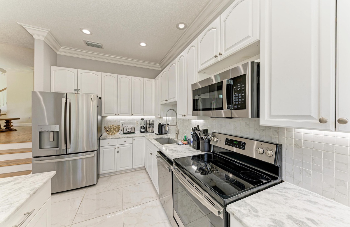 Nehmen Sie die Treppe oder den Aufzug zur Hauptebene des Hauses, wo Sie sofort Urlaubsstimmung verspüren werden. Dank der kürzlich erfolgten Renovierungen und Modernisierungen wird dieses Haus sicher bei allen Gästen beliebt sein. Betreten Sie das offene Wohn-/Esszimmer mit gemütlichen, hochwertigen Sitzgelegenheiten und einem Fernseher als Blickfang. Nur wenige Schritte entfernt befindet sich die voll ausgestattete Küche mit Edelstahlgeräten und einer Arbeitsfläche mit Essbereich für vier Personen. Am Abend können Sie Vorspeisen an der Kücheninsel und Mahlzeiten am großen Esstisch für 8 Personen genießen. Die Schlafzimmer empfangen Sie mit einer modernen Einrichtung in Beach-Flair– jedes verfügt über neue Deckenventilatoren, sanfte Beleuchtung und Designer-Akzente.