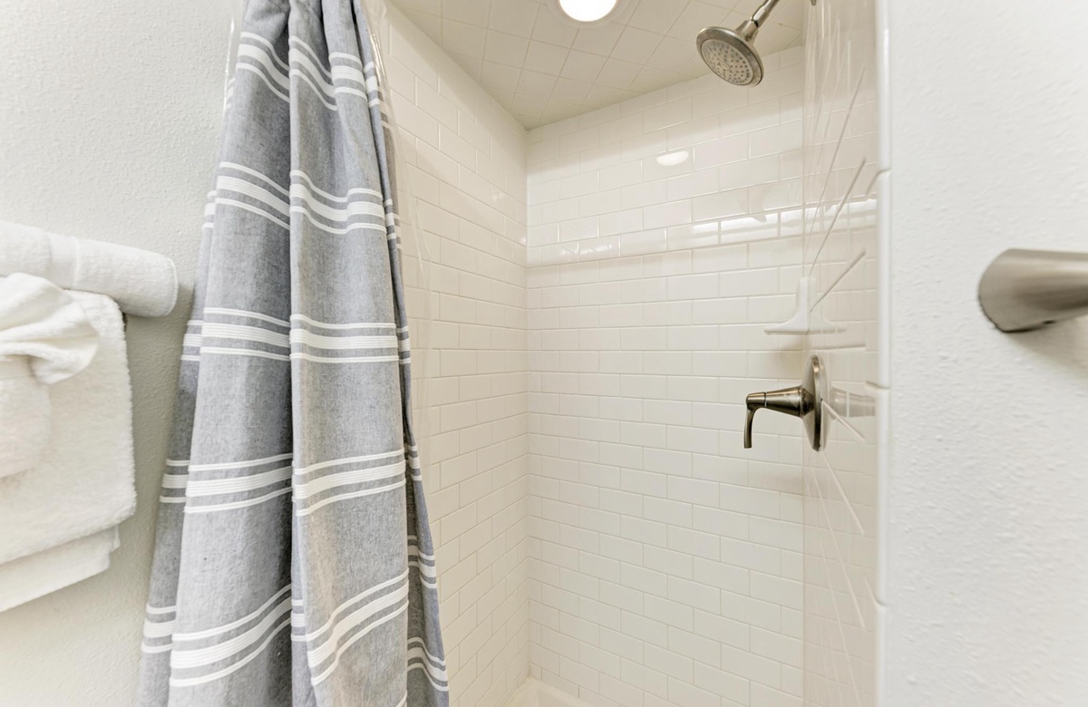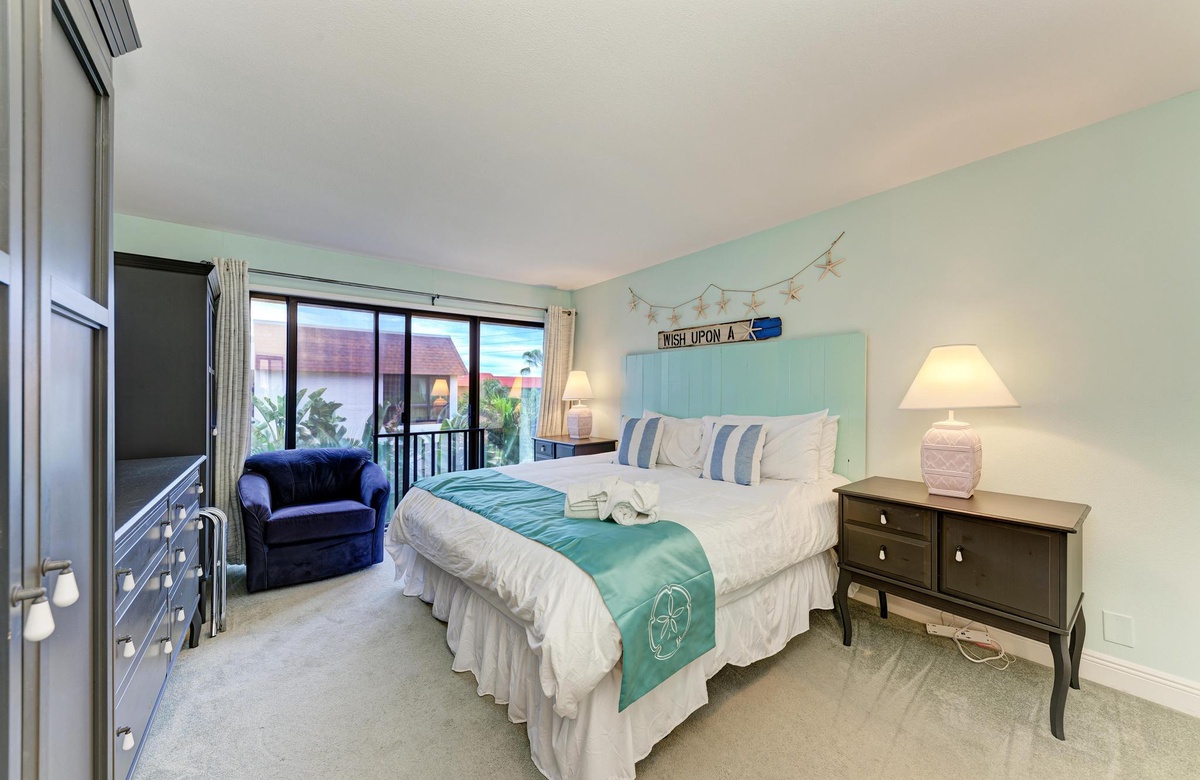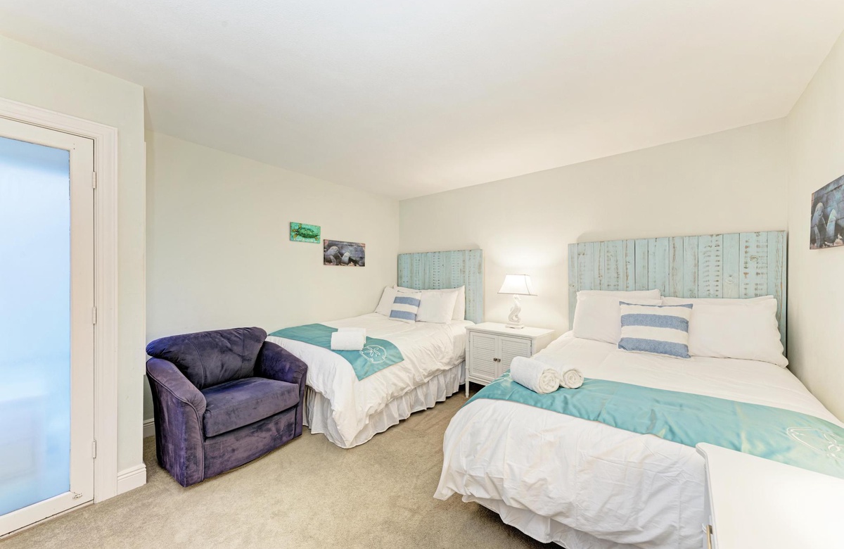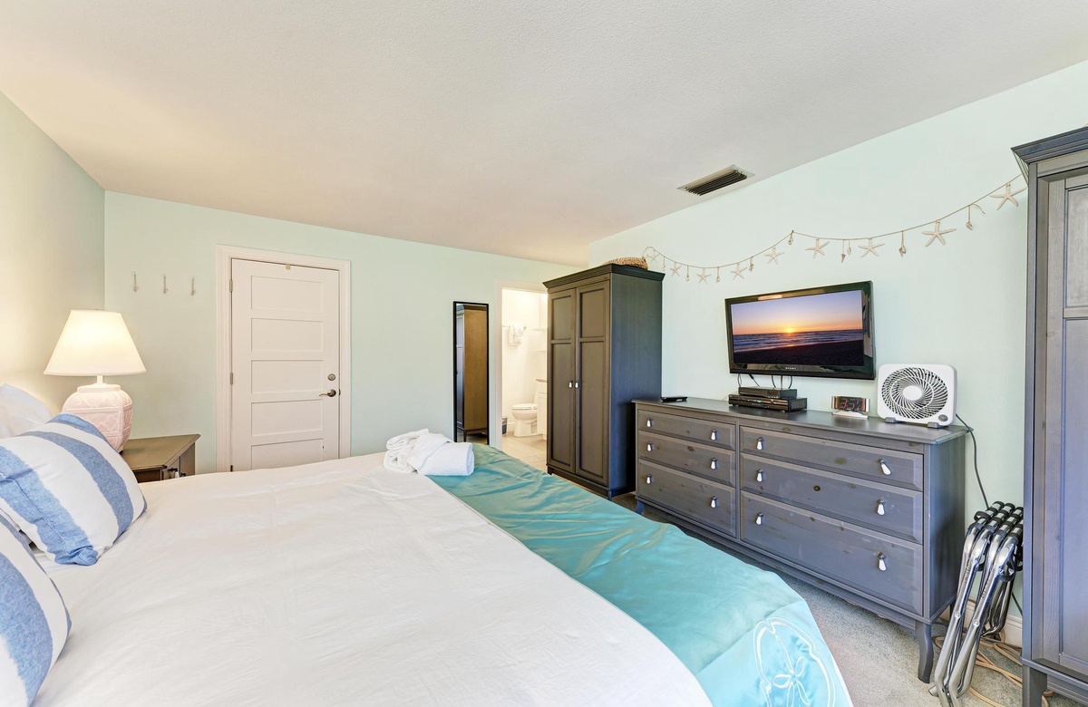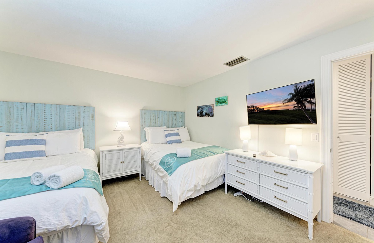 Das Hauptschlafzimmer ist in kühlen, beruhigenden Blautönen dekoriert und tropisch inspiriert, damit Sie sich wie im Urlaubsparadies fühlen. Dieses Zimmer mit Kingsize-Bett hat wunderbares natürliches Licht, einen Flachbild-TV und das Hauptbad ist mit einer Wannen-/Duschkombination ausgestattet. Im zweiten Schlafzimmer finden sich zwei große Einzelbetten, in dem die Kinder oder auch Gäste gern kuscheln werden.