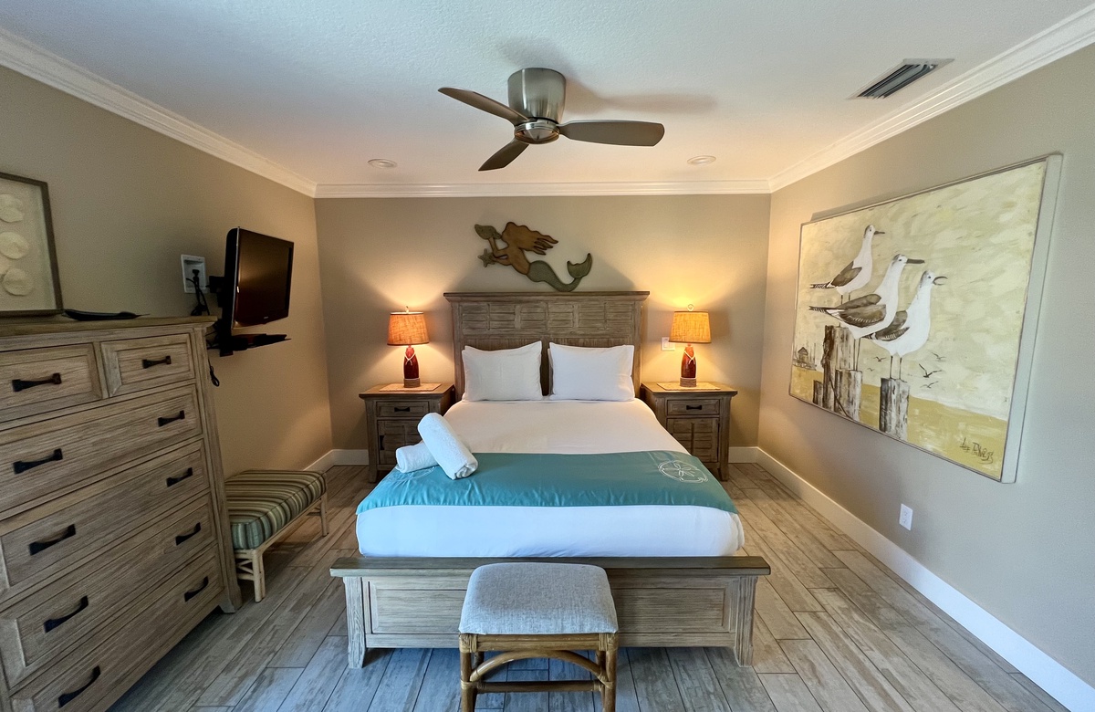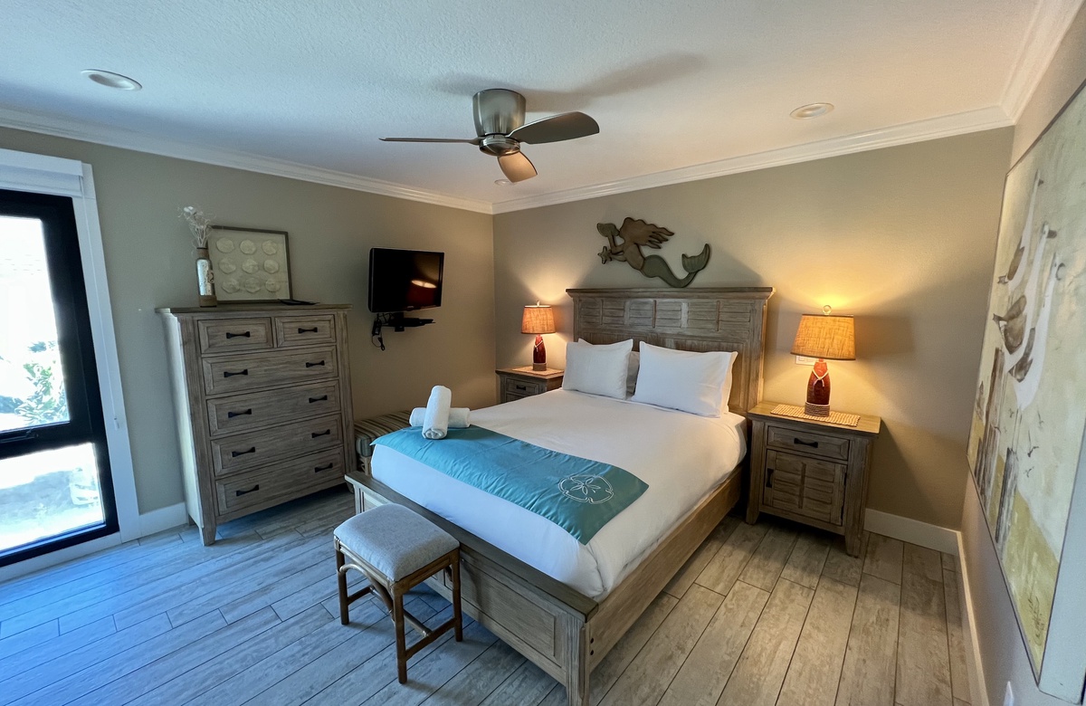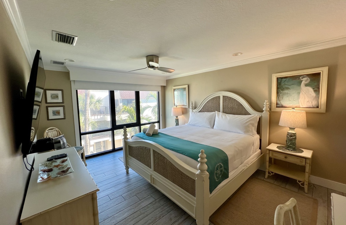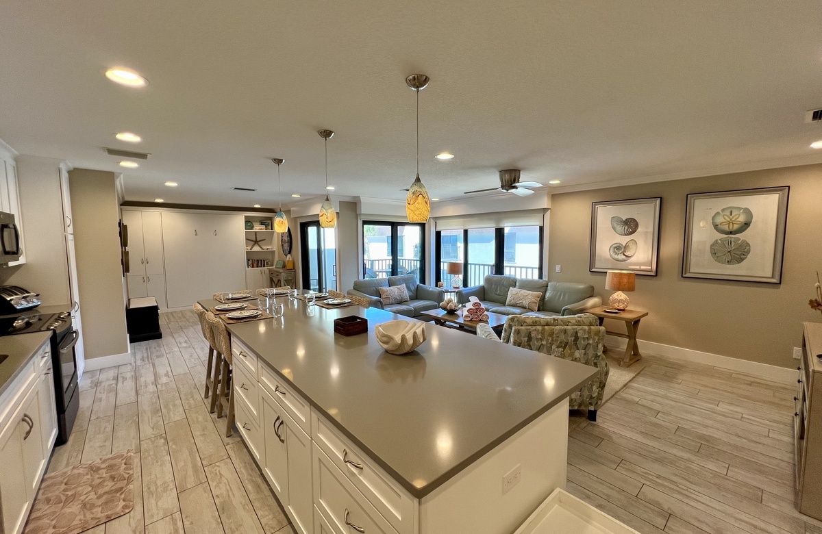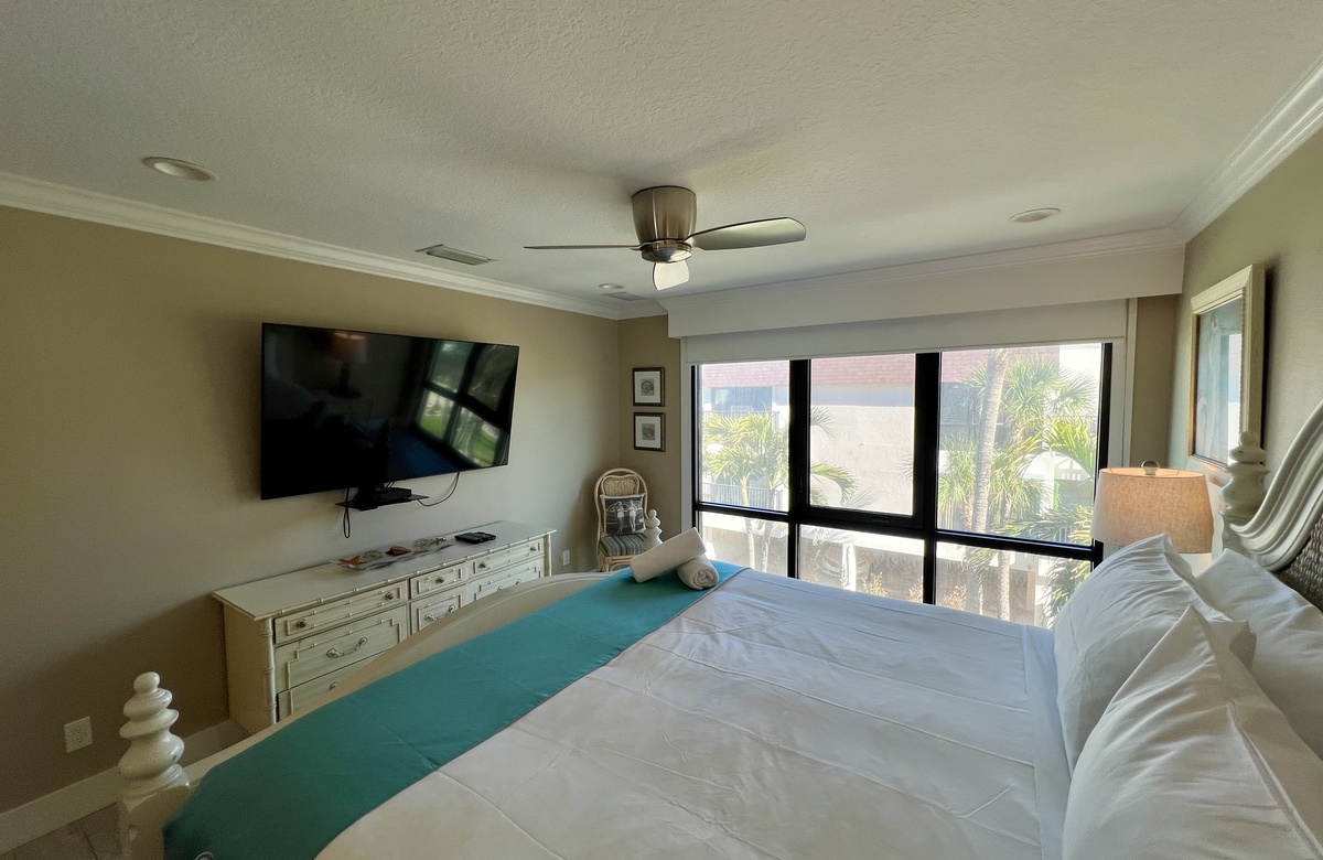 Das Apartment liegt in Holmes Beach im 1. Stock und verfügt über 2 Schlafzimmer und 2 Bäder. Hier wohnen bequem bis zu 6 Personen. Das Hauptschlafzimmer verwöhnt mit einem großen Doppelbett (King) und einem en-Suite-Bad mit einer begehbaren Dusche. Das zweite Schlafzimmer ist mit einem Doppelbett (Queen) ausgestattet. Ein Schrankbett im hinteren Teil des Wohnbereichs bietet zusätzliche Schlafgelegenheiten. Alle Zimmer sind lichtdurchflutet und haben Blick auf den tropischen Garten bzw. Poolbereich und bieten Flachbild-TVs. Der offen gehaltene Grundriss und komplett ausgestattete Küche erleichtern das gemütliche Zusammensein.