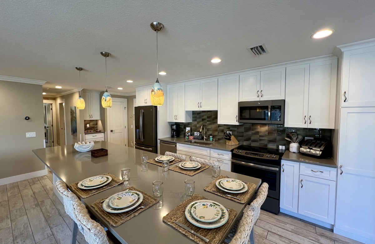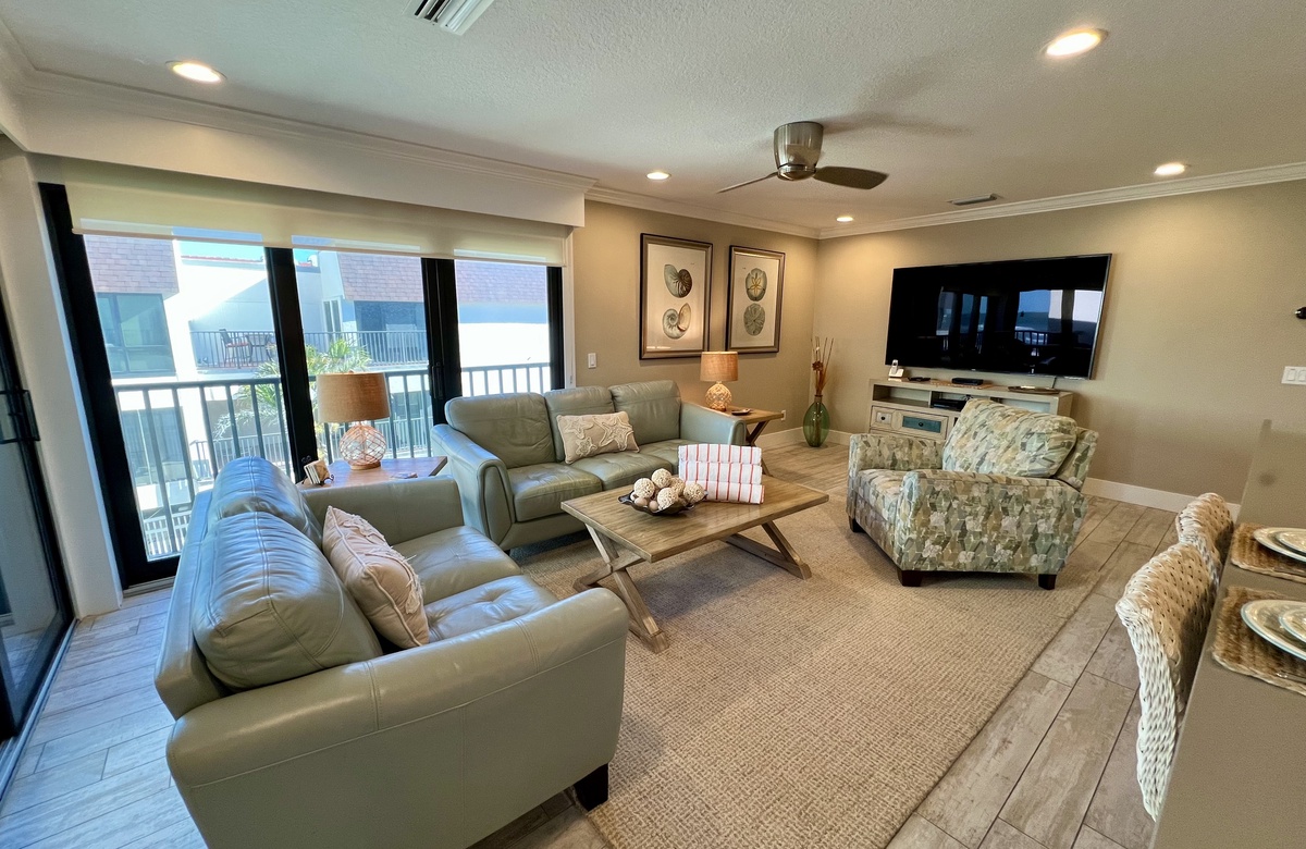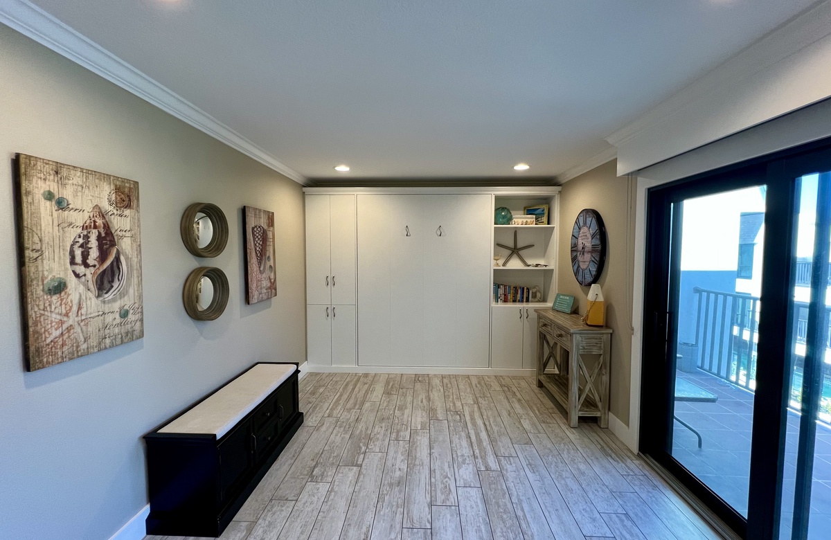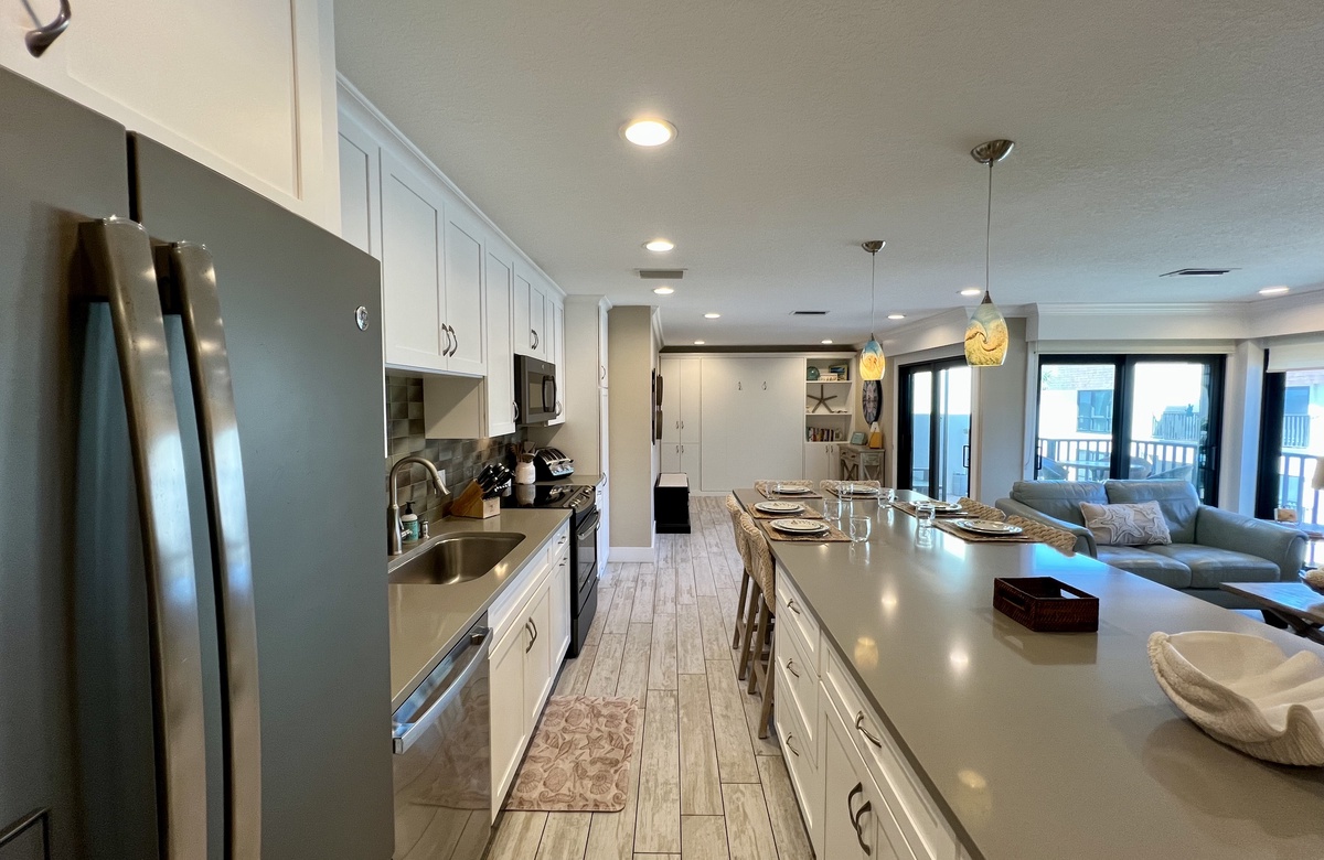 Das Apartment liegt in Holmes Beach im 1. Stock und verfügt über 2 Schlafzimmer und 2 Bäder. Hier wohnen bequem bis zu 6 Personen. Das Hauptschlafzimmer verwöhnt mit einem großen Doppelbett (King) und einem en-Suite-Bad mit einer begehbaren Dusche. Das zweite Schlafzimmer ist mit einem Doppelbett (Queen) ausgestattet. Ein Schrankbett im hinteren Teil des Wohnbereichs bietet zusätzliche Schlafgelegenheiten. Alle Zimmer sind lichtdurchflutet und haben Blick auf den tropischen Garten bzw. Poolbereich und bieten Flachbild-TVs. Der offen gehaltene Grundriss und komplett ausgestattete Küche erleichtern das gemütliche Zusammensein.