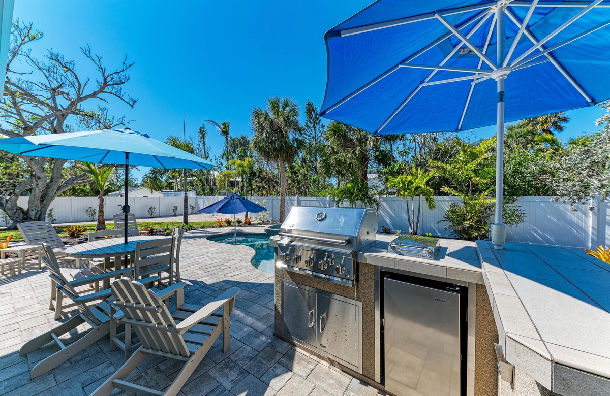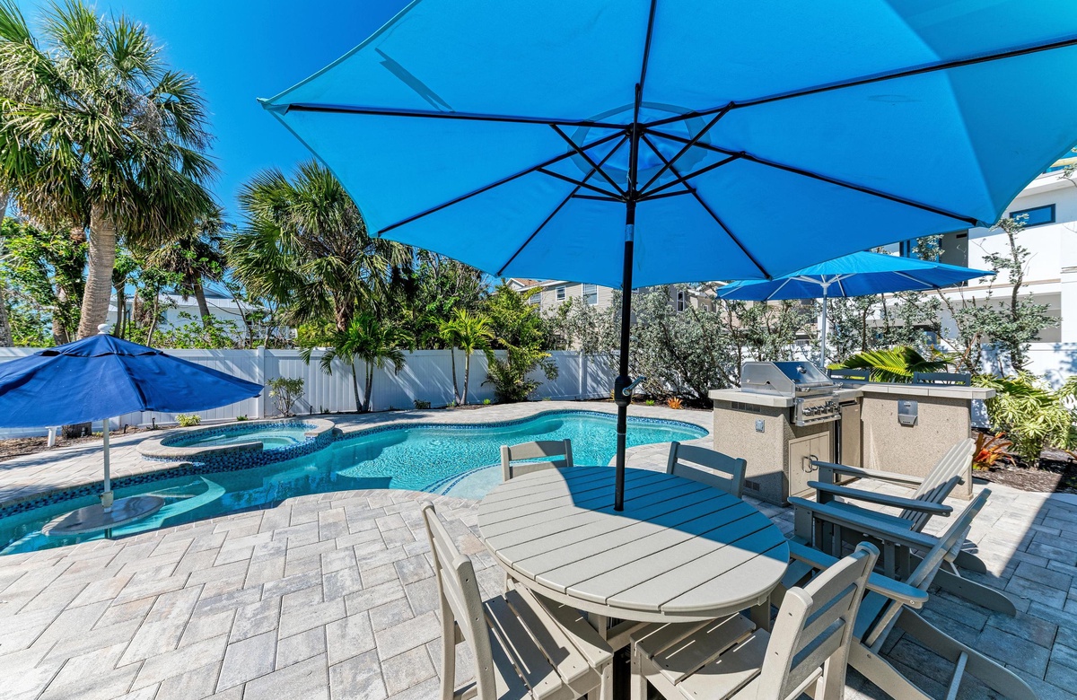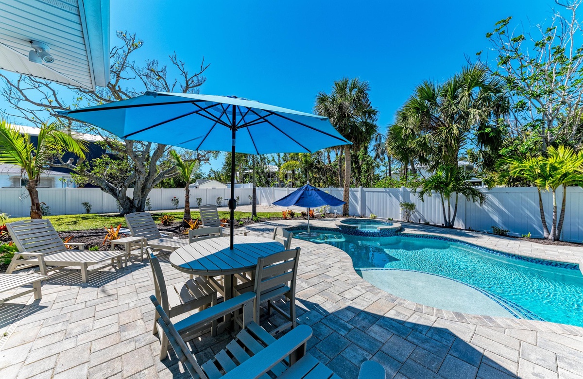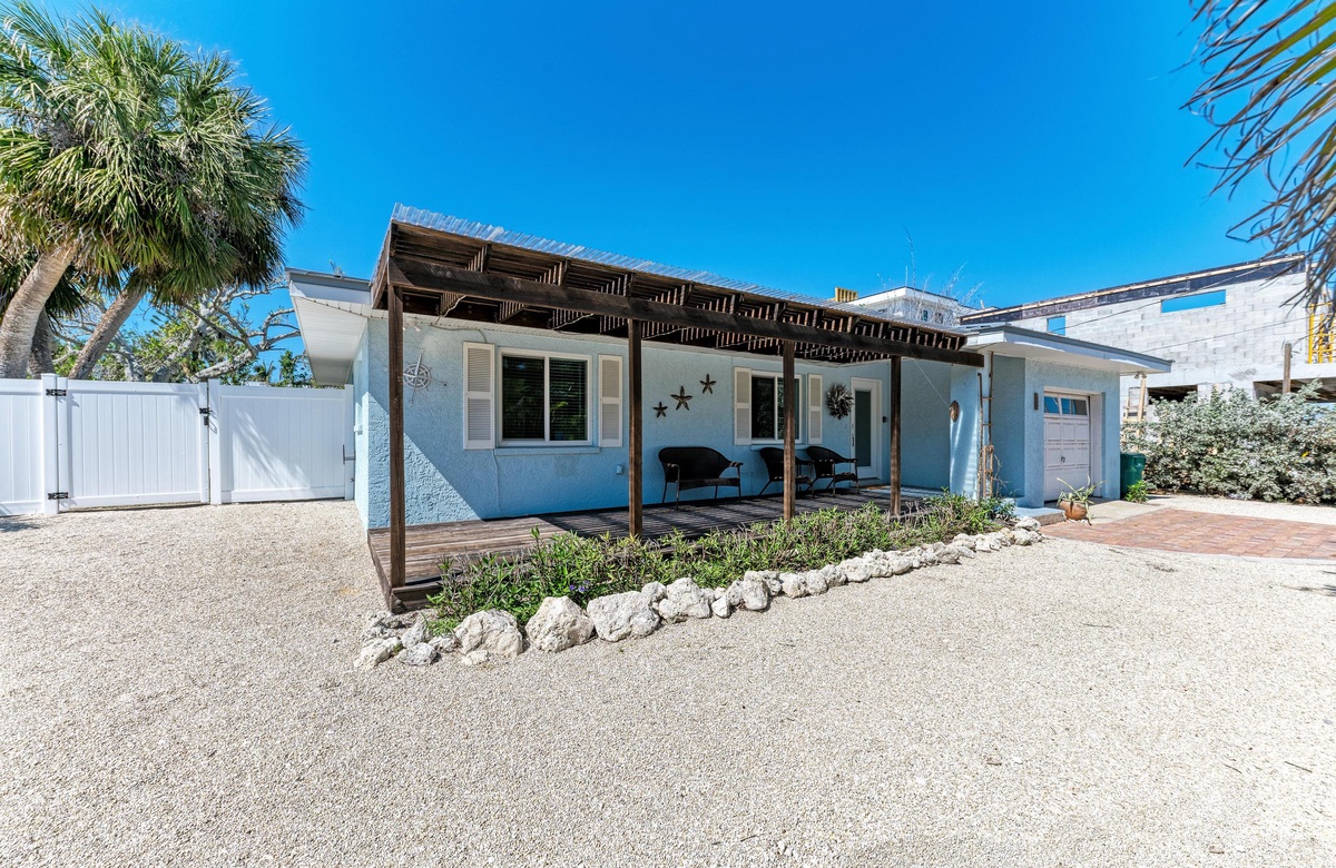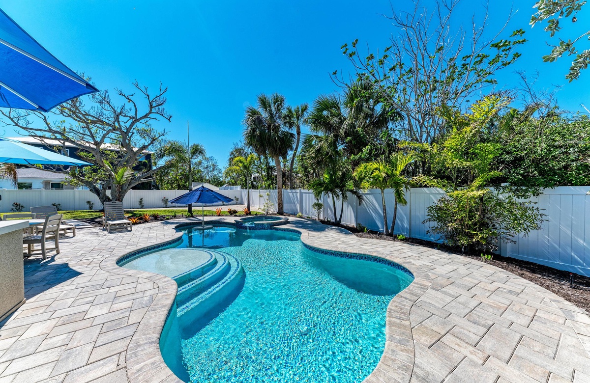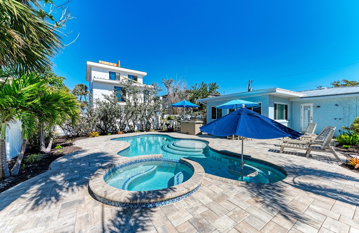 Der Garten von “Wave N' Sea” ist ein erholsamer Rückzugsort mit einem beheizten, privaten Pool. Genießen Sie die Sonne in den Terrassenliegen. Grillen Sie sich ein typisches amerikanisches T-Bone-Steak am Gasgrill. Dieses charmante Cottage bietet einen großartige, überdachte Terrasse im Pergola-Stil mit Sitzgelegenheiten, wo Sie sich in das alte Florida zurückversetzt fühlen und die Inselbrise genießen. Nachdem Sie vom Strand zurückkehren, waschen Sie sich den Sand an der Außendusche im Garten ab. Dieses Haus hat Parkplätze für 2 Fahrzeuge.